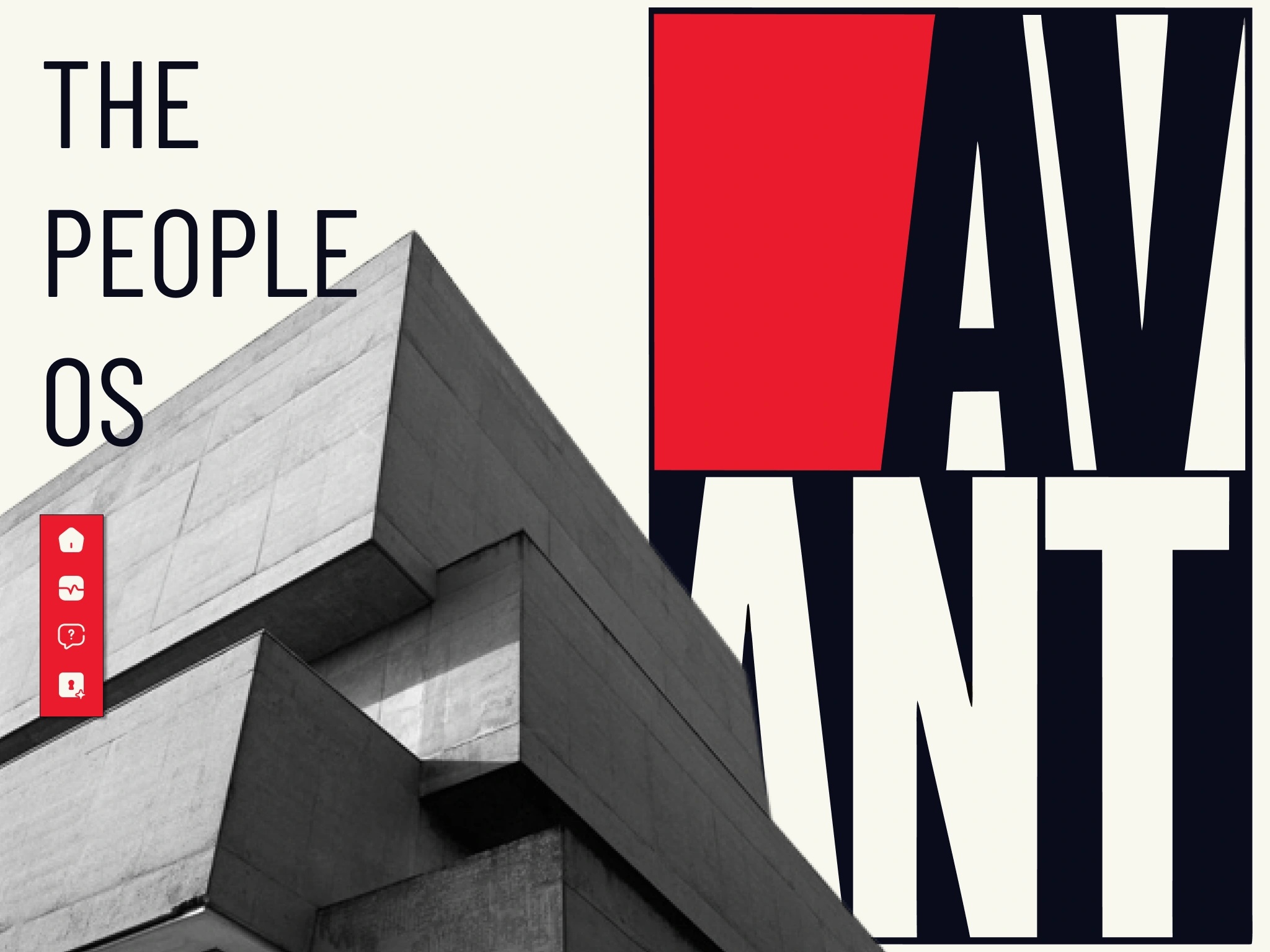 The site opens with a split composition: large-format Barlow Condensed display type on the left against the cream field, a duotone architectural photograph on the right - brutalist concrete geometry color-graded to deep charcoal and red. The hero copy reads "THE PEOPLE OS" at maximum scale, three lines, tracked tight. The product UI section below uses the same black/cream/red palette in the interface itself - the sidebar navigation in full black with condensed all-caps labels, the data panels in cream stock, the alert states in red only. The UI does not switch aesthetic registers from the brand. It is the same system at a different scale.