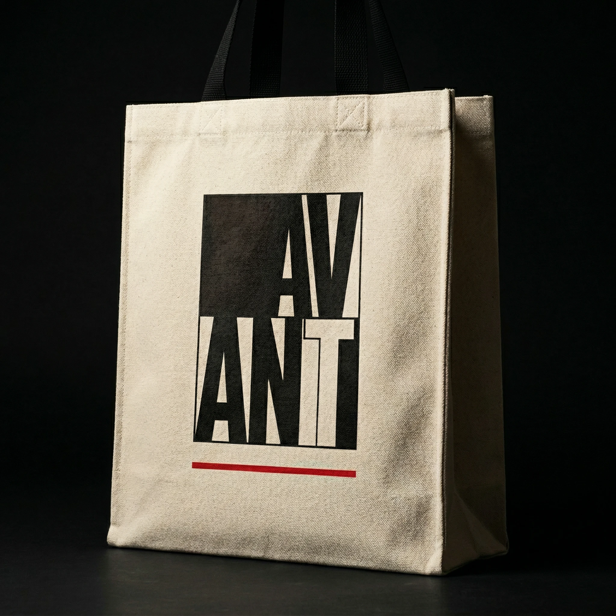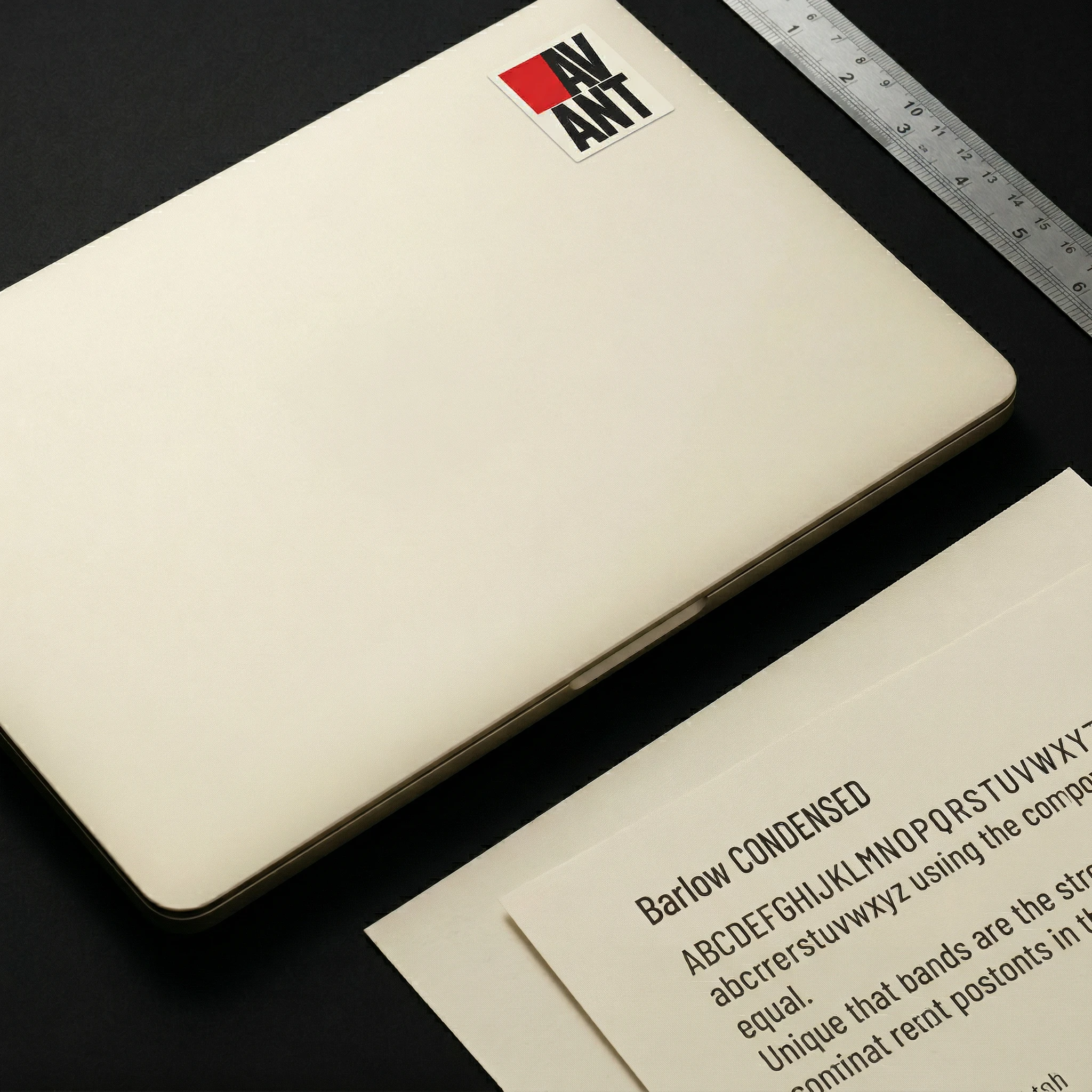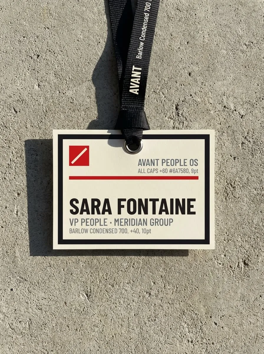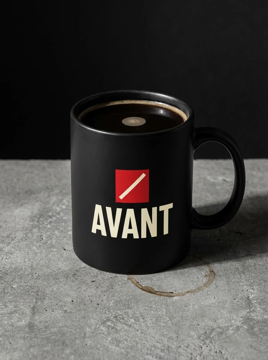 The business card runs the system at its smallest scale - compact logo top-left on cream stock, a single #CC1010 rule at the bottom edge, nothing else. The back is full matte black with the micro logo centered. The conference badge uses the micro mark at 18mm, the name at 28pt Barlow Condensed 900 - it reads from across a room. The hoodie carries the compact logo on the left chest at 65mm, matte screen-print on dark charcoal. The ceramic mug is the micro mark stacked over the AVANT wordmark in cream against matte black. Every object is the same system. None of them needed a new design decision.