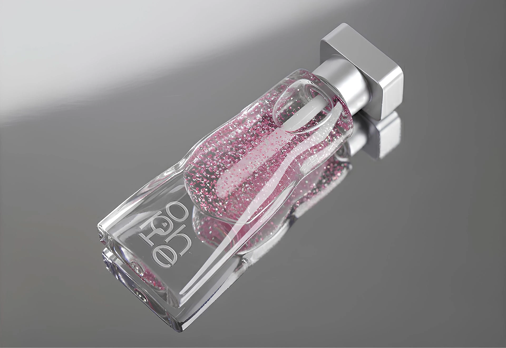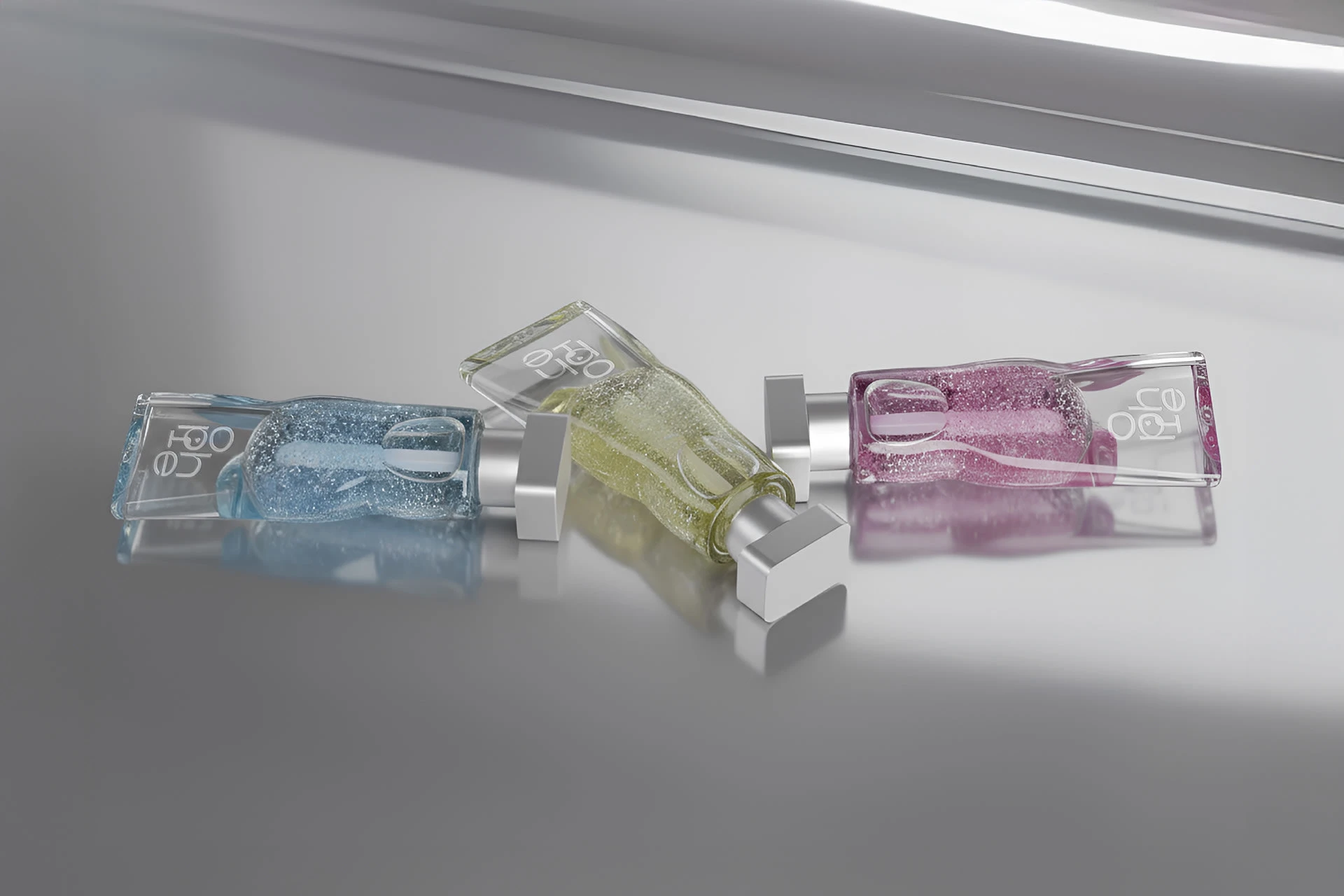 The bottle design explores fluidity and transparency, emphasizing the micro-encapsulated particles suspended in the formula. This visual texture became a central element in the concept: the transparency of the glass and the reflective surfaces work together to highlight the product’s formula while maintaining a sense of luxury.