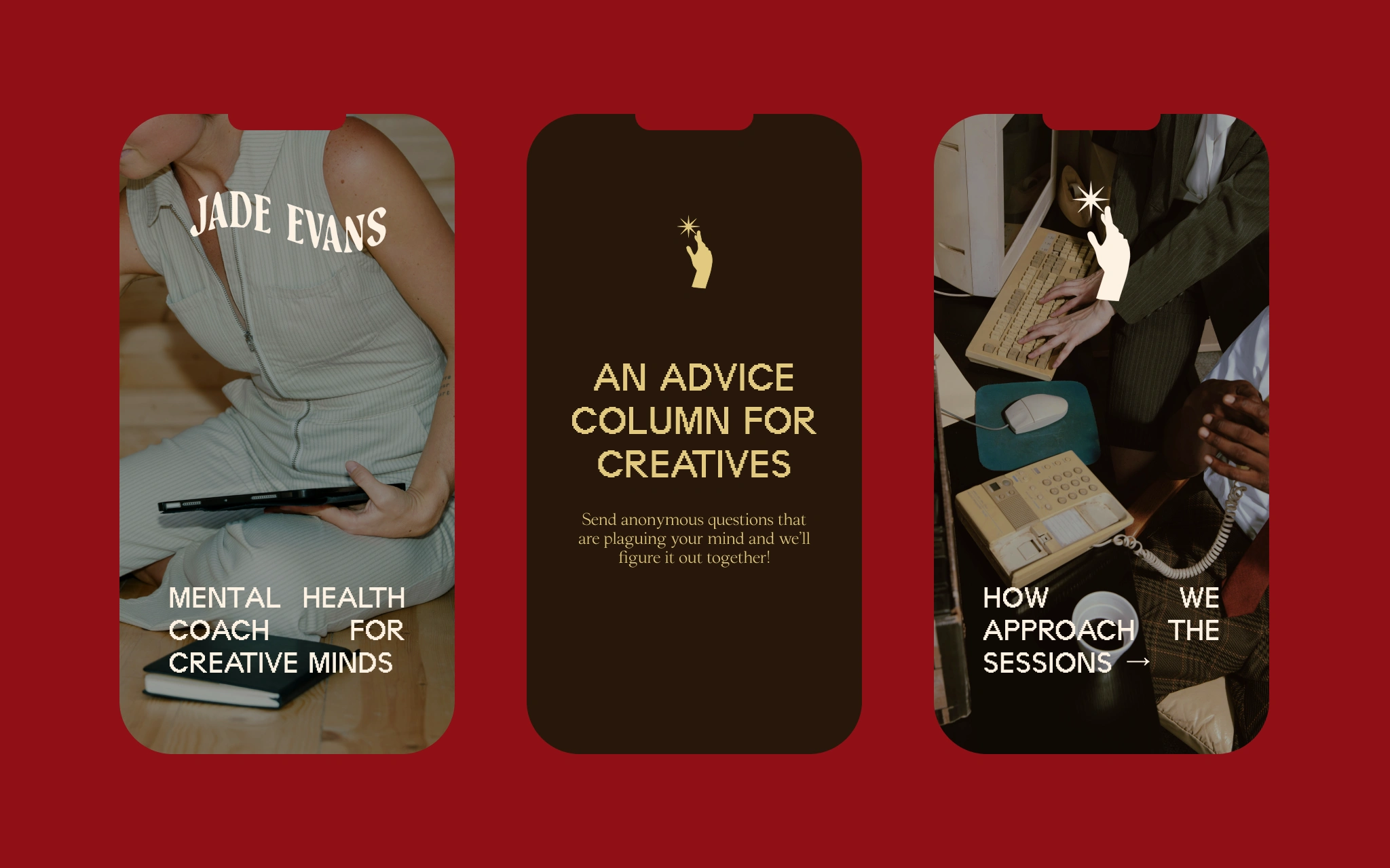 Brand identity design for a mental health coach that feels approachable but thoughtful. The brand direction is editorial, vibrant with a retro corporate vibe. The goal was to balance the professional aspect with a friendly side of the branding while keeping it modern.