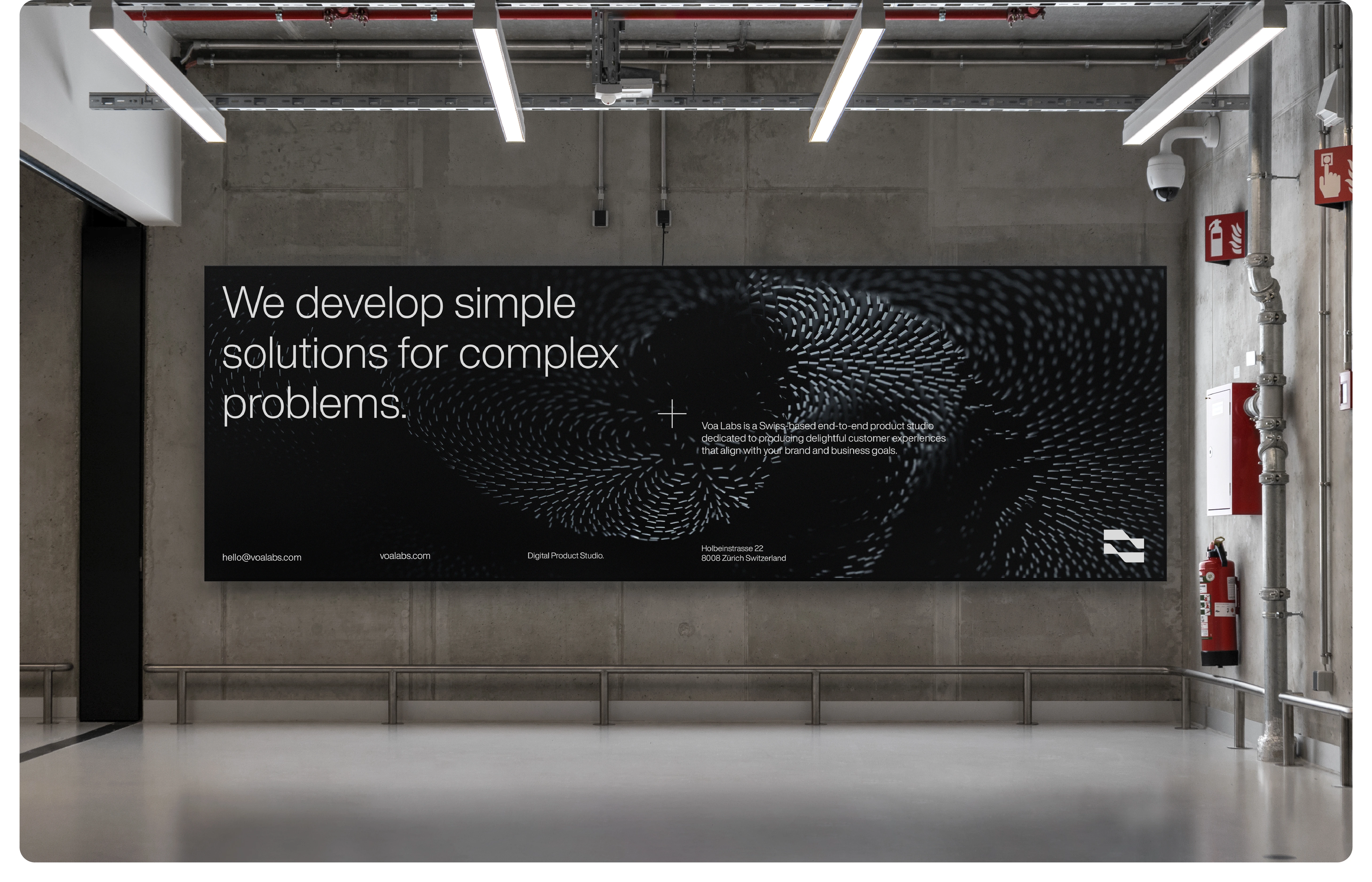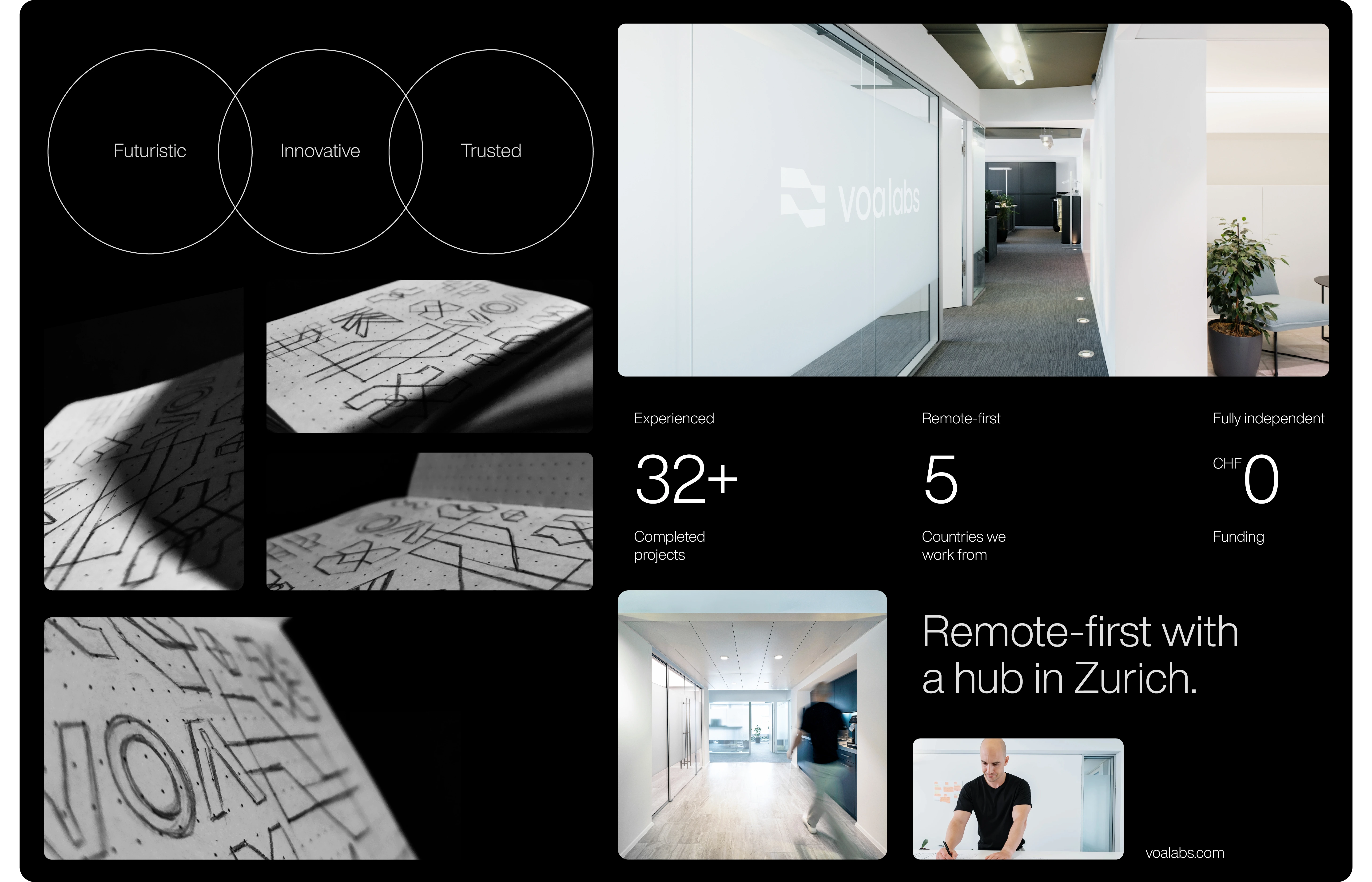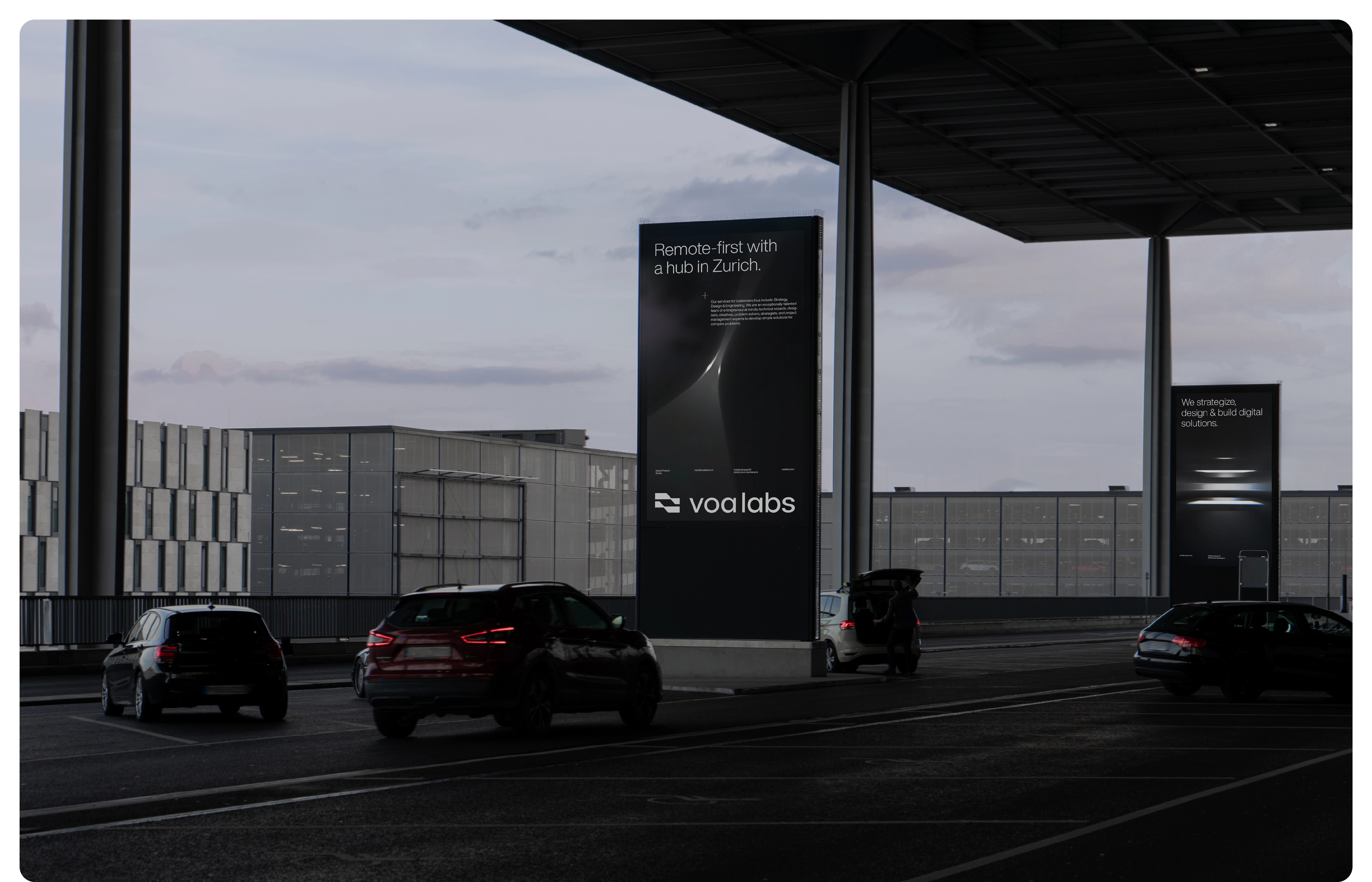 The core of this design revolves around a distinctive symbol, technology and constant movement, incorporating shapes such as < Voa> which means street in Romansh, a language spoken in the mountainous regions of Switzerland, and <Labs> means laboratories and was chosen because Voa Labs solutions are often innovative and experimental.