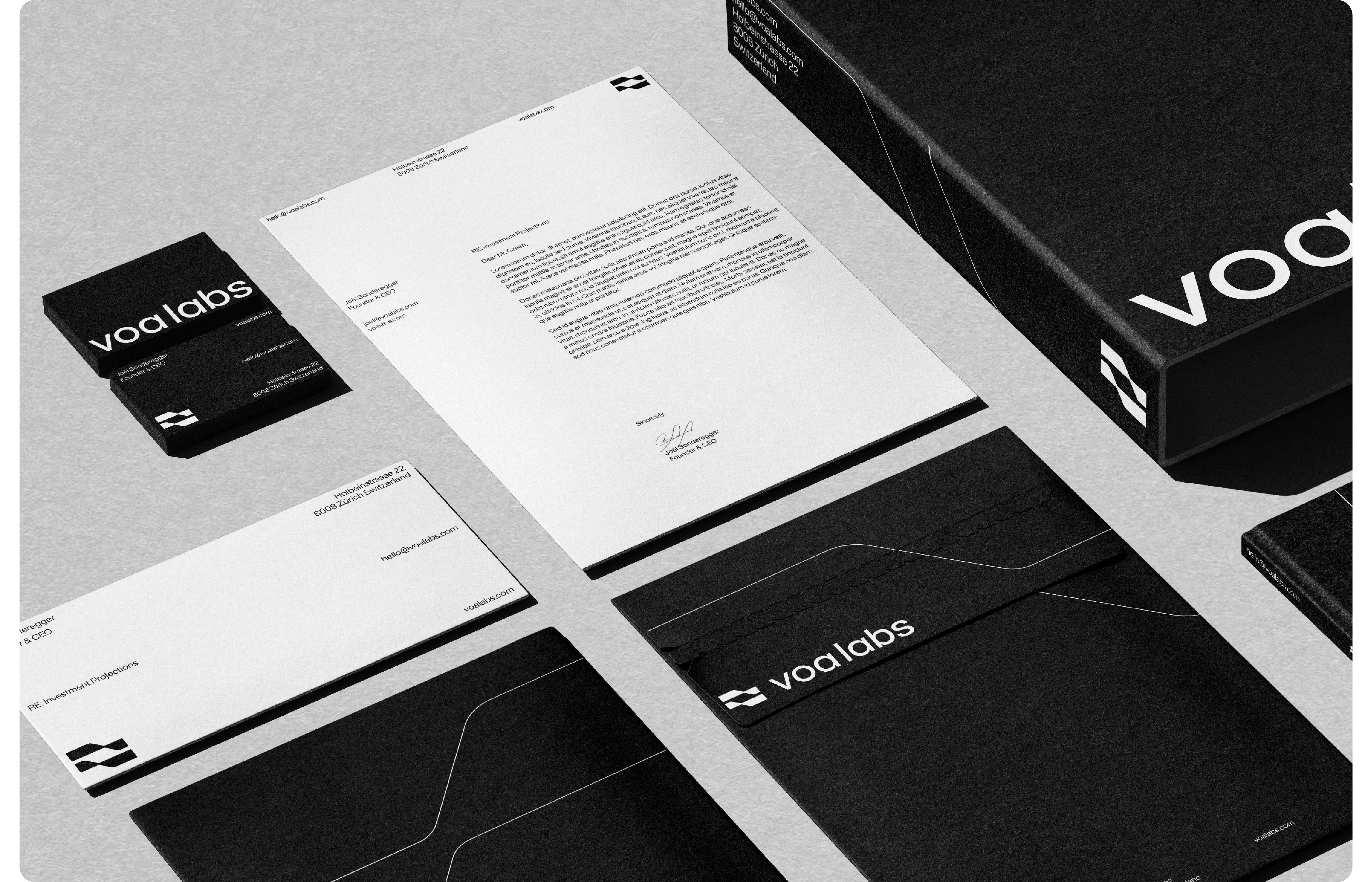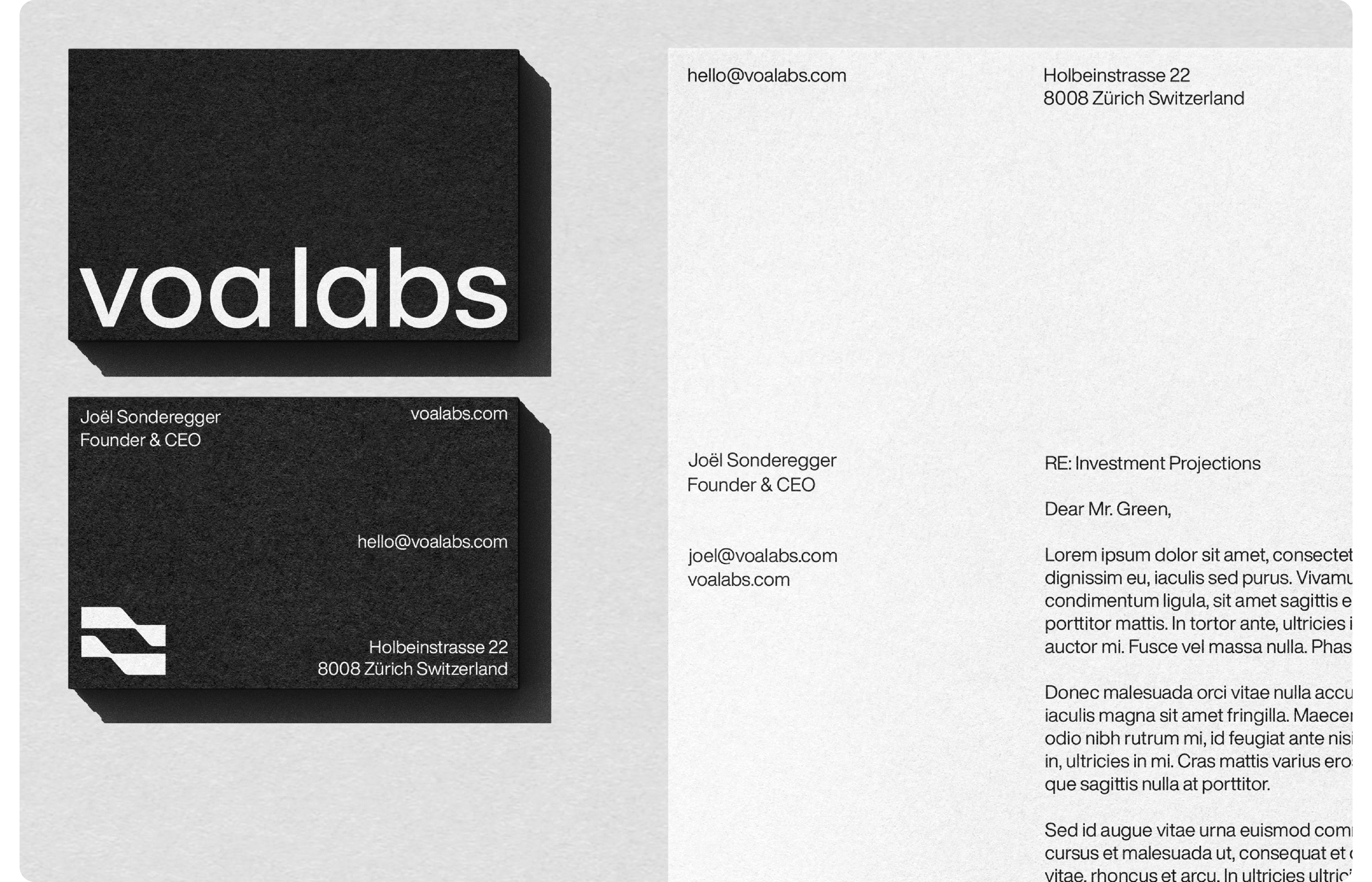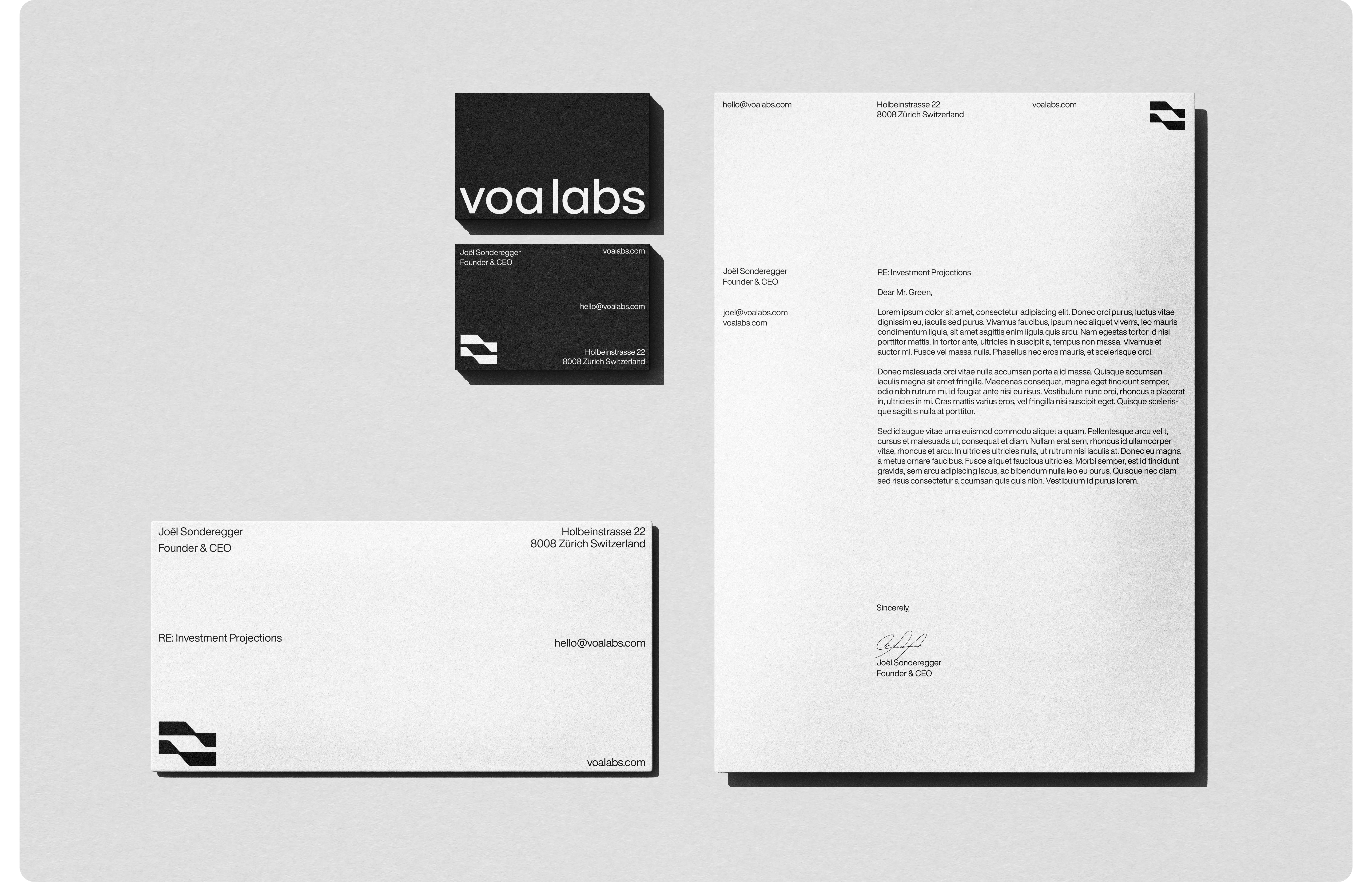 The core of this design revolves around a distinctive symbol, technology and constant movement, incorporating shapes such as < Voa> which means street in Romansh, a language spoken in the mountainous regions of Switzerland, and <Labs> means laboratories and was chosen because Voa Labs solutions are often innovative and experimental.
