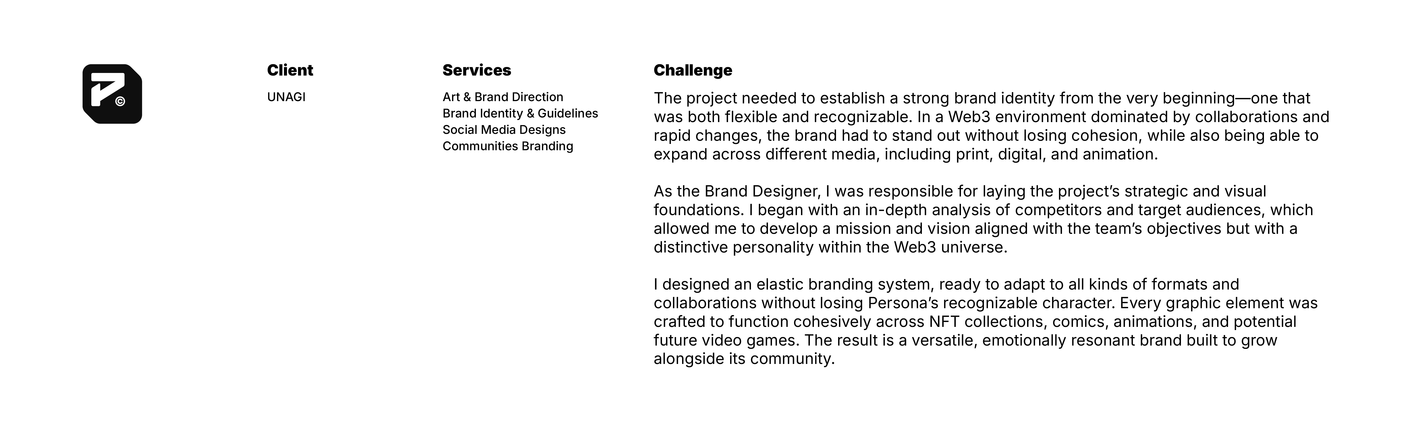 Created a flexible, cohesive Web3 brand from scratch—scalable across NFTs, comics, and games—rooted in strategy, personality, and community growth.