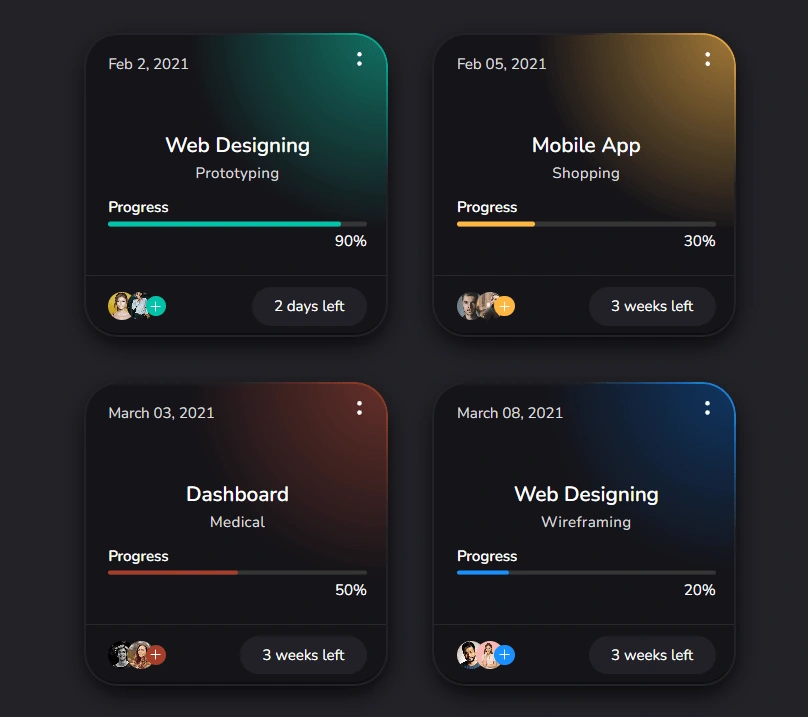 Presents task progress, deadlines, & team involvement. Each card highlights a project with dynamic color coding, real-time progress bars, & time left indicators