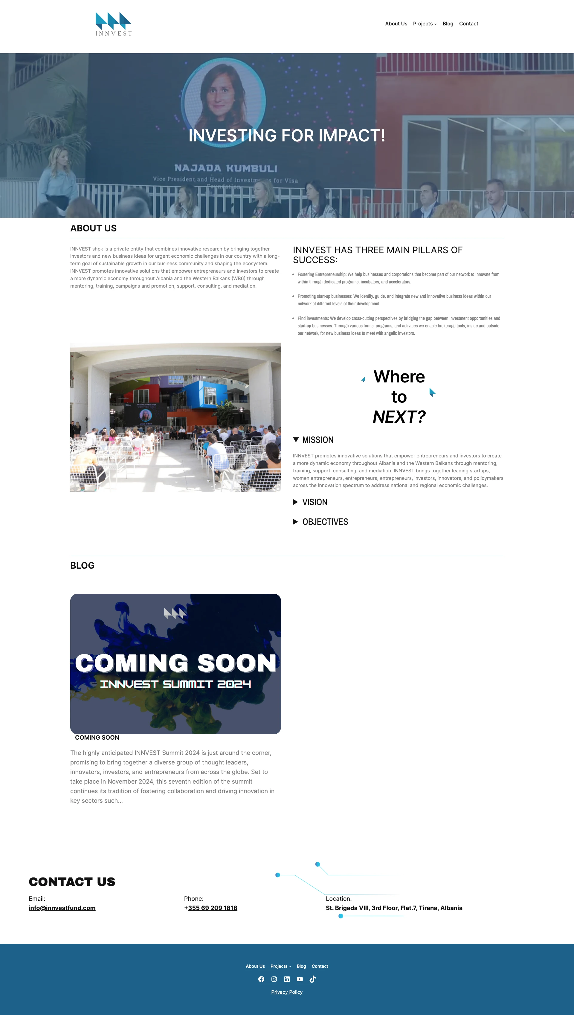 Company Overview & Pillars: Implemented sections detailing "ABOUT US," "INNVEST HAS THREE MAIN PILLARS OF SUCCESS," and "Where to NEXT?" (including Mission, Vision, and Objectives) to clearly articulate the company's identity and goals.