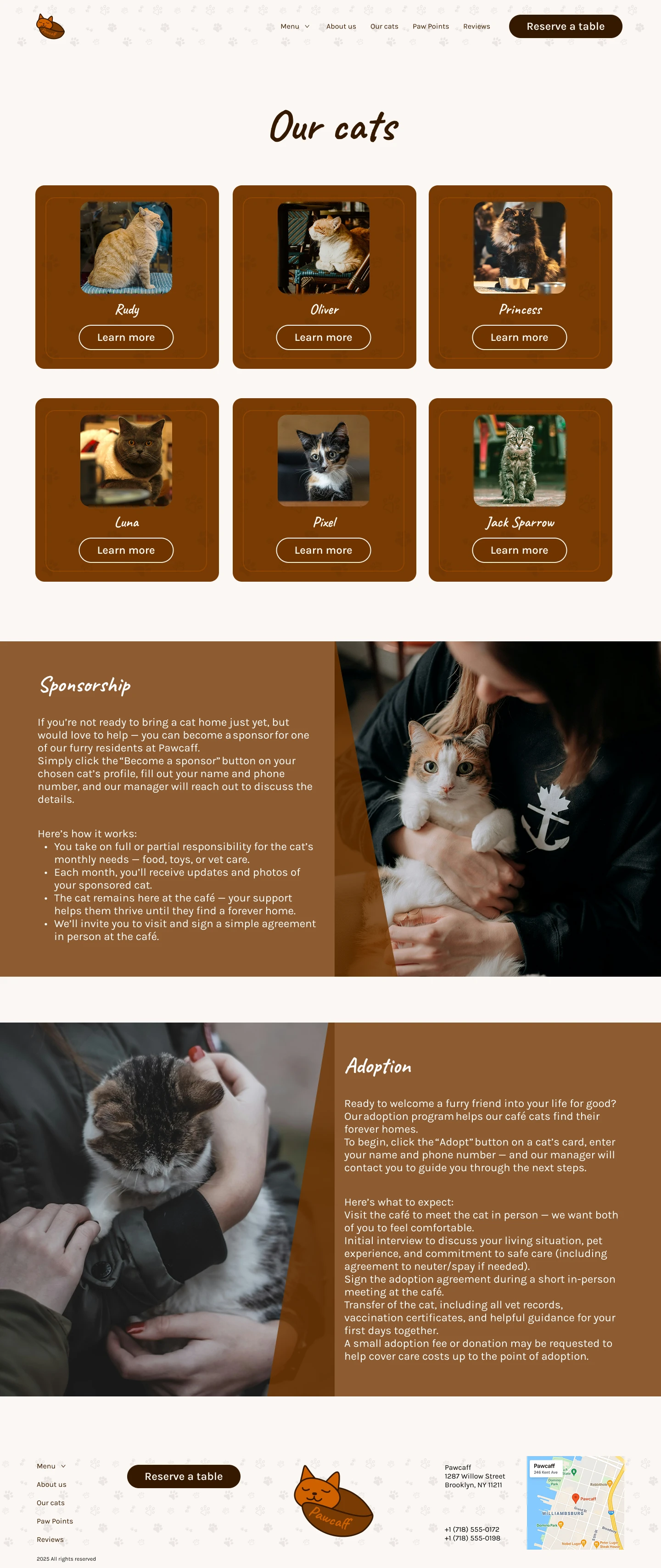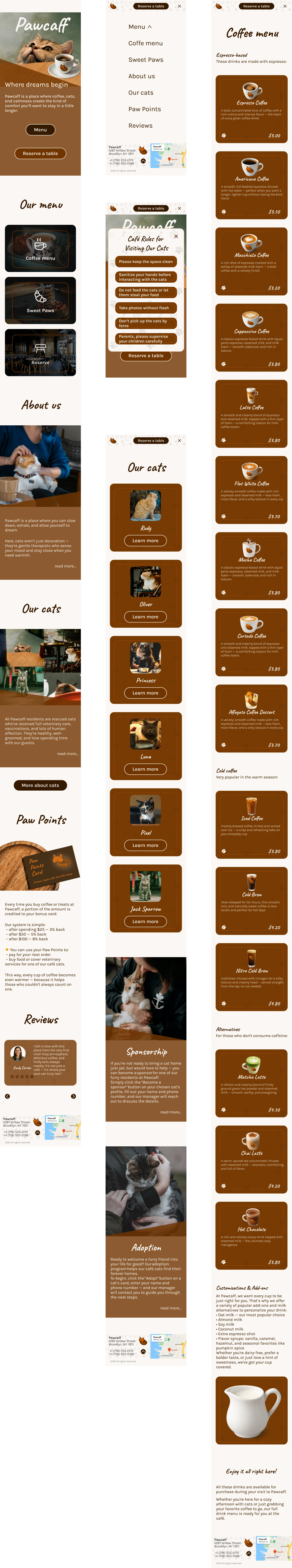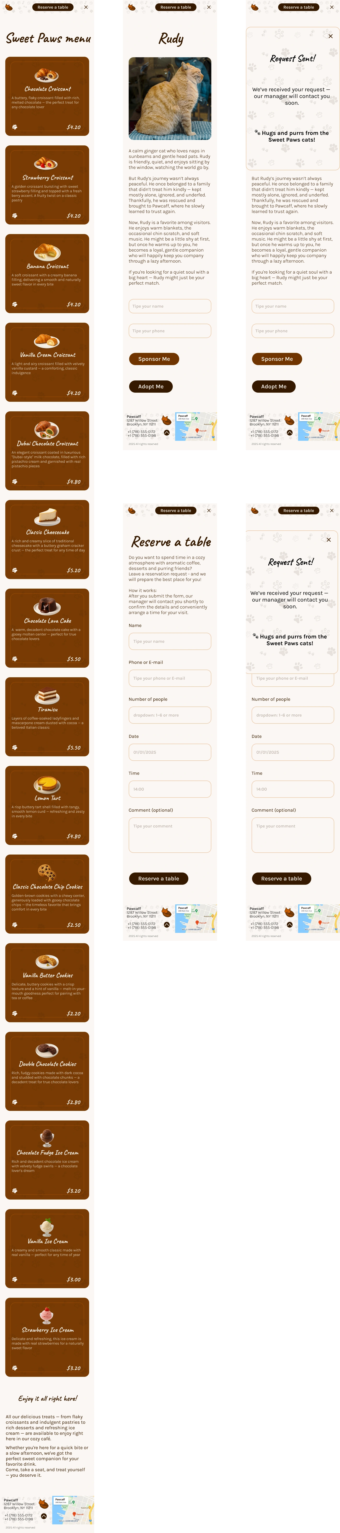 The desktop version offers a cozy and immersive browsing experience, combining large visuals, emotional storytelling, and a well-structured layout. Intuitive navigation, expressive typography, and detailed content sections (menu, cat bios, loyalty program, and adoption stories) help users explore the café’s atmosphere from their screens. Focused on accessibility and engagement.