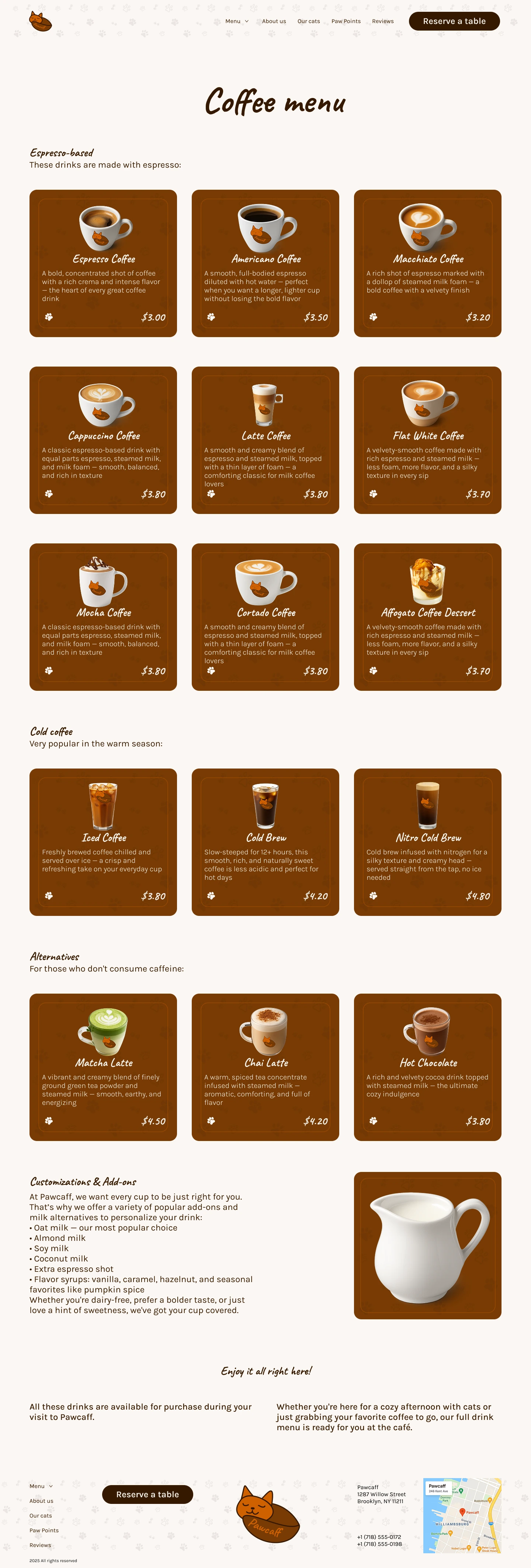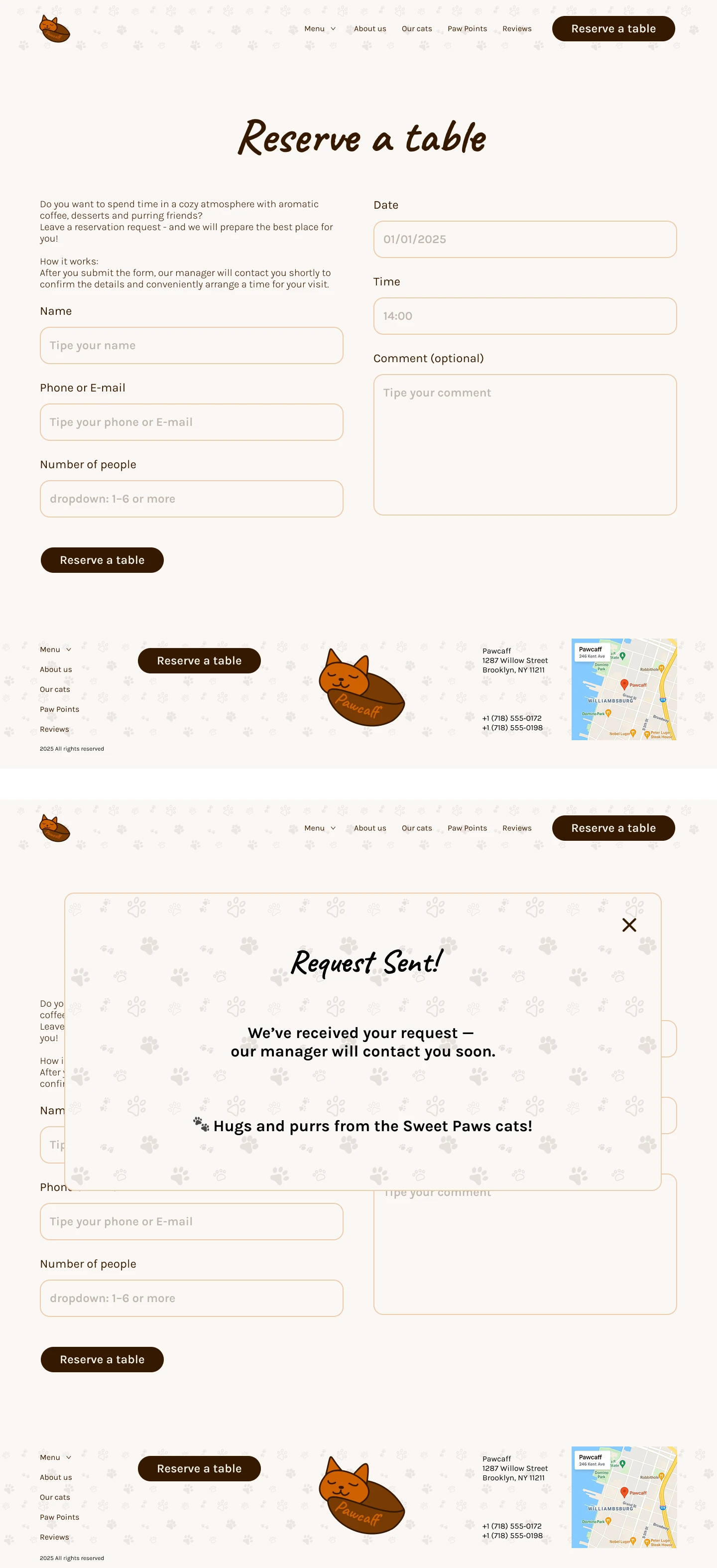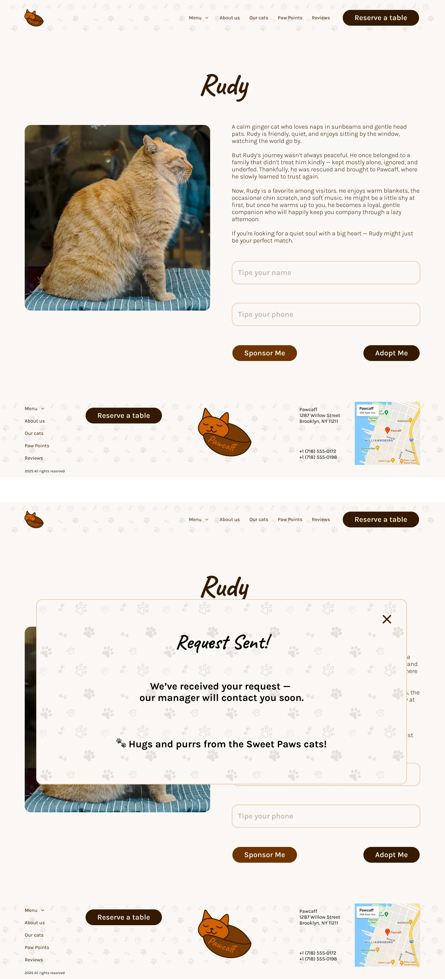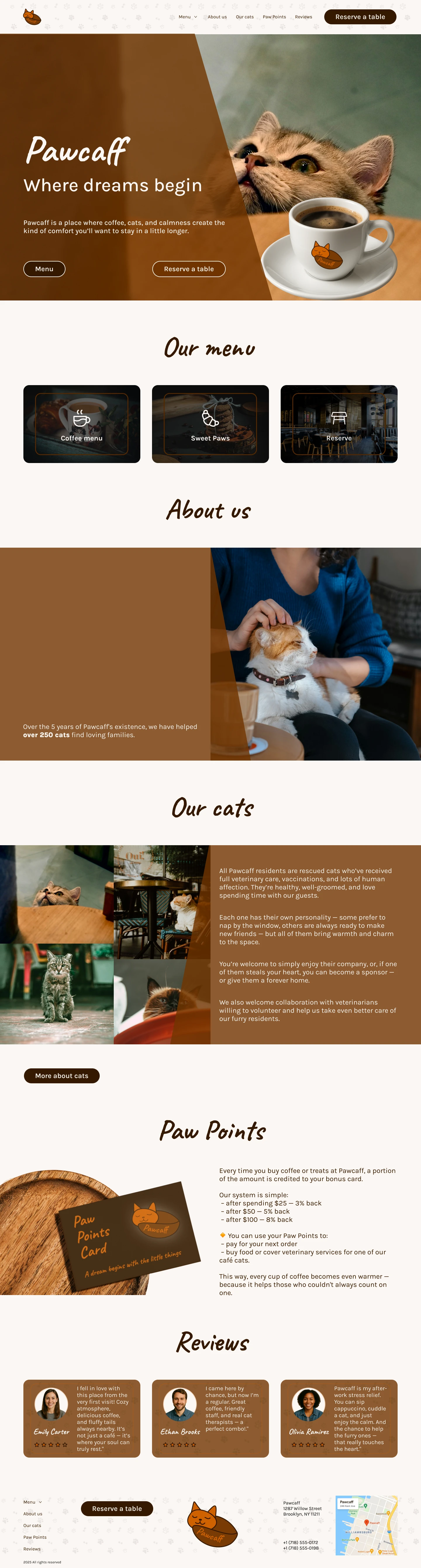 The desktop version offers a cozy and immersive browsing experience, combining large visuals, emotional storytelling, and a well-structured layout. Intuitive navigation, expressive typography, and detailed content sections (menu, cat bios, loyalty program, and adoption stories) help users explore the café’s atmosphere from their screens. Focused on accessibility and engagement.