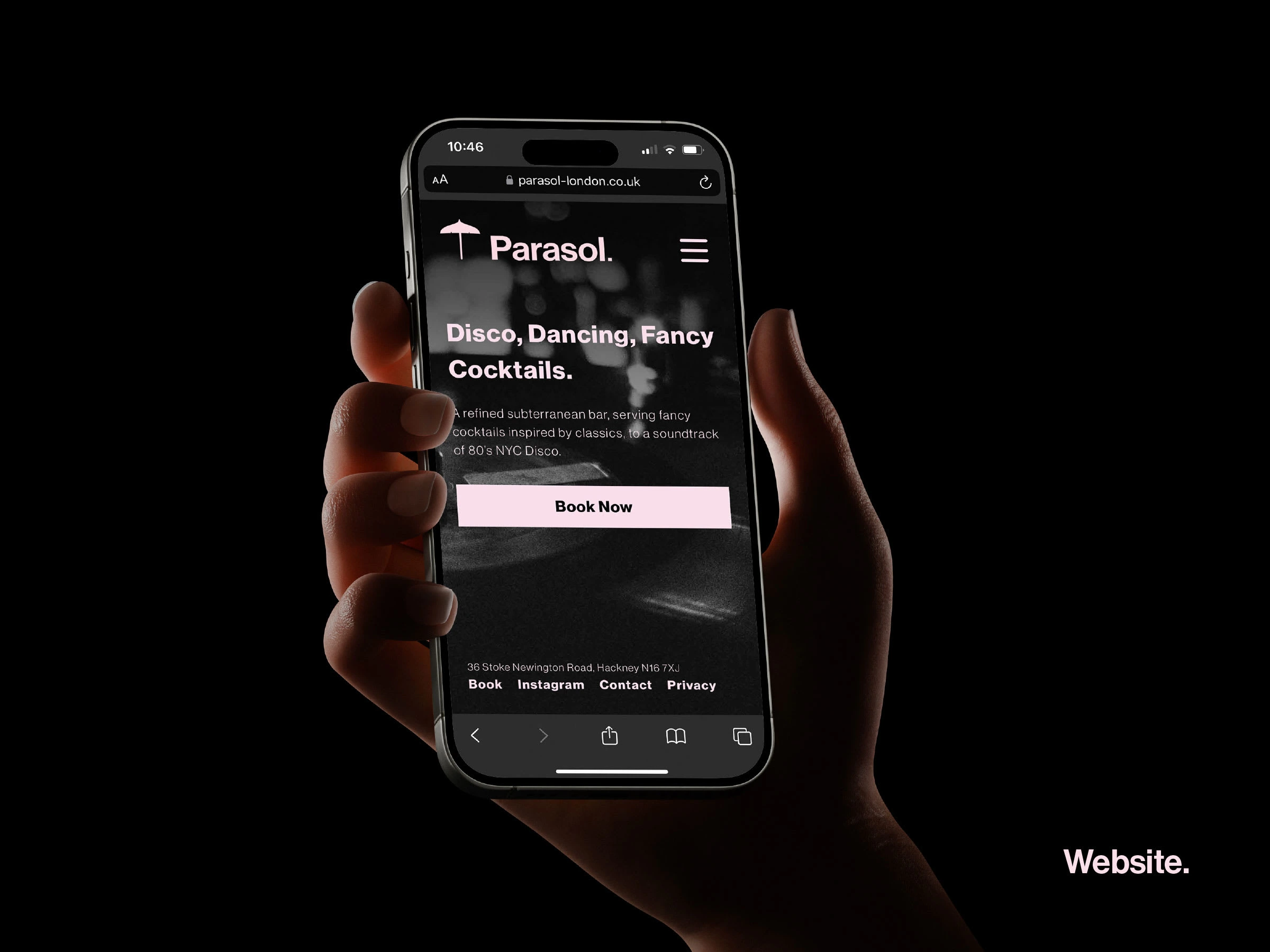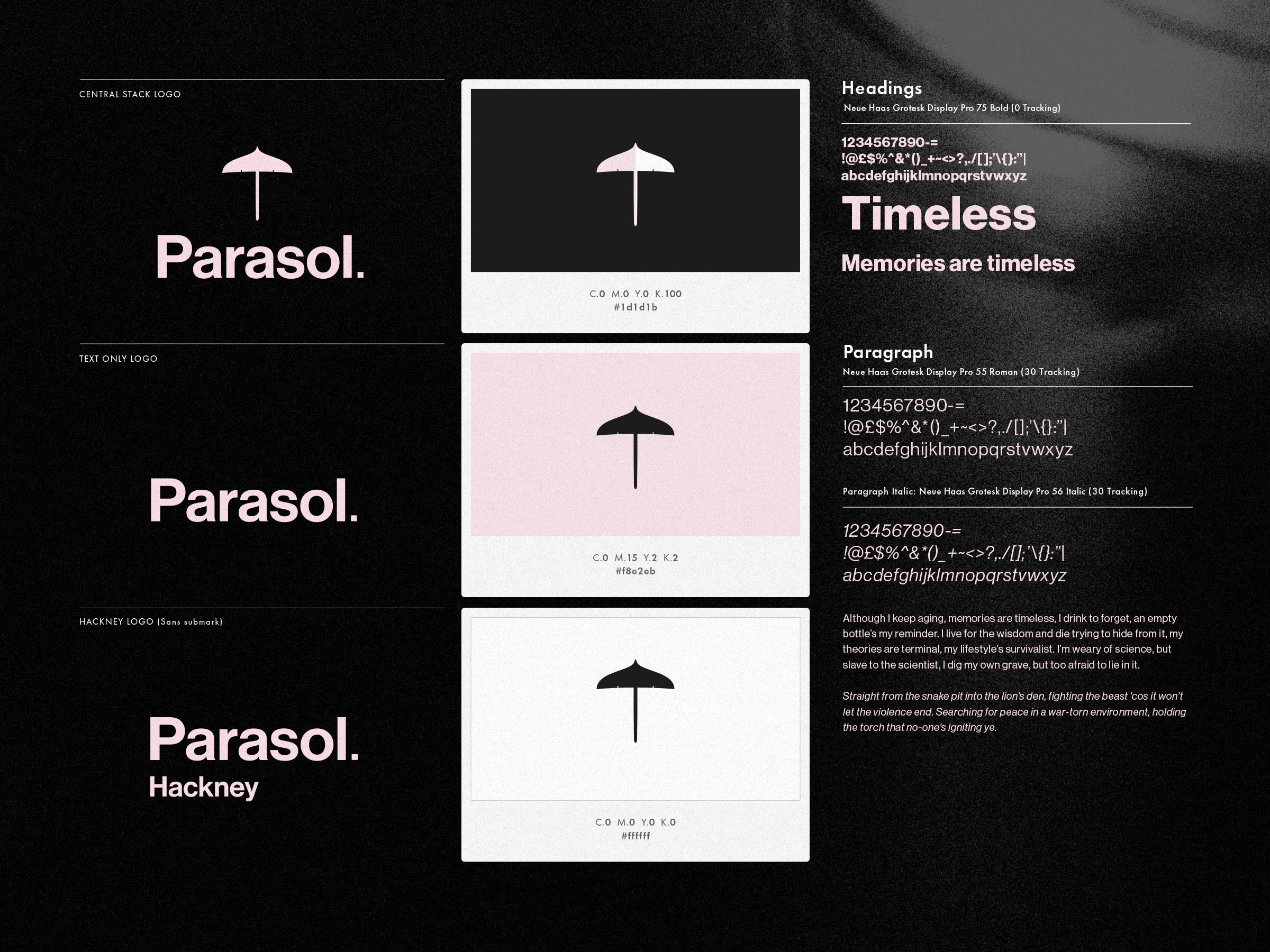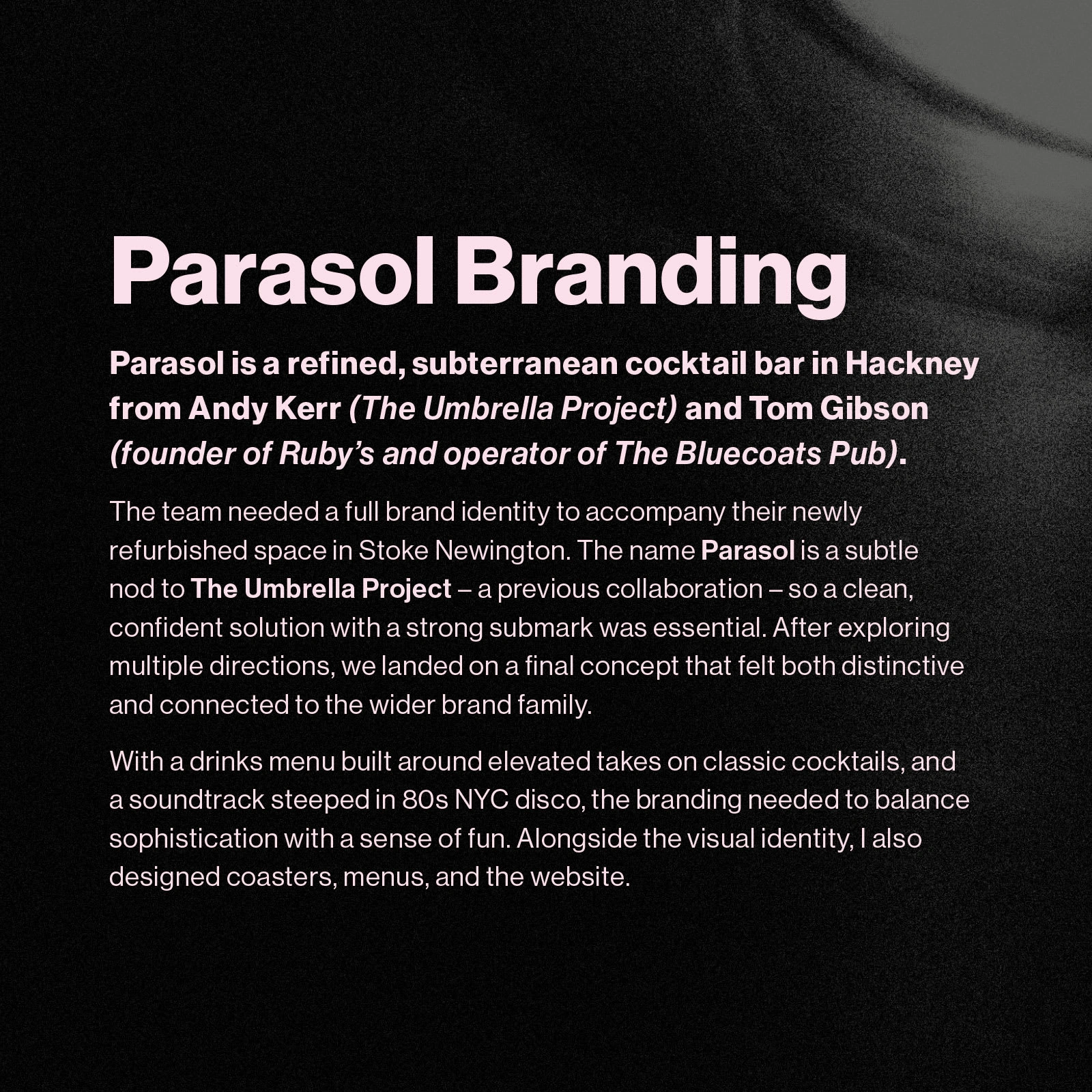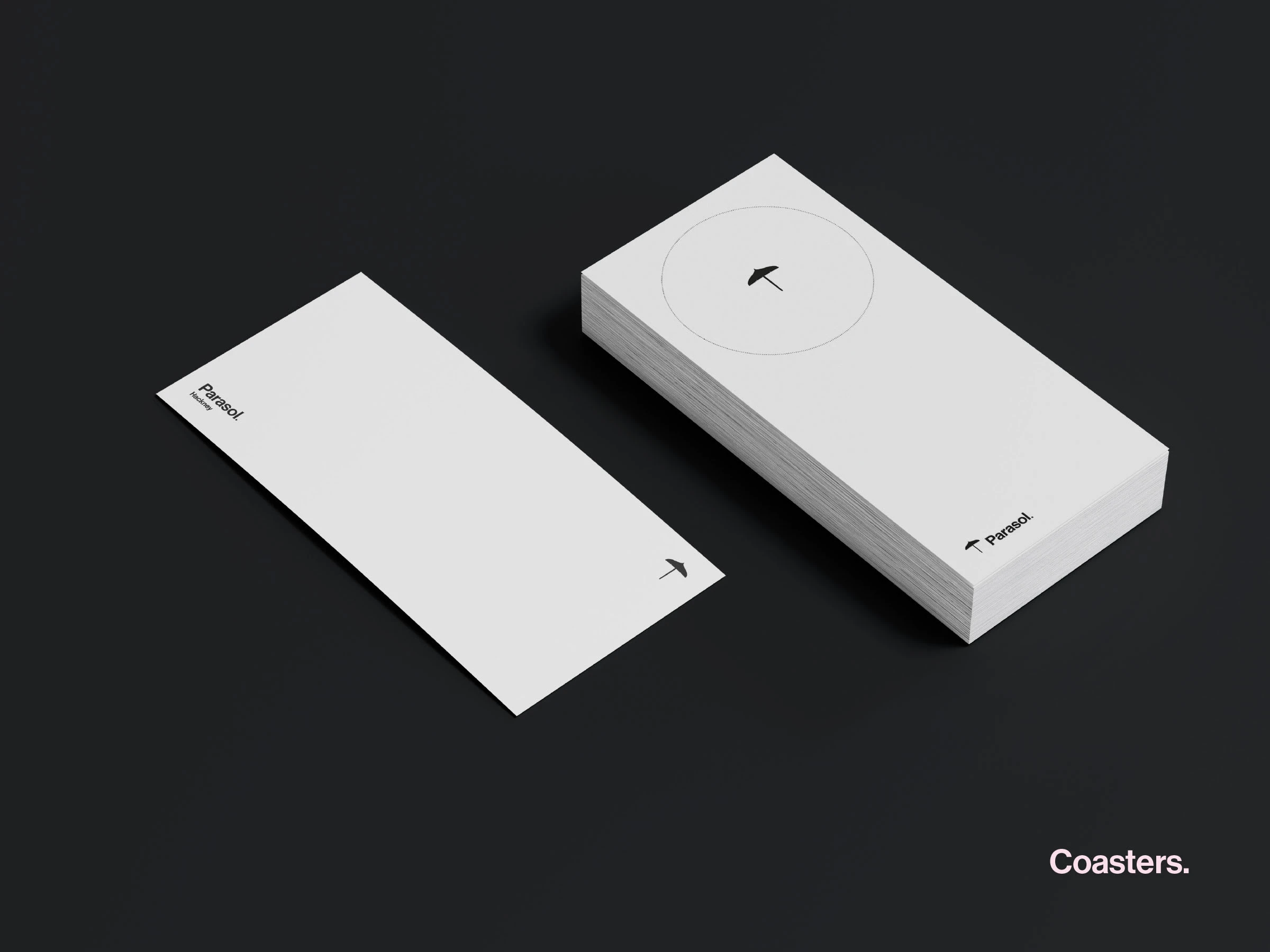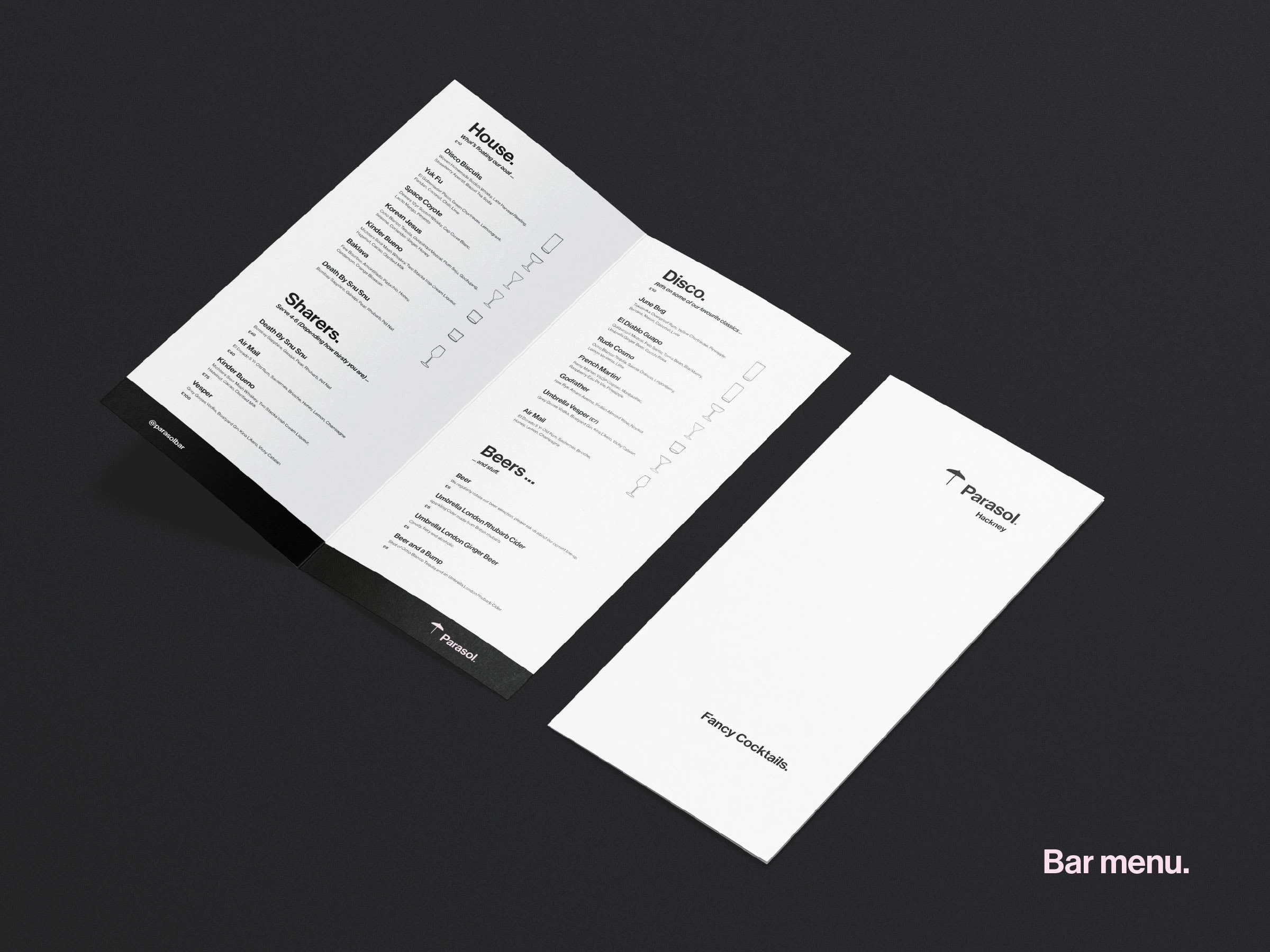 Branding for Parasol, a new London bar. The identity nods to sister brand The Umbrella Project, keeping visual lineage through the submark.
