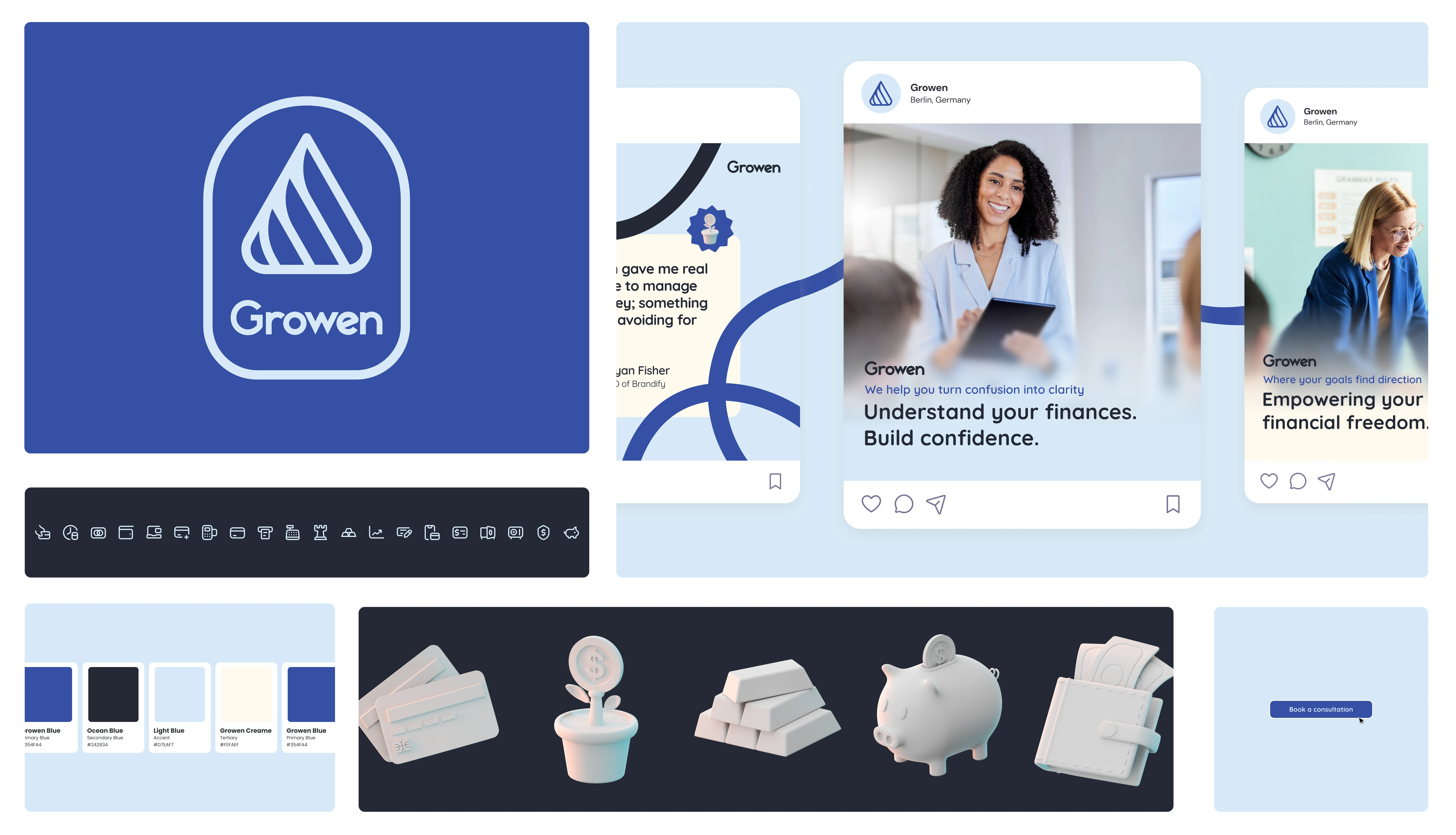 Brand concept designed for financial and business coaches in Germany who help people build confidence, structure, and clarity in their financial lives. The name comes from āgrowā combined with the soft ending ā-enā, giving it a natural, human tone that feels approachable and modern across languages.