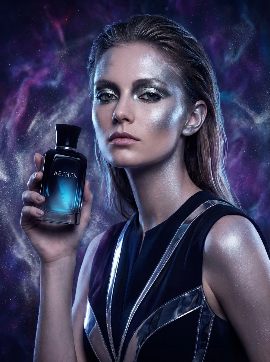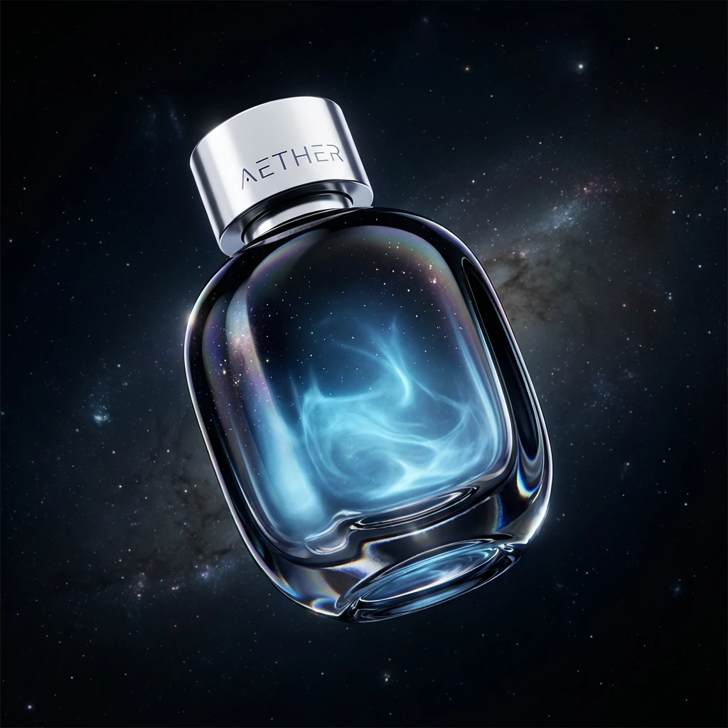 Lovart.ai to build a comprehensive visual identity system. Rather than generating isolated images, I established a consistent visual language involving chrome textures, obsidian glass, and bioluminescent nebula lighting that scales across product design, advertising, and web interface.