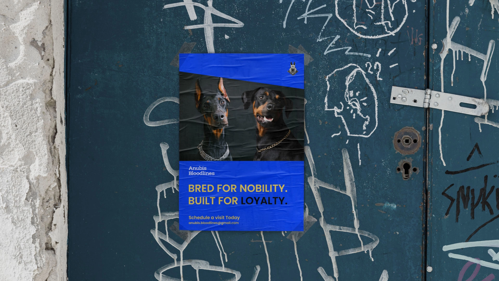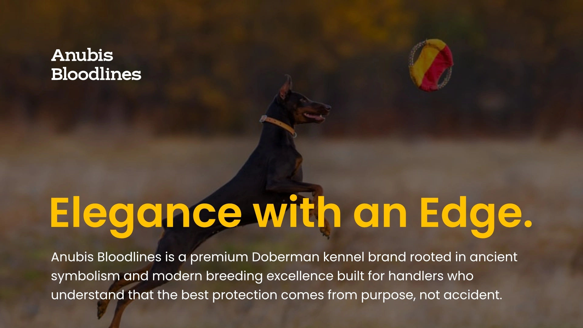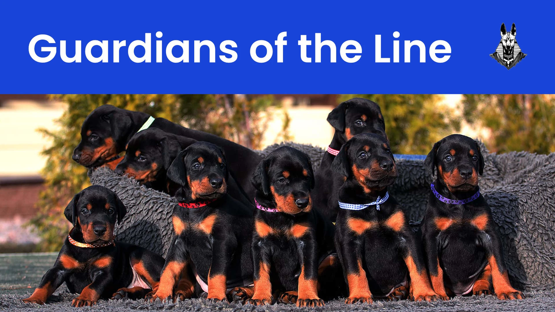 Anubis the ancient Egyptian god of protection, mummification, and the afterlife, depicted with the head of a jackal. The choice is deliberate: like the Doberman's own cropped-ear silhouette, Anubis presents a striking, guardian figure that commands respect. The jackal, a wild canid, bridges the ancient and the noble a fitting namesake for a breed born of purpose and refined into excellence.