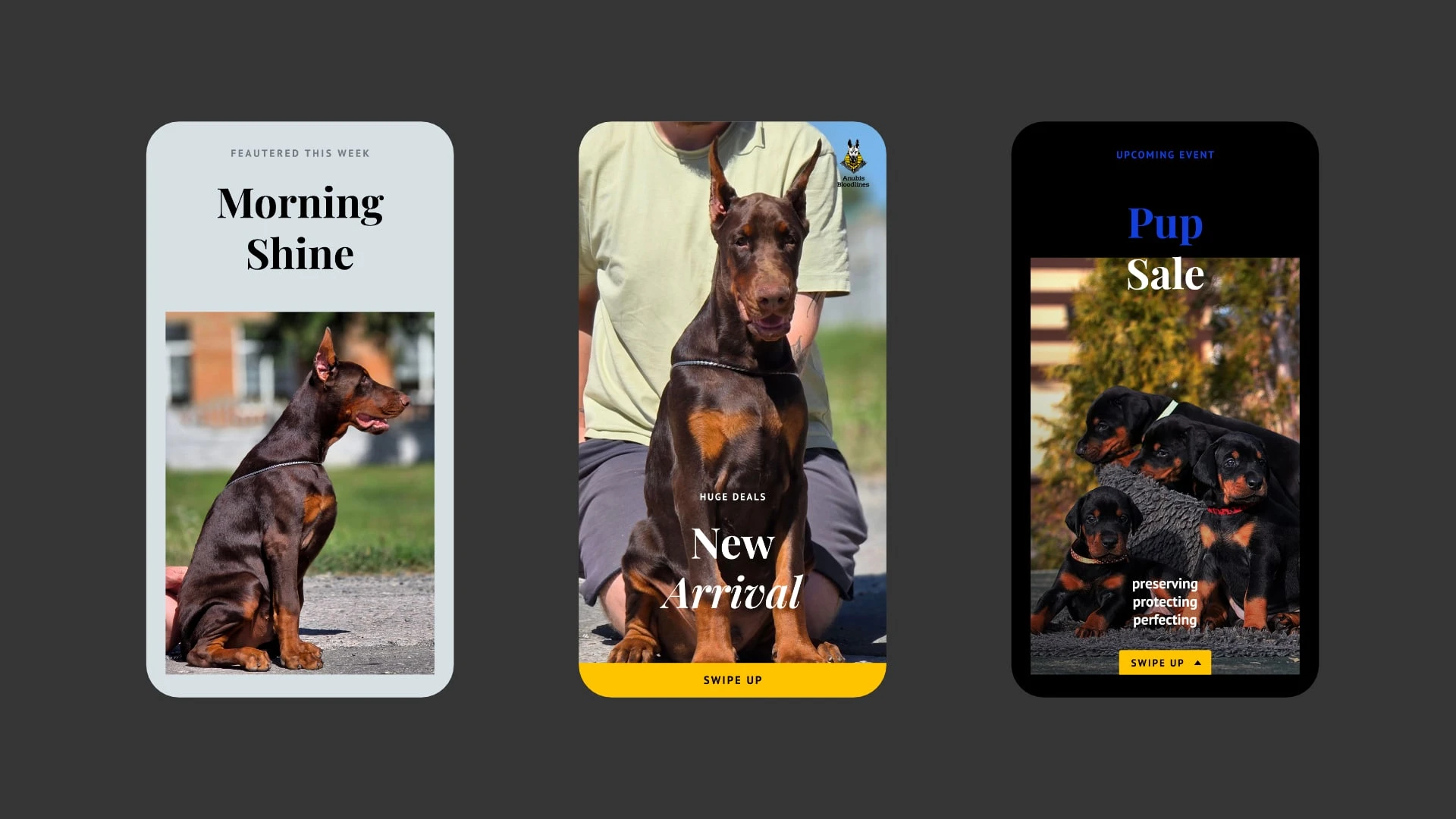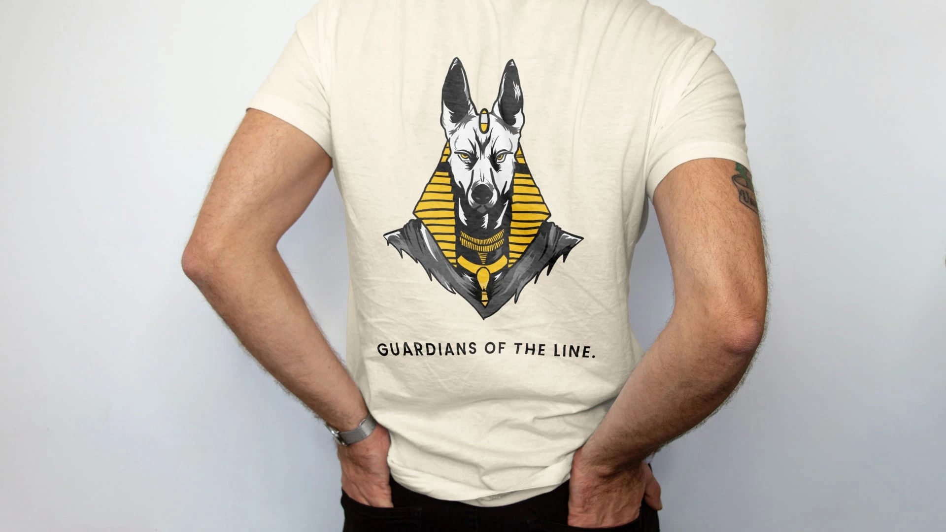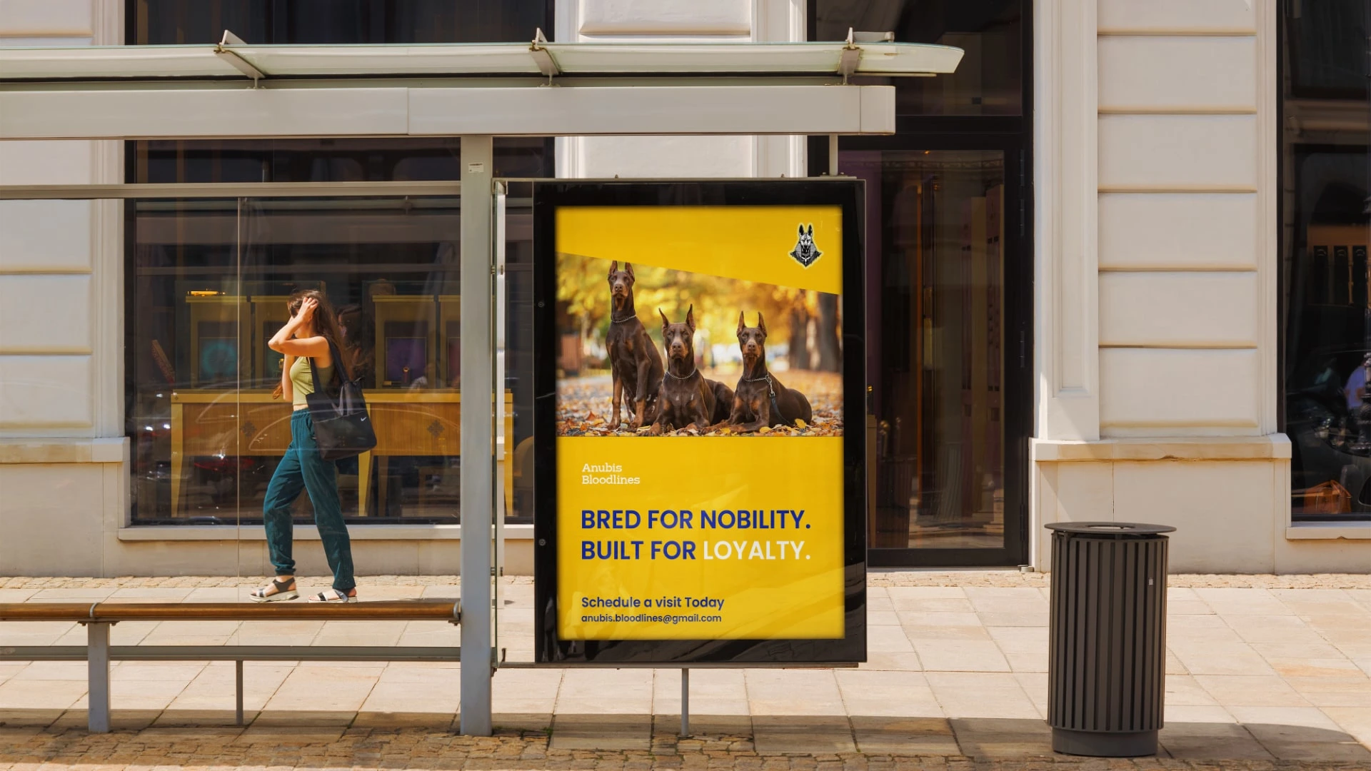 Anubis the ancient Egyptian god of protection, mummification, and the afterlife, depicted with the head of a jackal. The choice is deliberate: like the Doberman's own cropped-ear silhouette, Anubis presents a striking, guardian figure that commands respect. The jackal, a wild canid, bridges the ancient and the noble a fitting namesake for a breed born of purpose and refined into excellence.