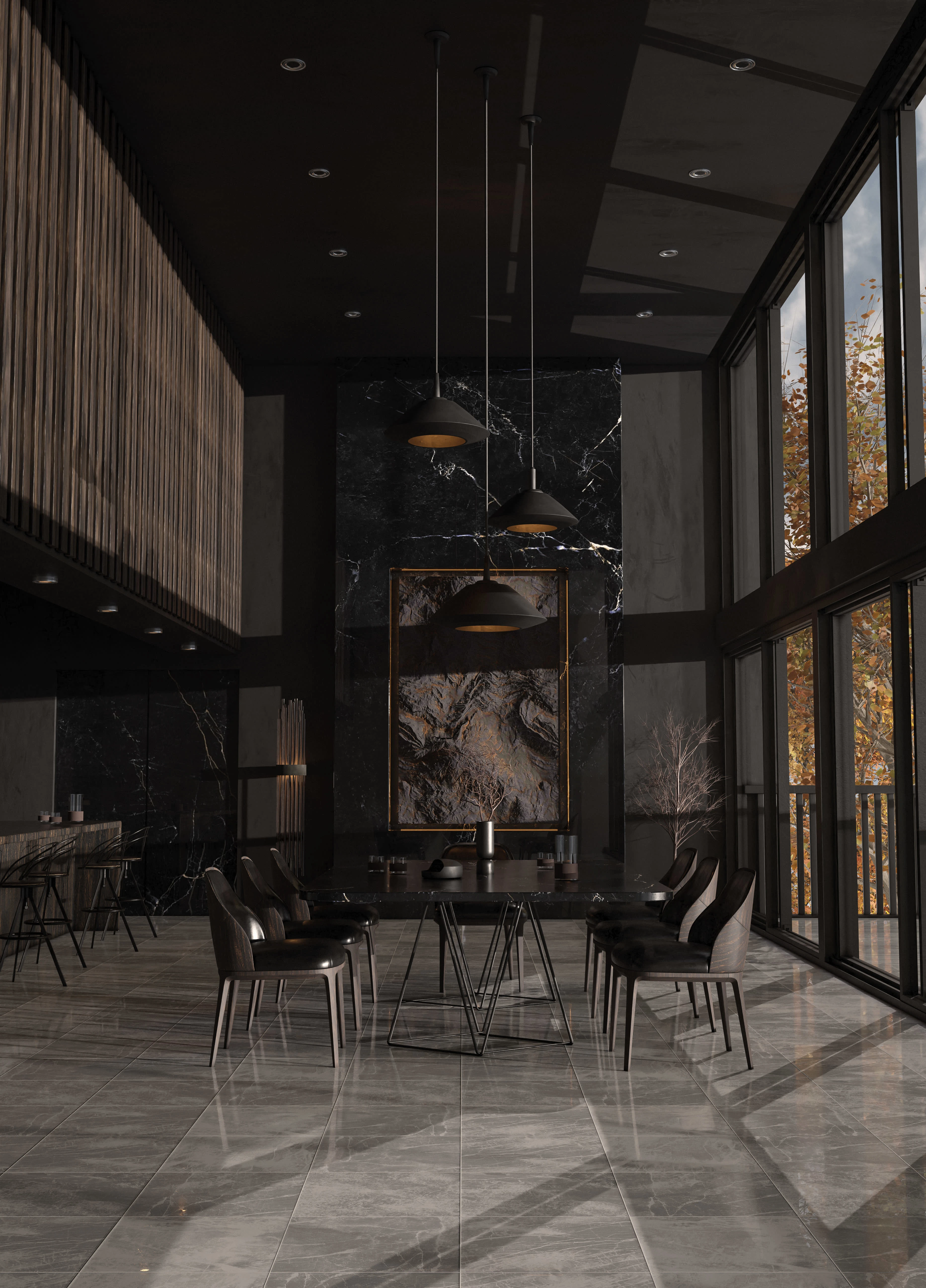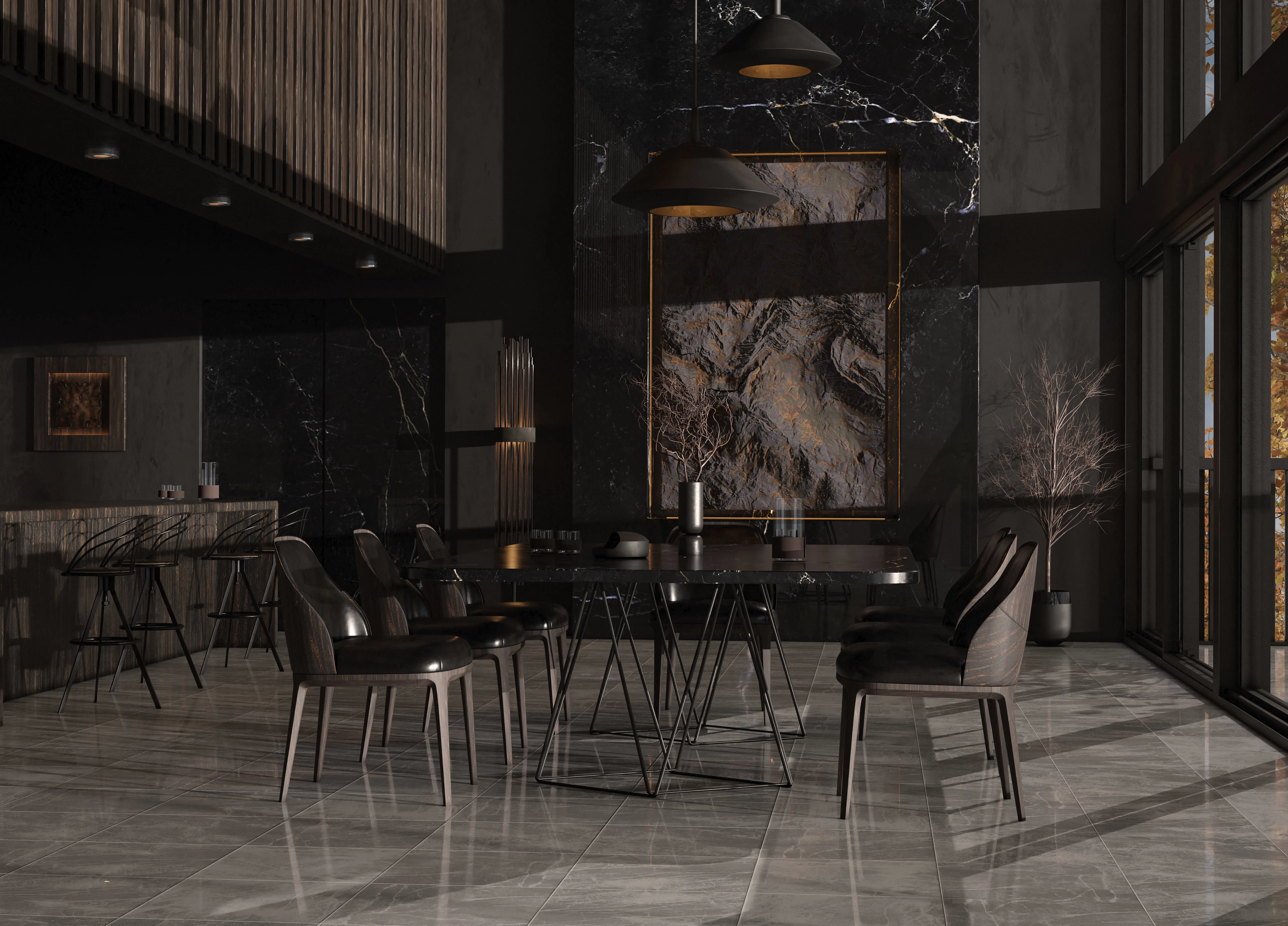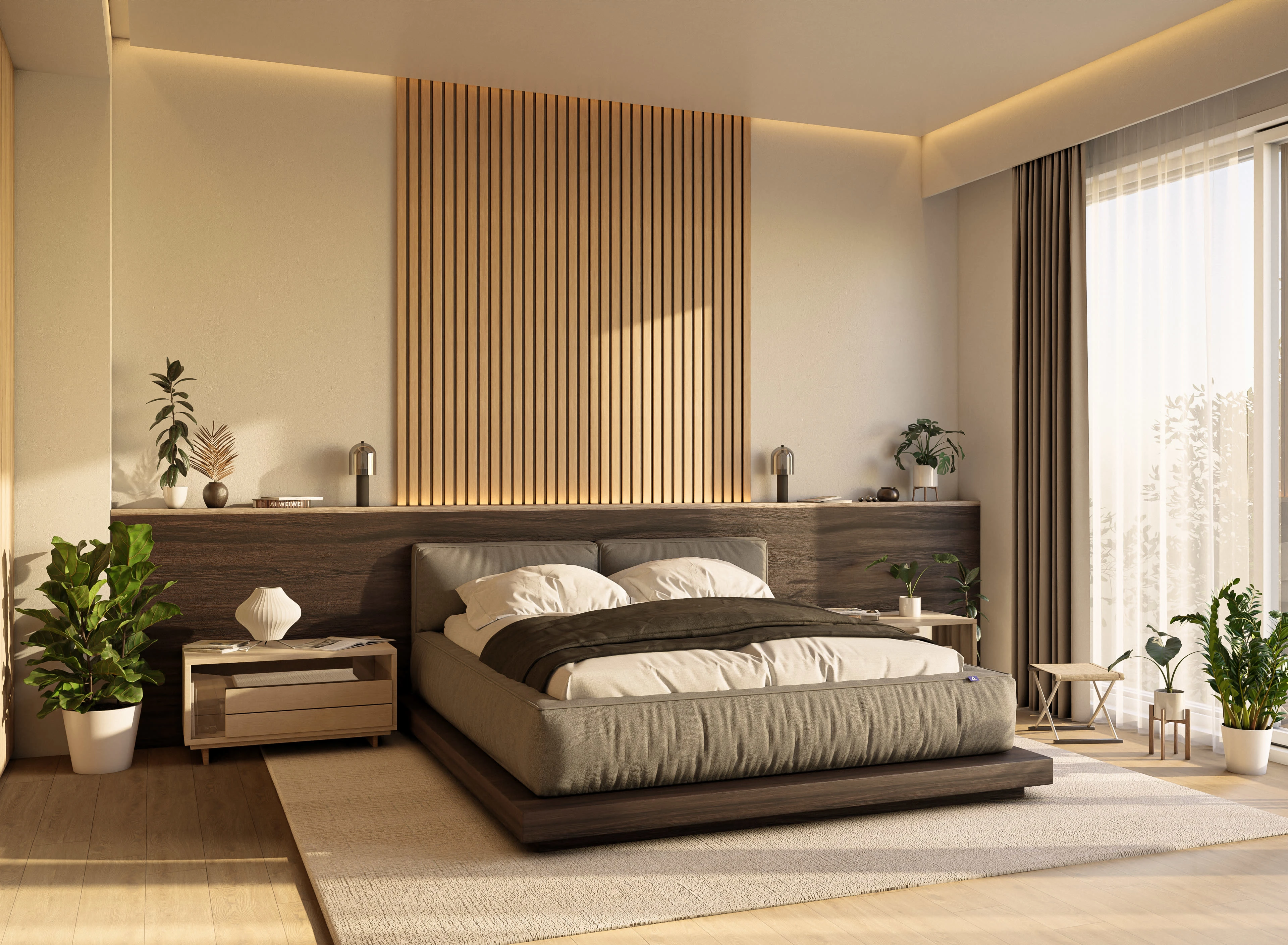 A warm and modern bedroom interior balancing natural light and textures, contrasted by a A modern dining space with a bold, dark aesthetic.
