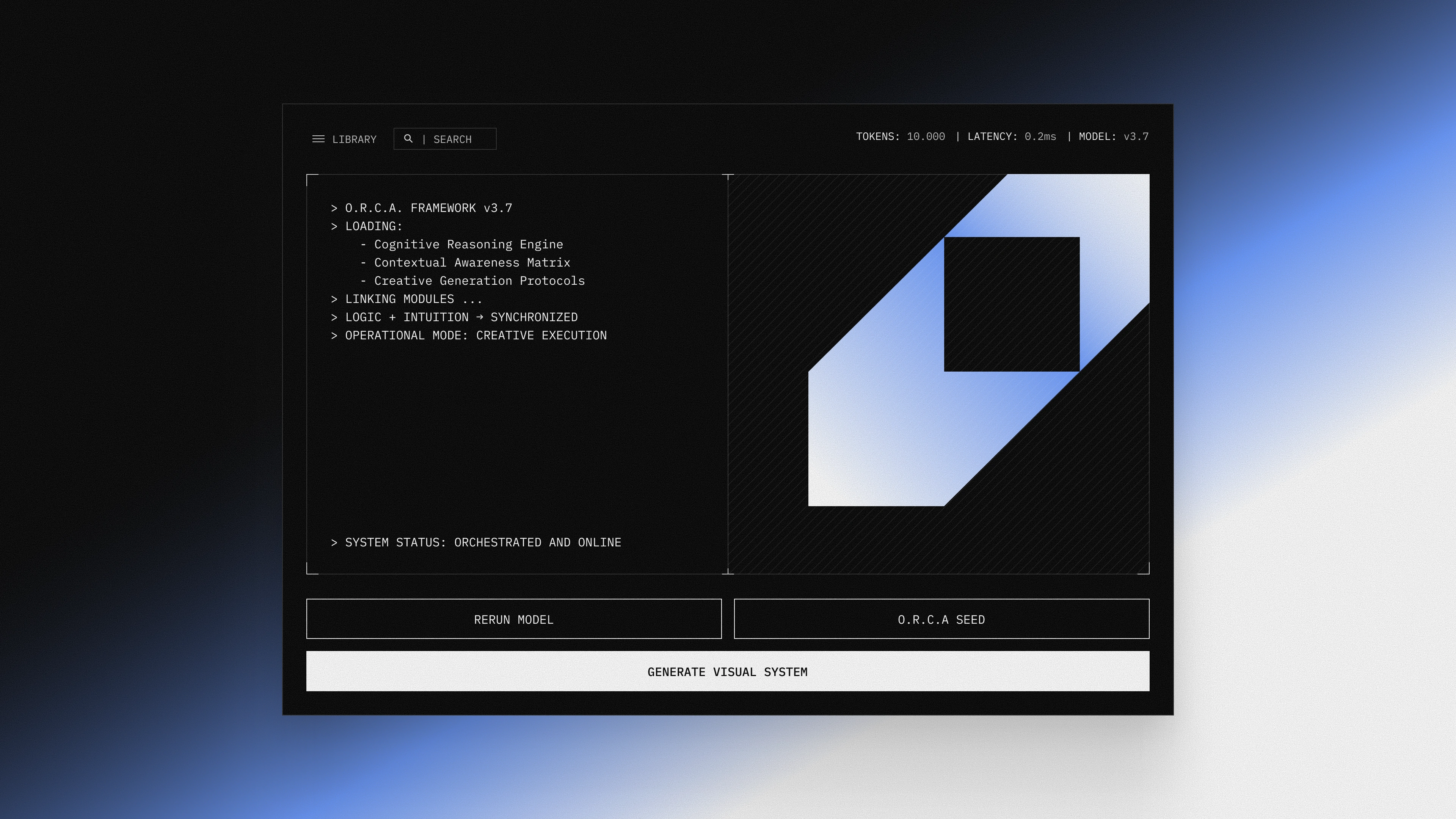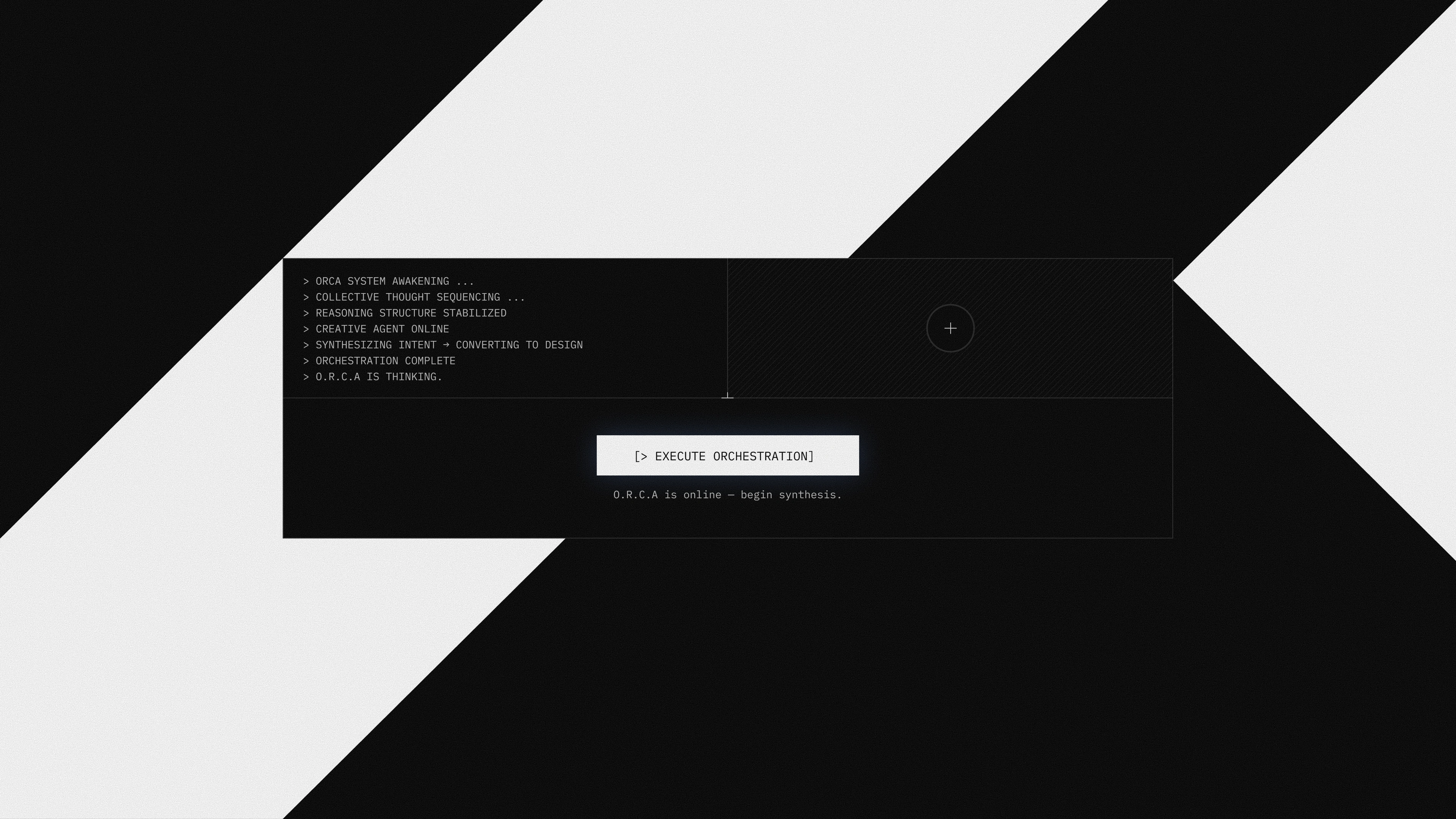 Built around the idea of an autonomous creative agent, O.R.C.A visualizes the process of thought; how reasoning, data, and intent transform into structured design outcomes.
