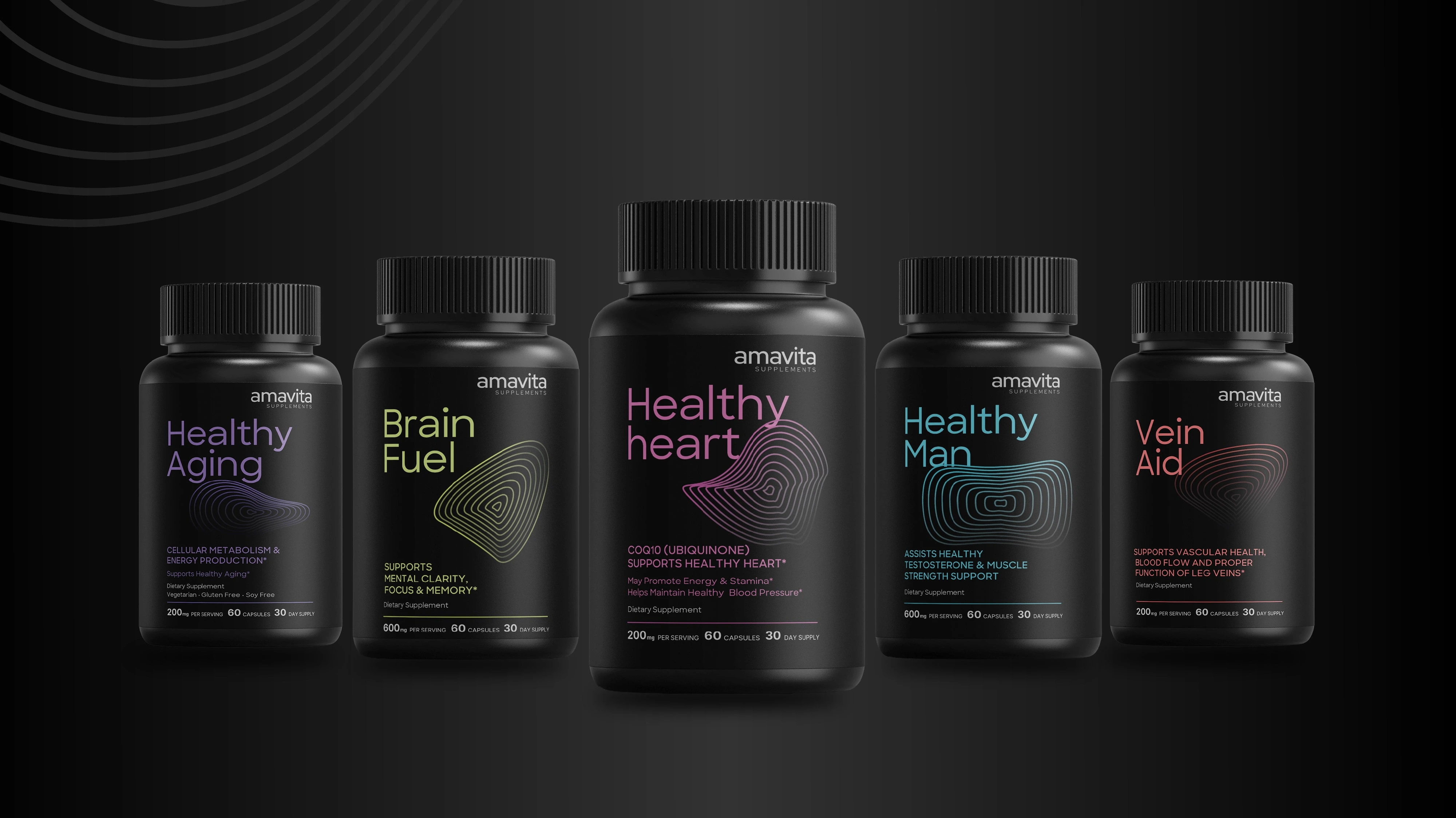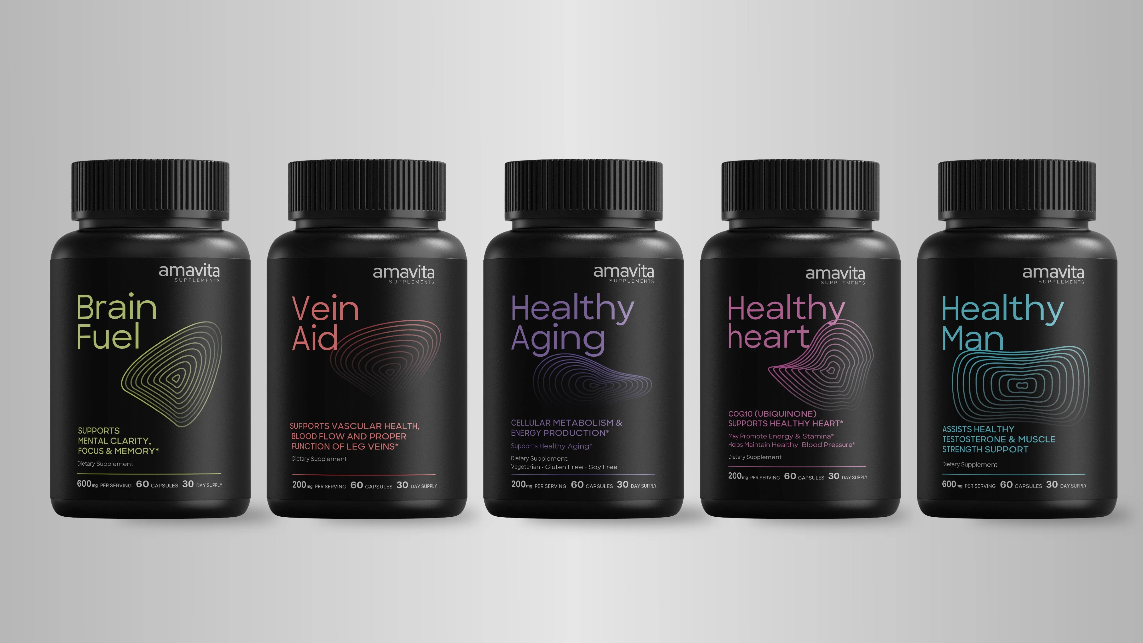 I proposed elevating the design with a conceptual graphic system based on biometric waveforms—reinterpreted as circular radiations that ripple outward like vital signs. Each supplement received its own unique waveform pattern and color, creating visual distinction while suggesting the body's response to each formula: steady for "Healthy Aging," sharp for "Brain Fuel," rhythmic for "Healthy Heart," dynamic for "Healthy Man," and flowing for "Vein Aid."
