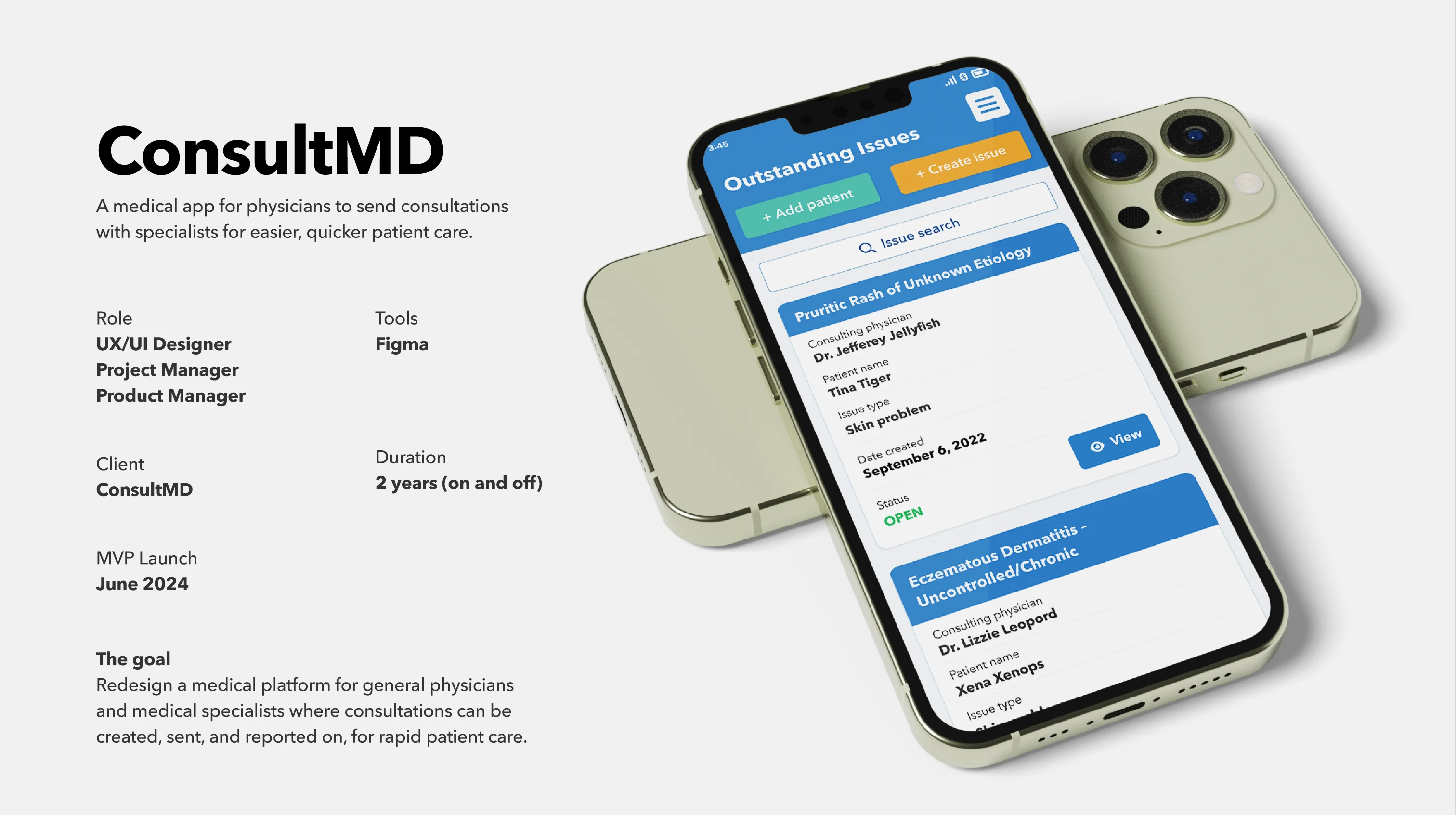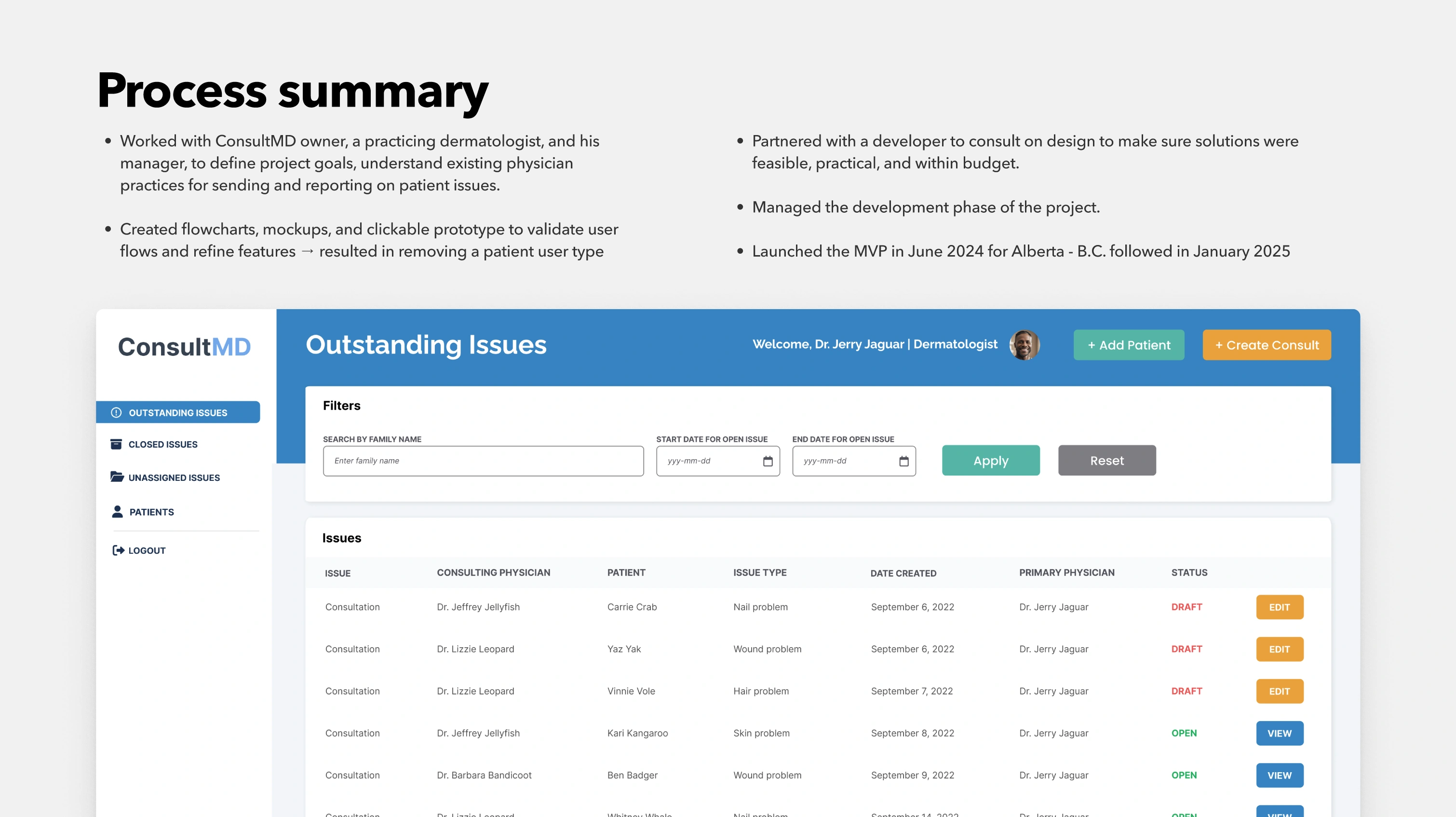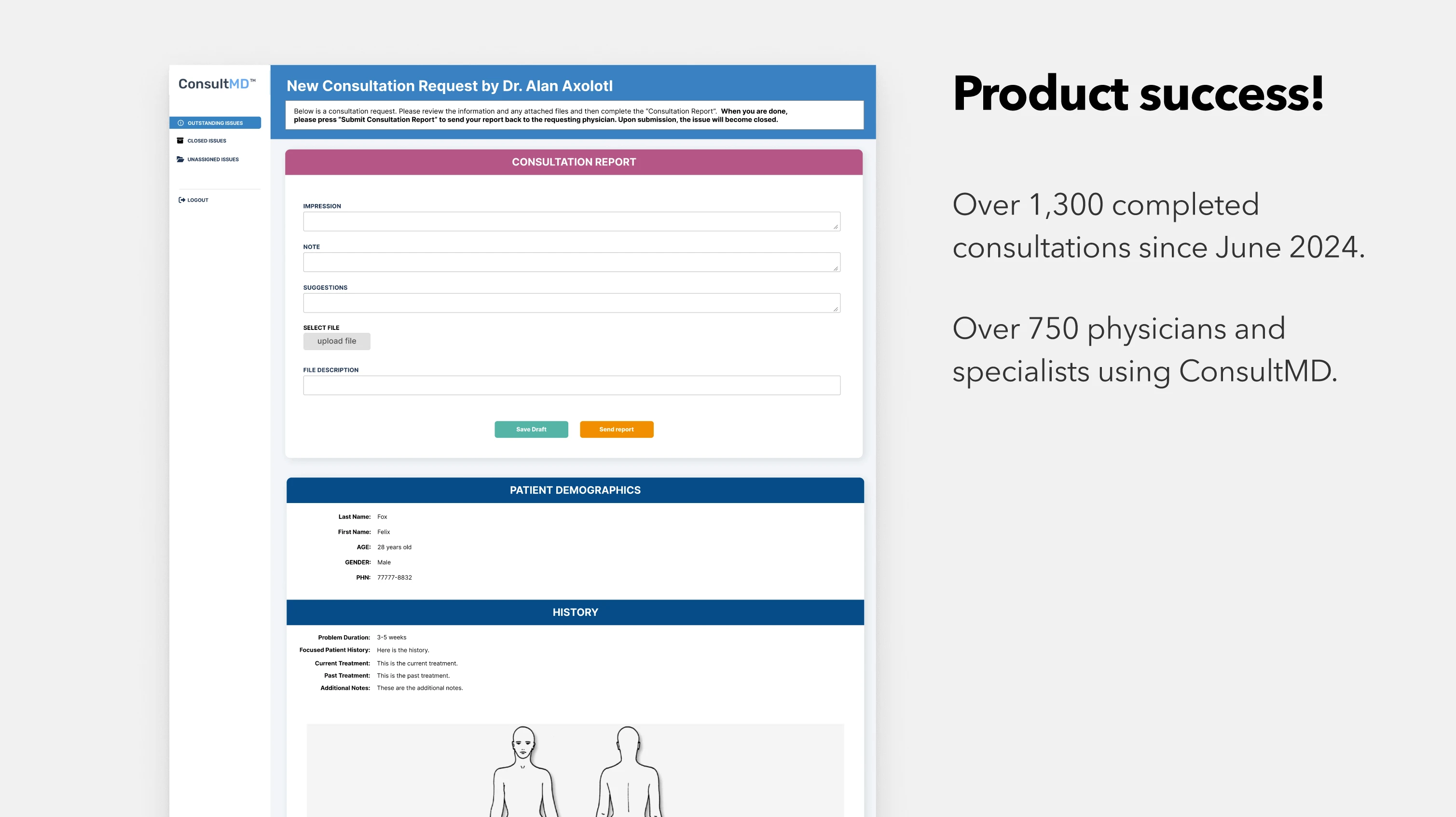 ConsultMD connects 750+ GPs & specialists across AB & BC, enabling 1300+ consults. I led design & delivery and continue to support and enhance the platform.