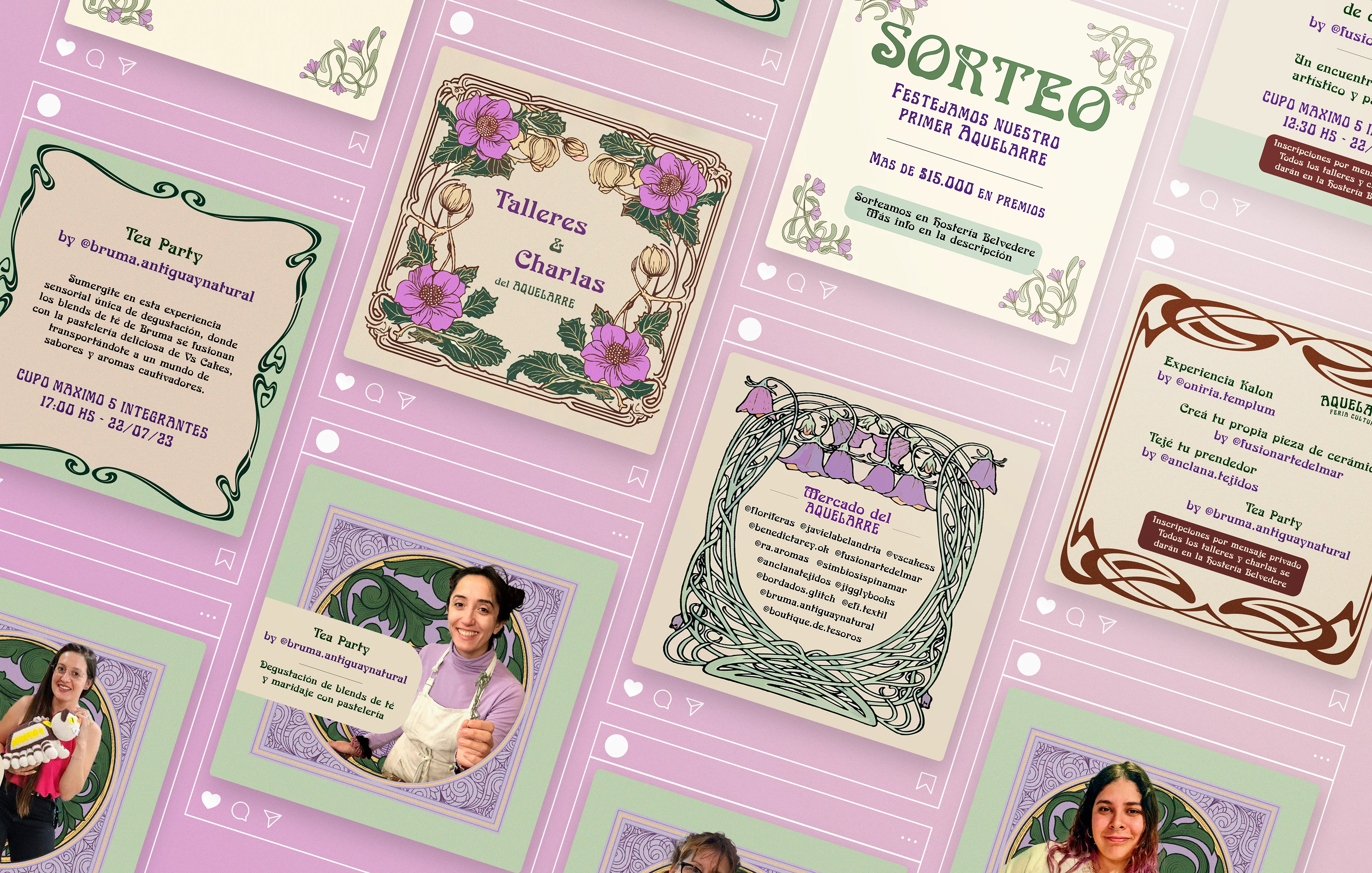 Complete social media design for Aquelarre Fair, blending Art Nouveau elements with modern layouts to promote workshops, talks, and event activities.