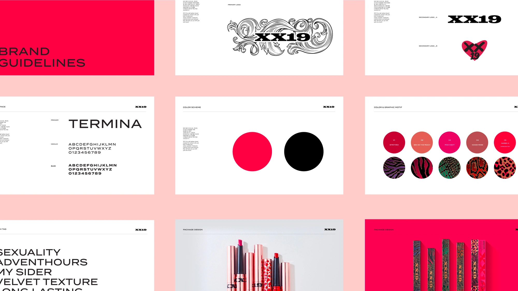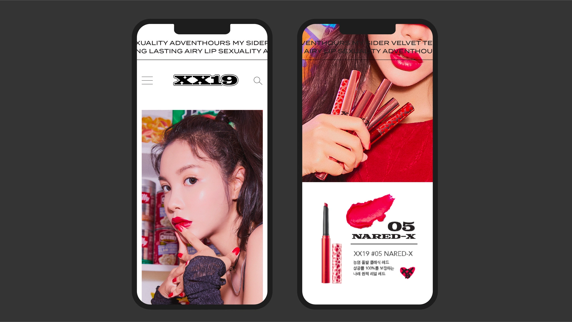 The brand’s visual identity combines dynamic patterns with the XX19 logotype, used flexibly across touchpoints. A heart-shaped icon featuring the XX19 mark adds a symbolic layer, highlighting the brand’s expressive personality. To break from traditional lipstick forms, a pen-type container was chosen to deliver a unique experience. Among the five SKUs, one was developed as a special edition to enhance collectibility and brand character. Each design features its own graphic pattern, reinforcing individuality and visual impact.