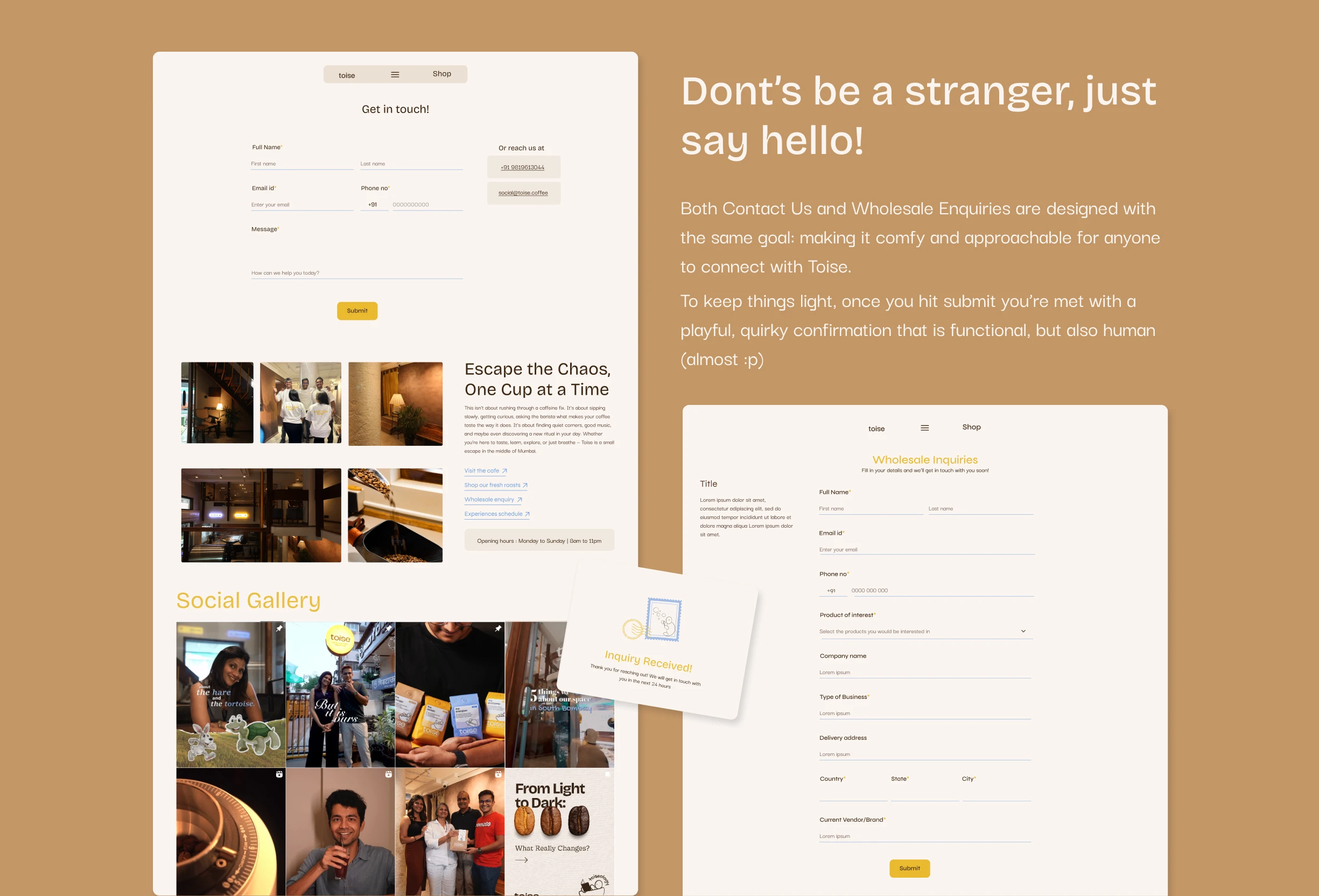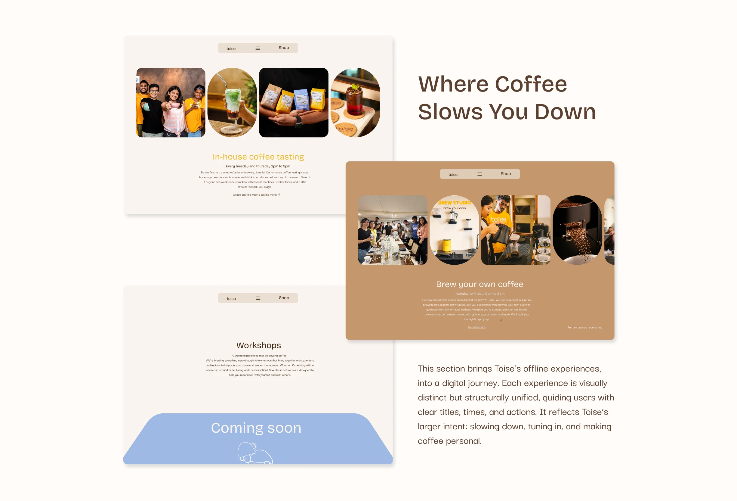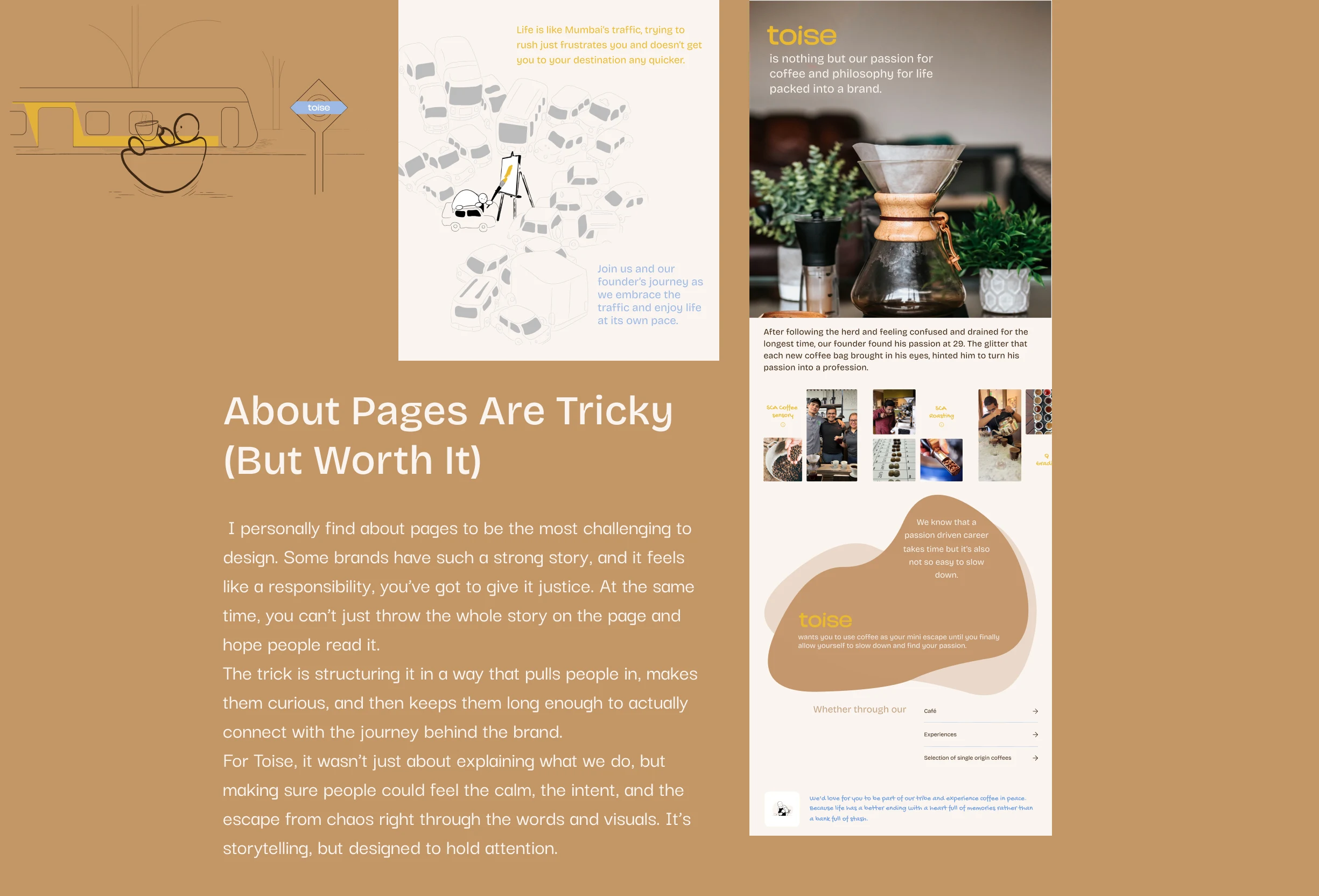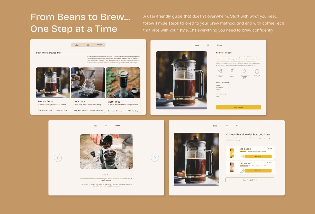 Building a website for toise, specialty coffee roastery and brewstudio on a mission to make specialty coffee a part of every Indian household. The aim is to represent them as not just another coffee brand but also highlight on their roastery, where they roast their own beans on an electric roaster, and their brewstudio, that allows people to brew their own coffee at the cafe. It also signifies the importance for experiencing the world of coffee and taking a break from the chaos while also making coffee approachable instead of intimidating and complex.