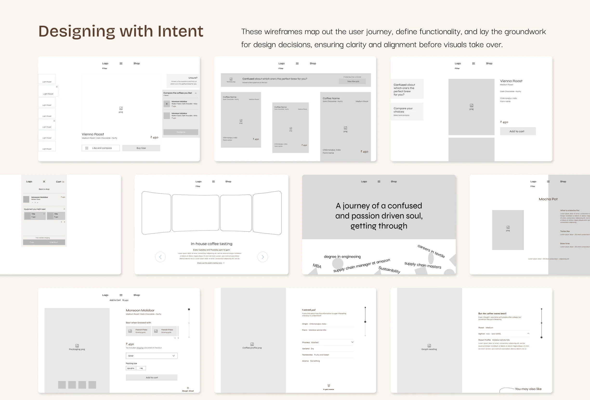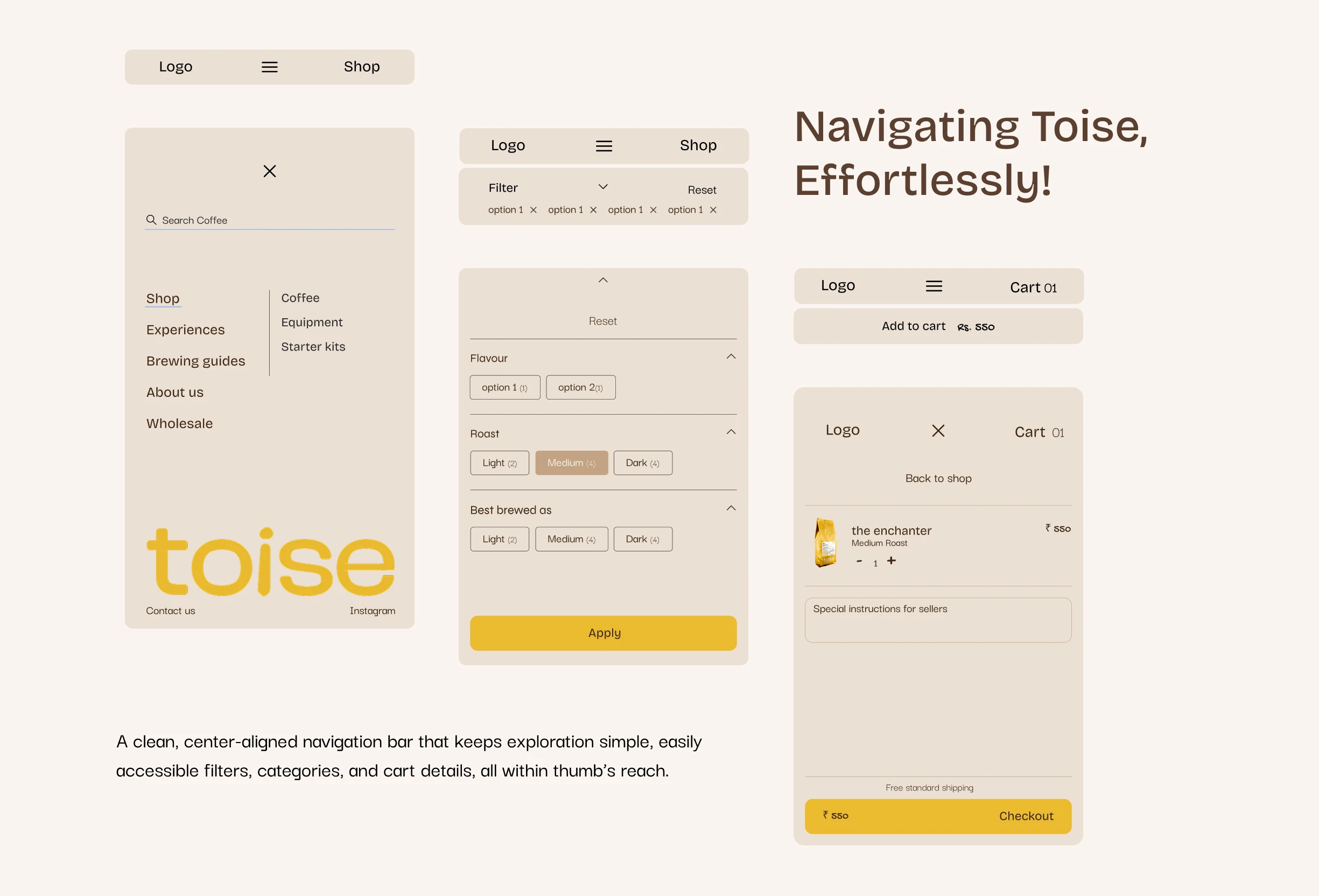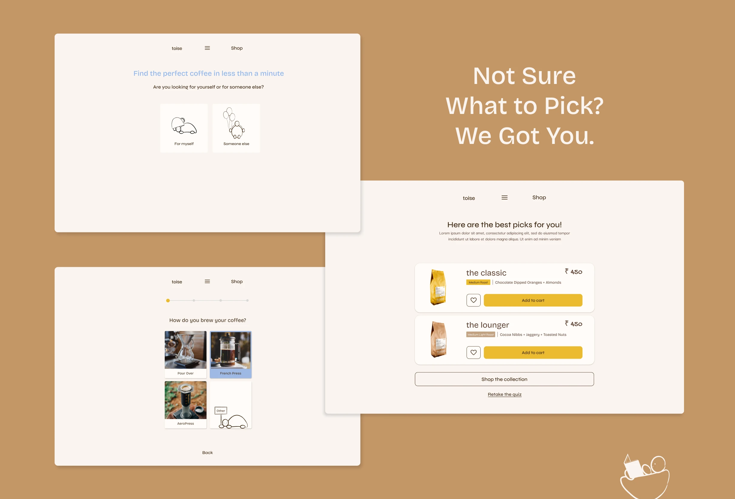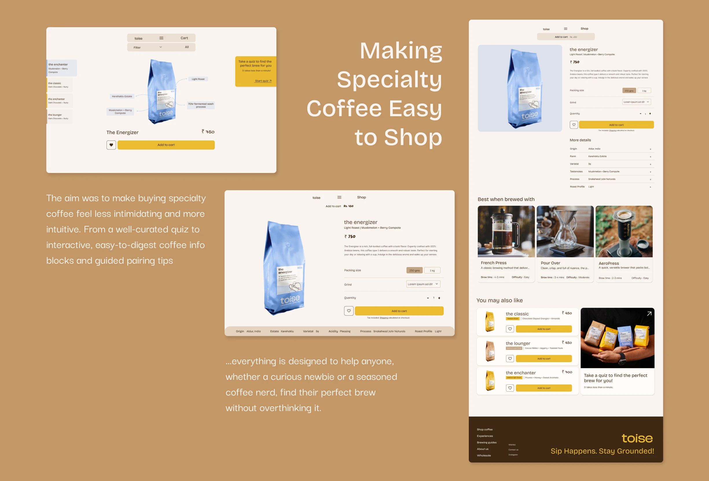 Building a website for toise, specialty coffee roastery and brewstudio on a mission to make specialty coffee a part of every Indian household. The aim is to represent them as not just another coffee brand but also highlight on their roastery, where they roast their own beans on an electric roaster, and their brewstudio, that allows people to brew their own coffee at the cafe. It also signifies the importance for experiencing the world of coffee and taking a break from the chaos while also making coffee approachable instead of intimidating and complex.
