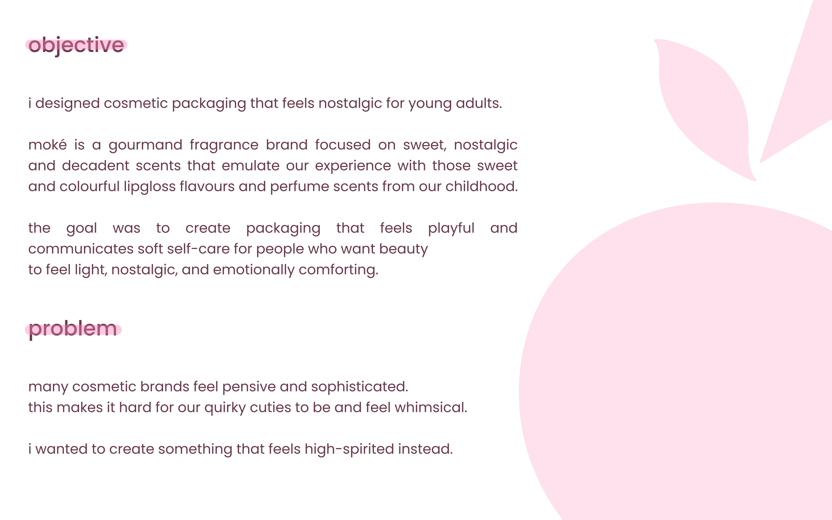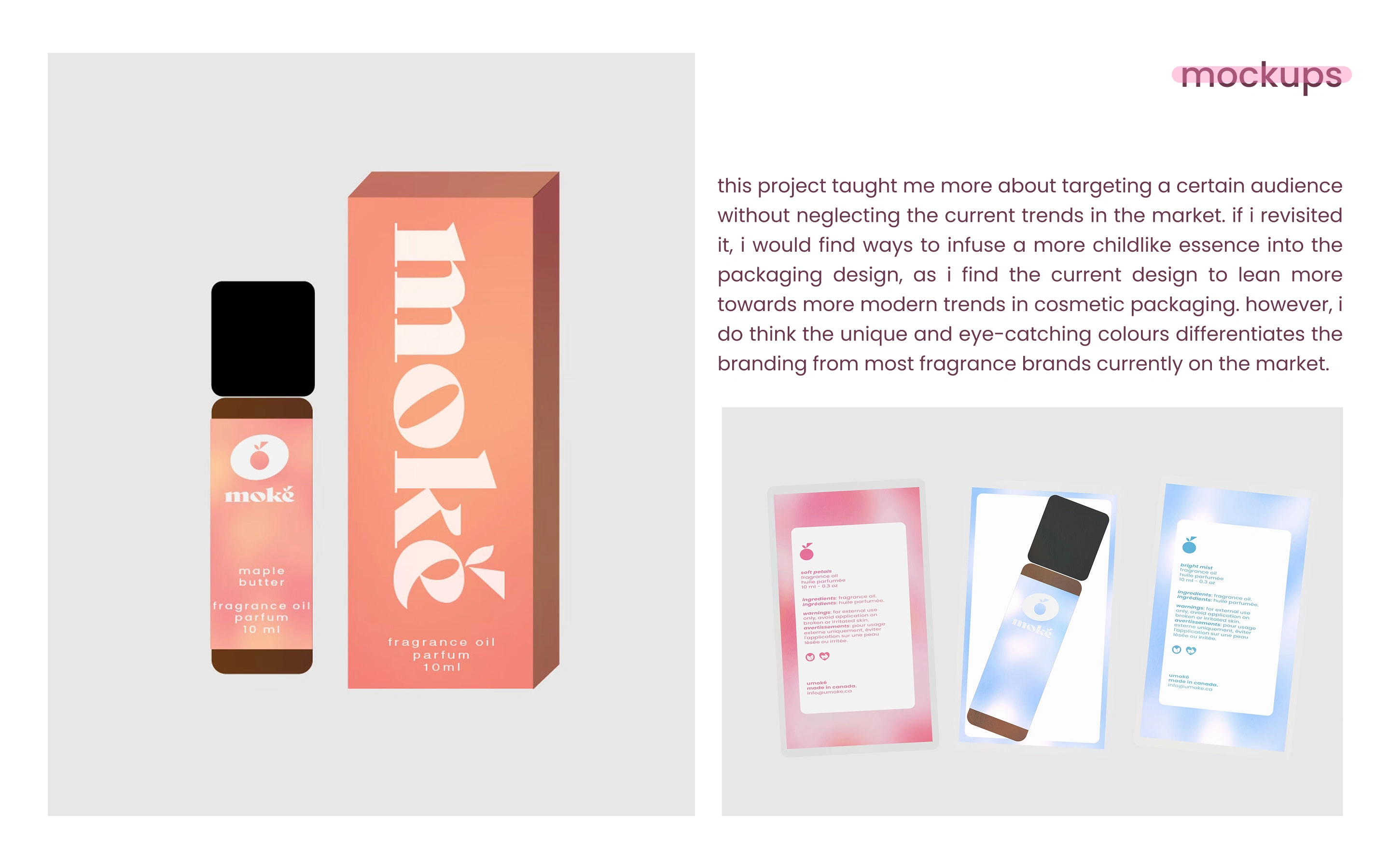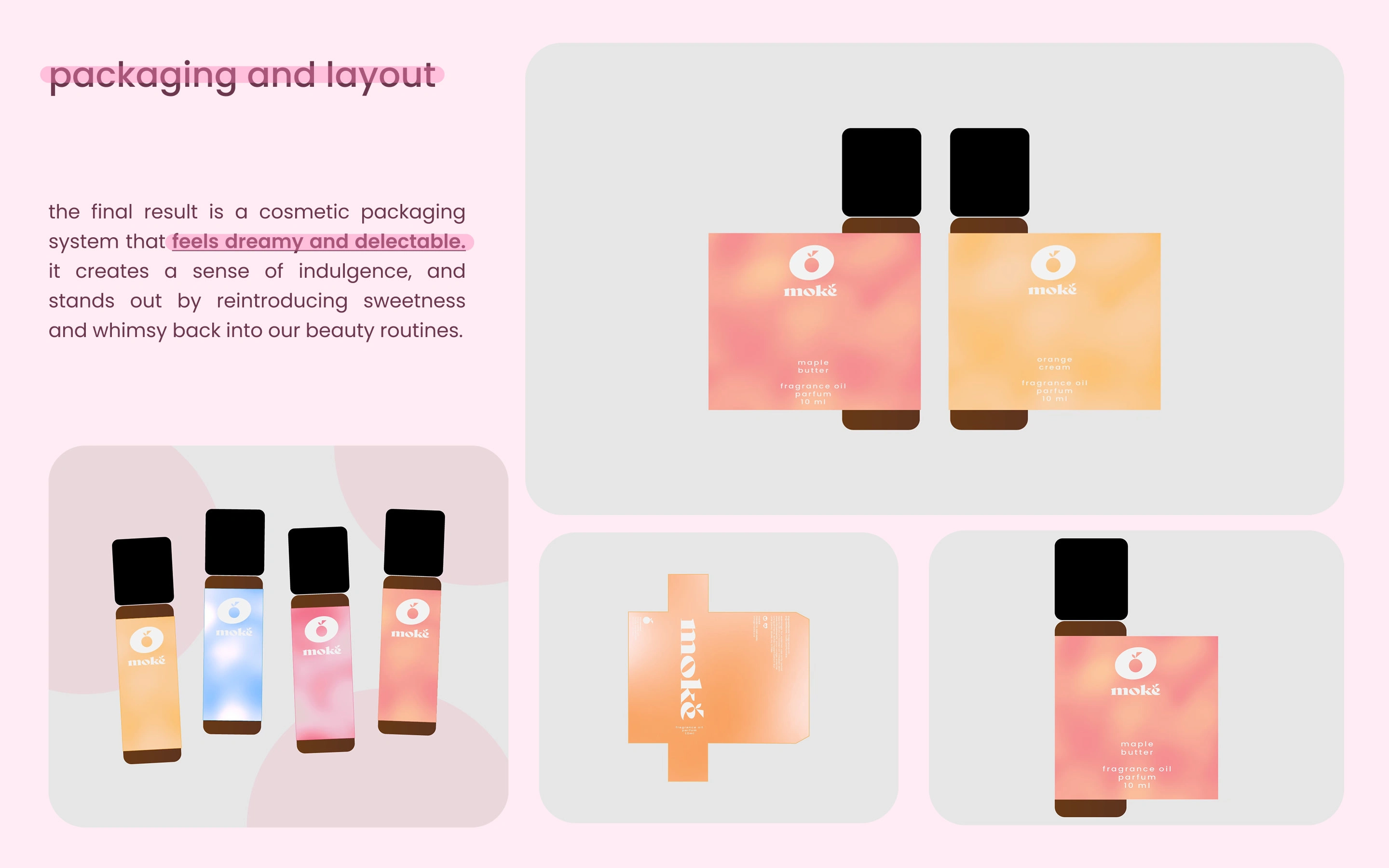 Moké is a perfume brand that wants to modernize the sweet scents from our childhood. Moké wants to bring back the bubblegum lip balms and cotton candy body mist we all loved and used all the time in middle school, and make it modern. Giving a sleek but nostalgic feeling in their product.