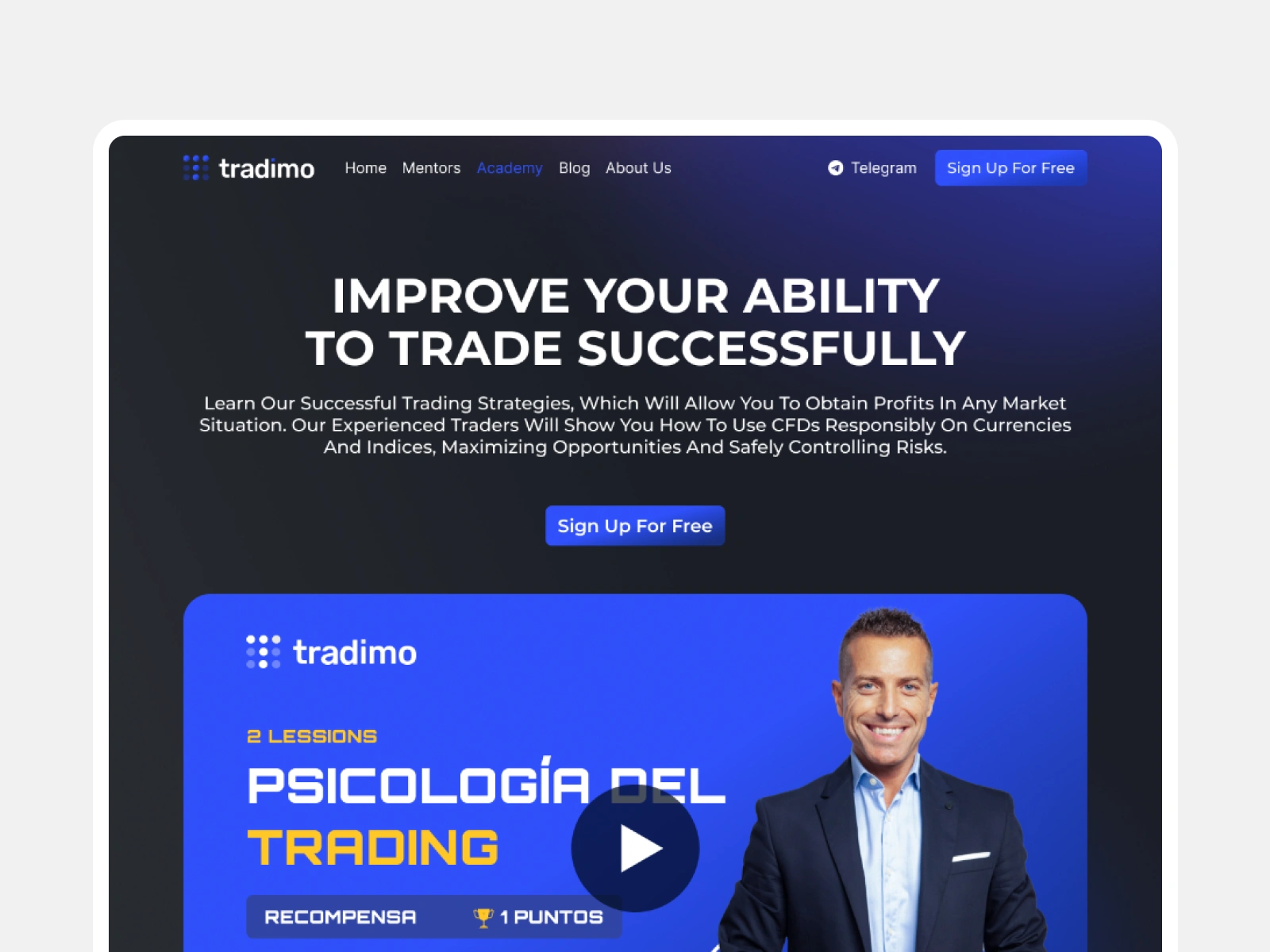 Tradimo, a trading academy with a strong presence in Latin America, needed a high-conversion landing page to promote their trading community, educational programs, and premium mentorship. They required a modern, professional, and trustworthy design that aligned with the trading industry but also appealed to a younger LATAM audience.