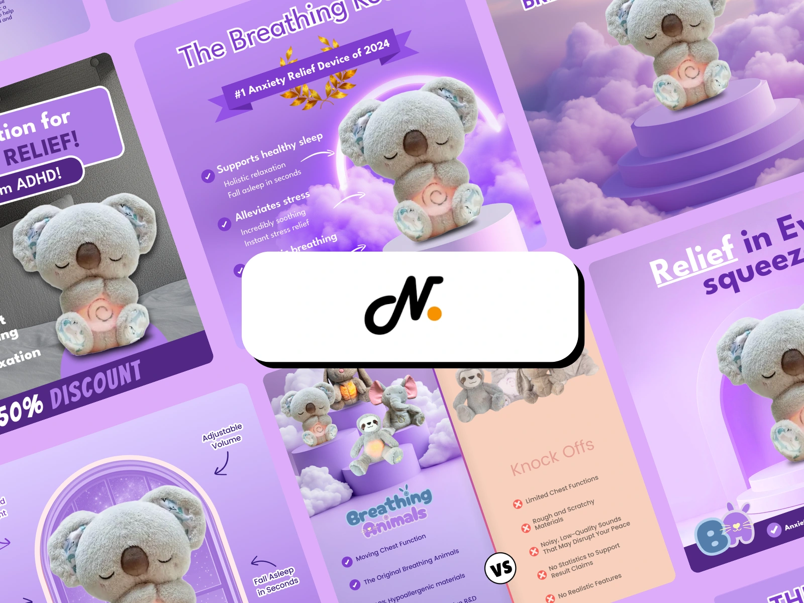 Full creative production for a DTC anxiety relief brand. Static ad suite covering identity, social proof, competitor comparison and feature angles.