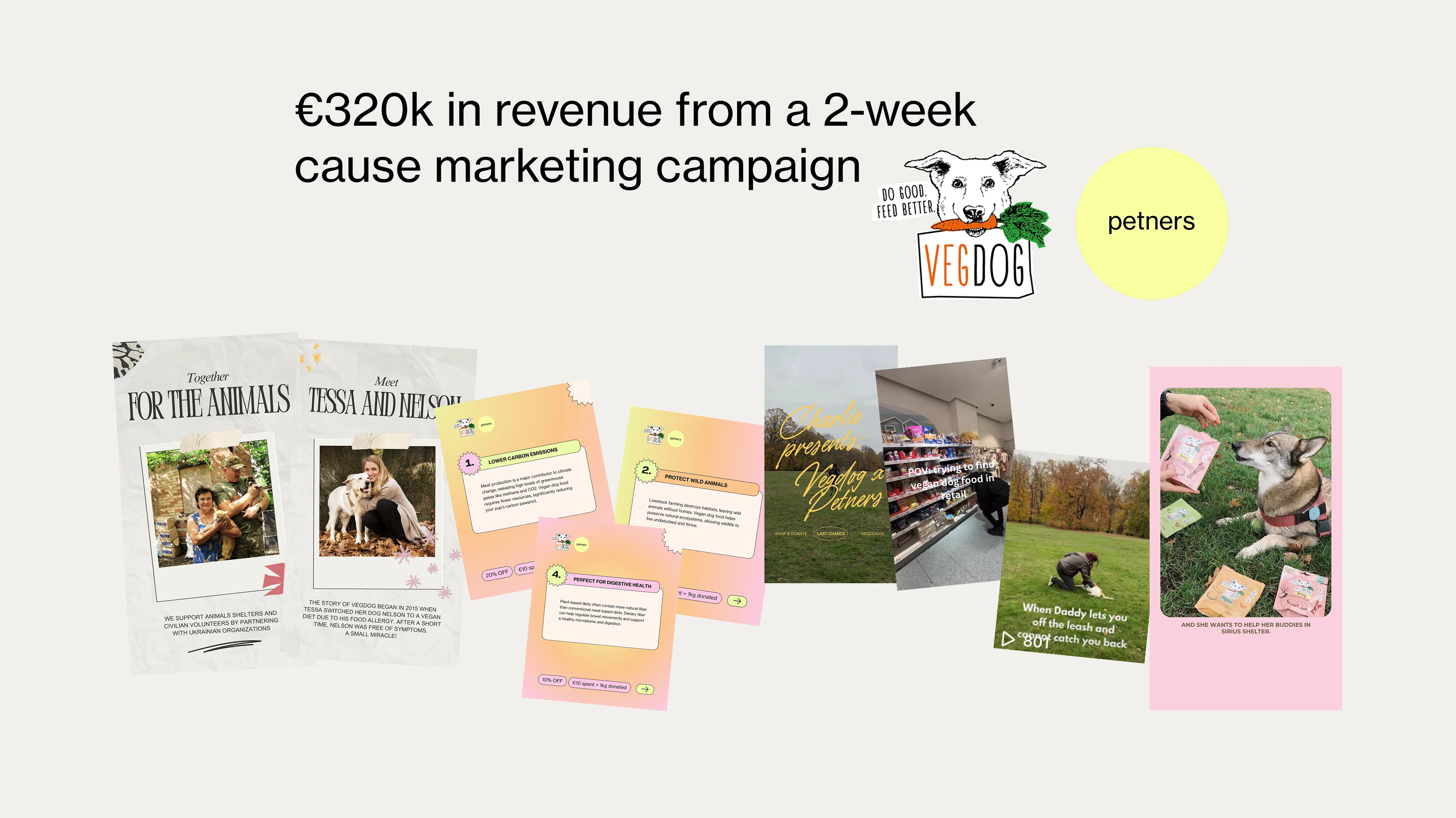 I led strategy, design, execution and analytics from the Petners side for a two-week cause marketing campaign between VEGDOG and Petners that turned brand awareness and engagement into €320k in revenue and 32 tons of pet food donated to Ukraine.
