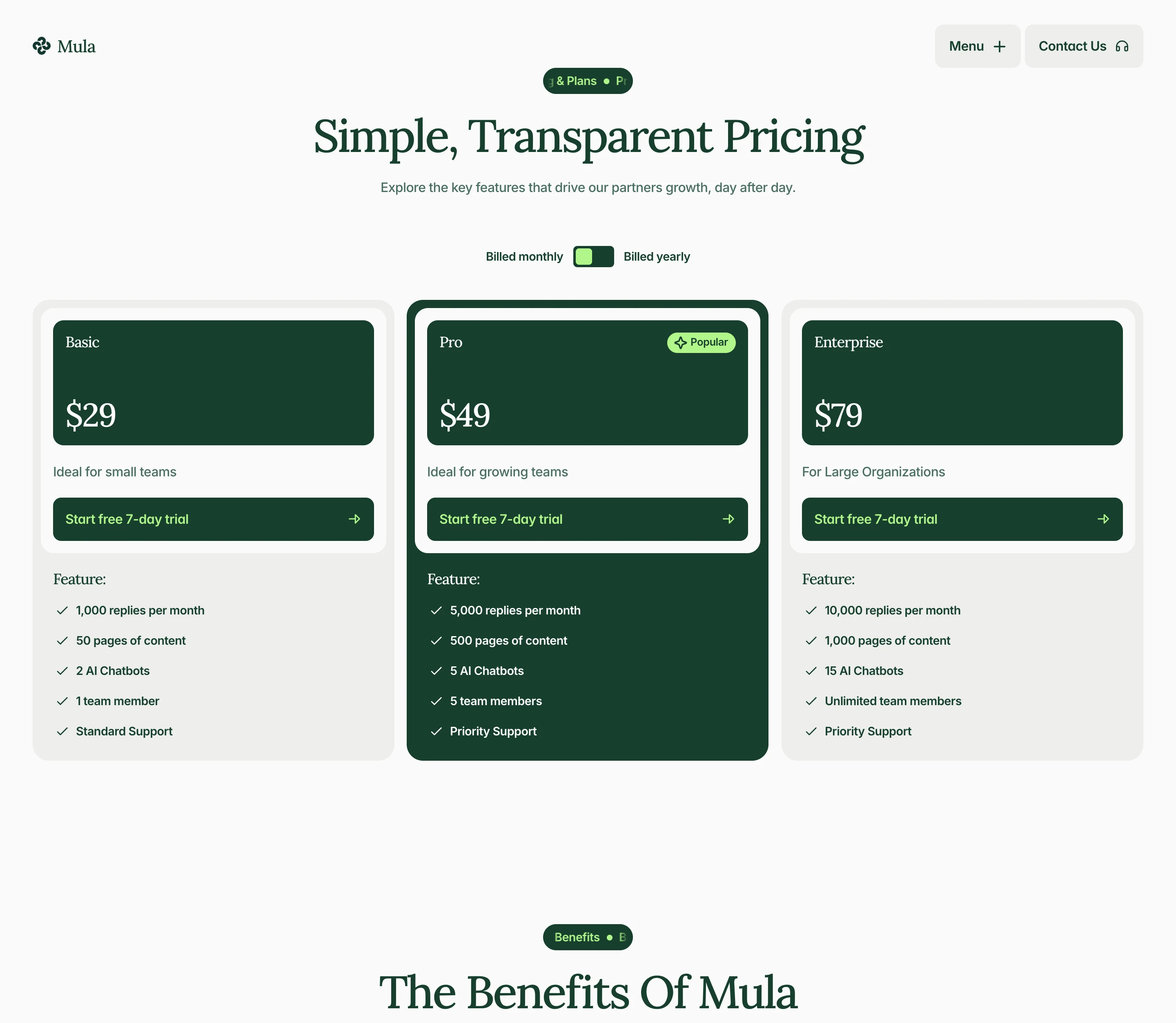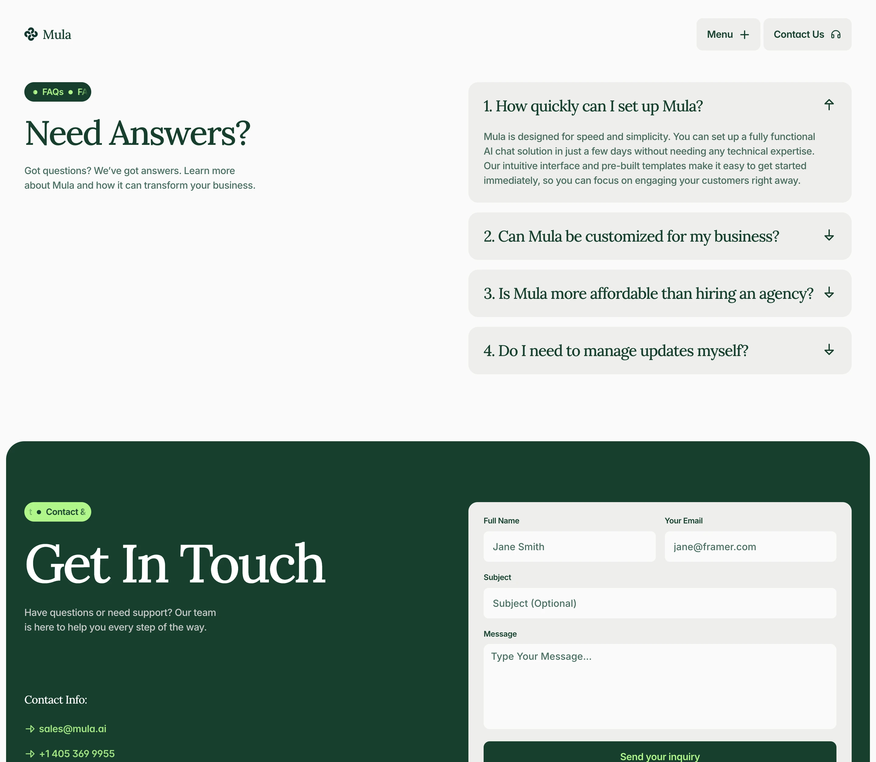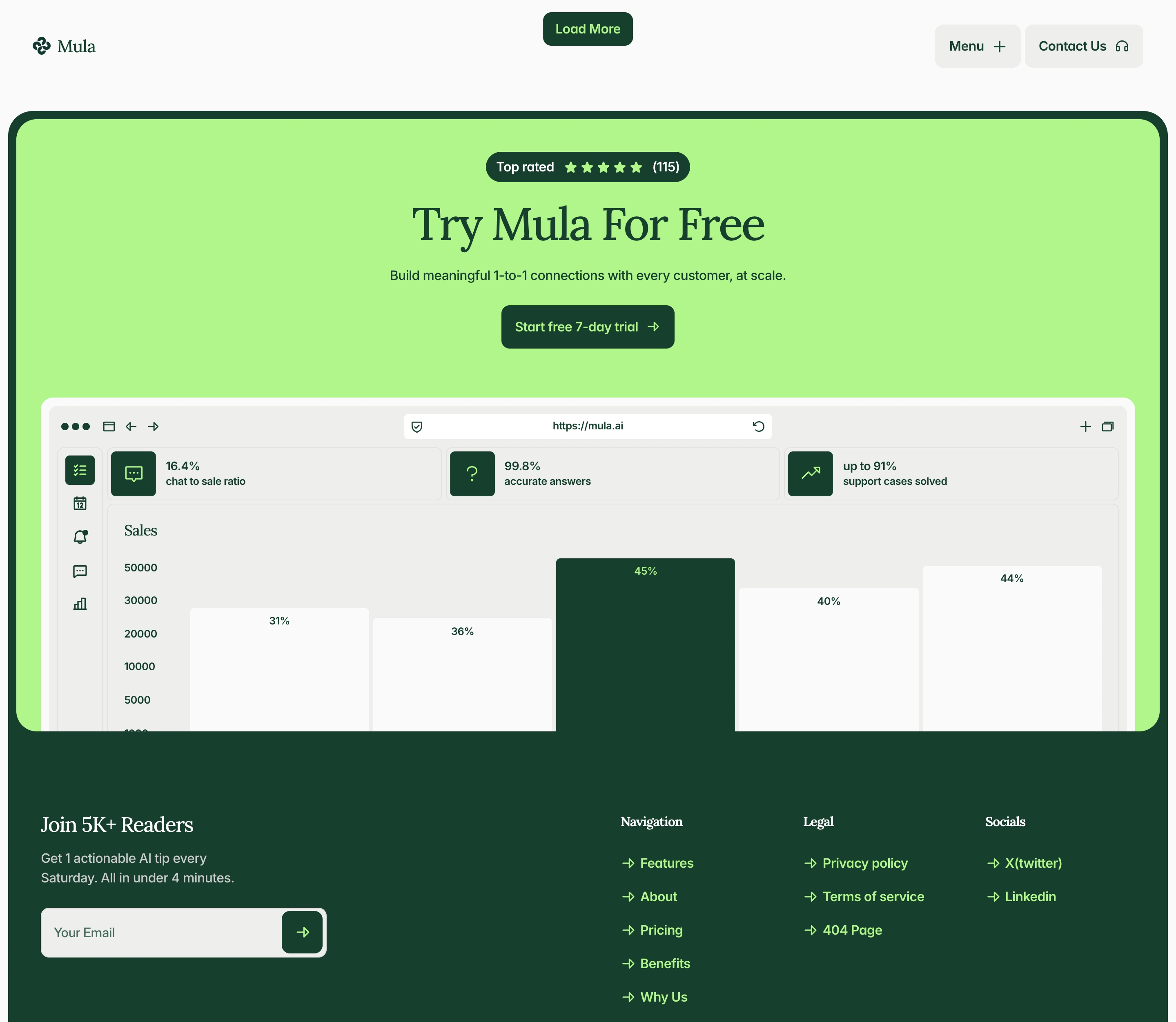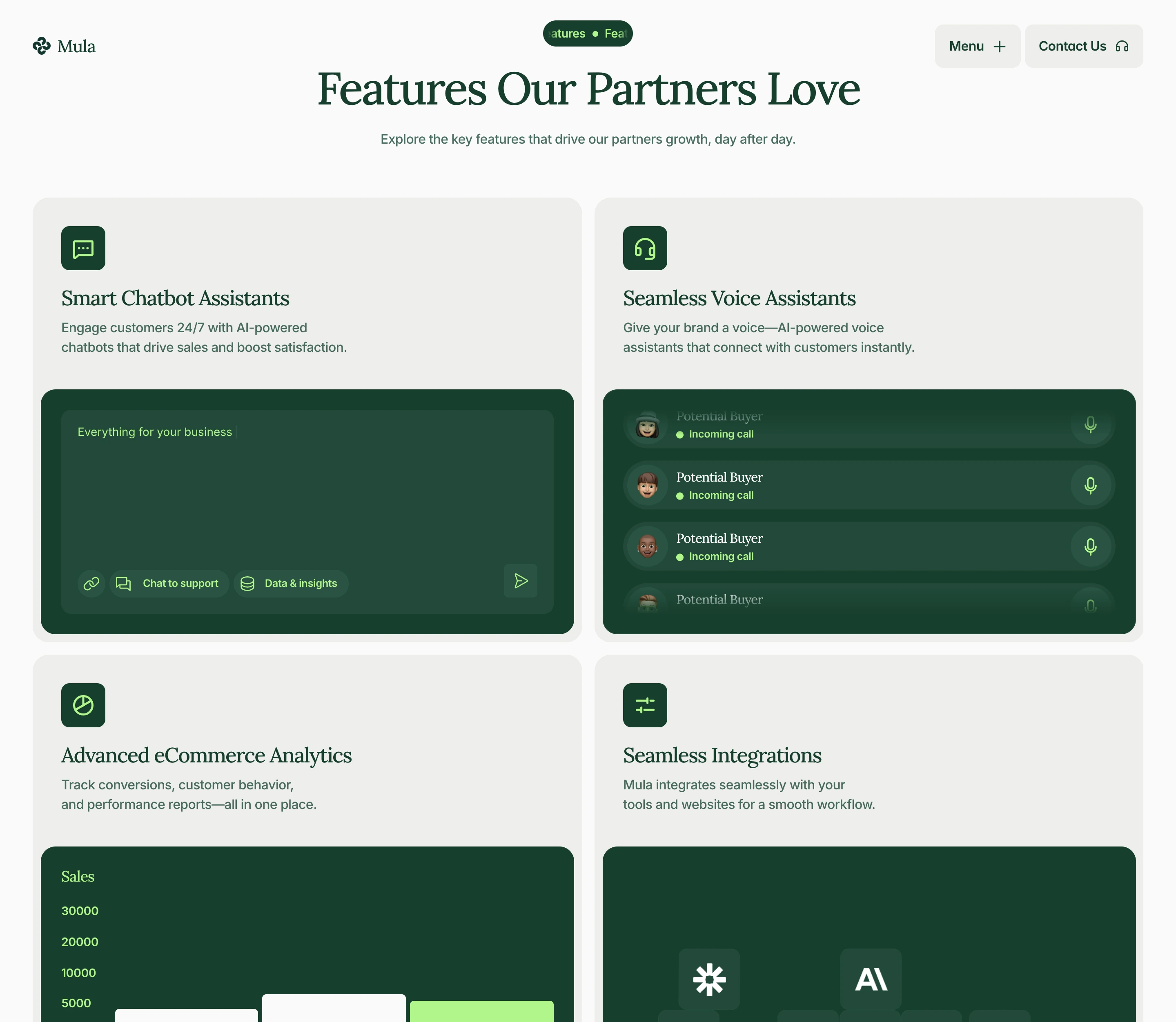 Mula needed a sleek, conversion-focused website to showcase its advanced AI agent and data analytics platform. We designed a bold, modern site that communicates innovation and intelligence — highlighting key features, use cases, and results. The design blends clean visuals with tech-inspired motion to reflect Mula’s cutting-edge capabilities and customer-first approach.