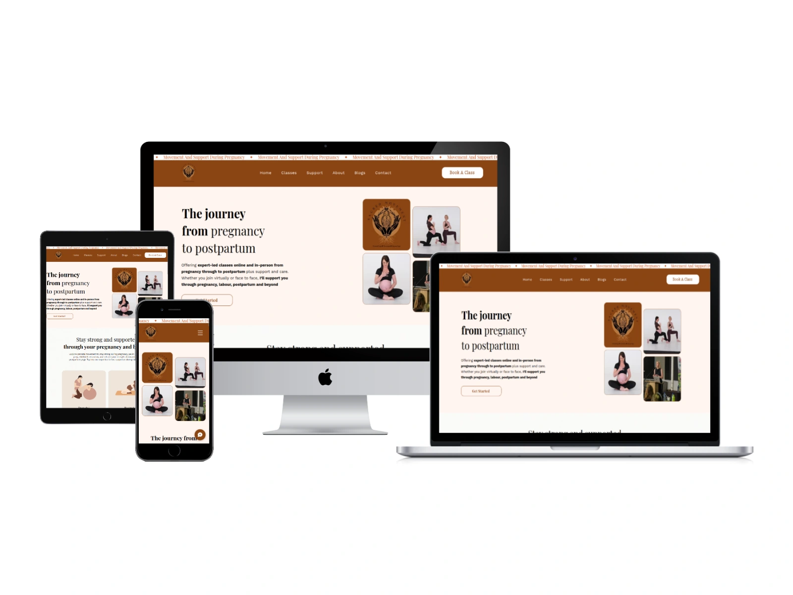 The website has two main flows: (1) in-person classes and events at the studio, and (2) online classes for remote participants. We structured and designed pages that clearly explain each service (prenatal community class, online prenatal, postnatal restoration, vinyasa, etc.), the instructor’s credentials, booking/pricing details, and a warm, welcoming visual style that aligns with the wellness focus.