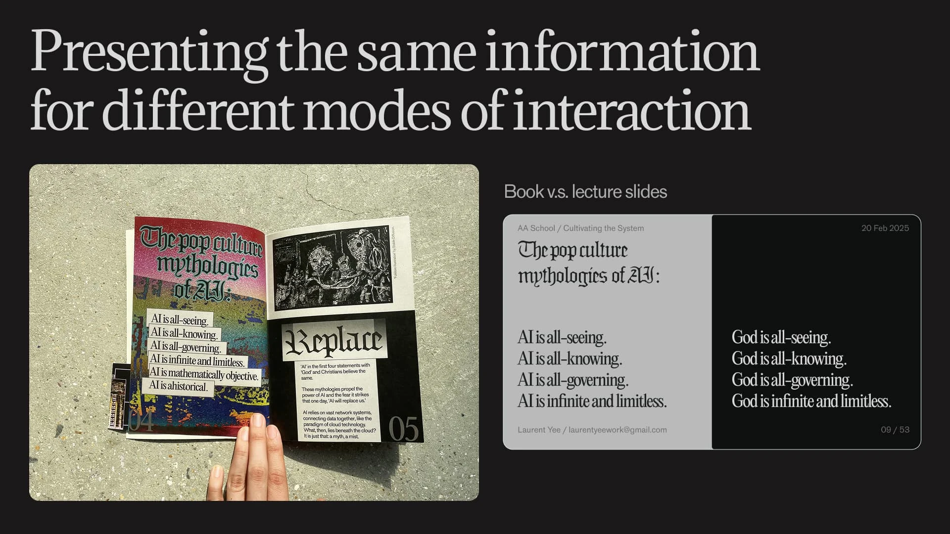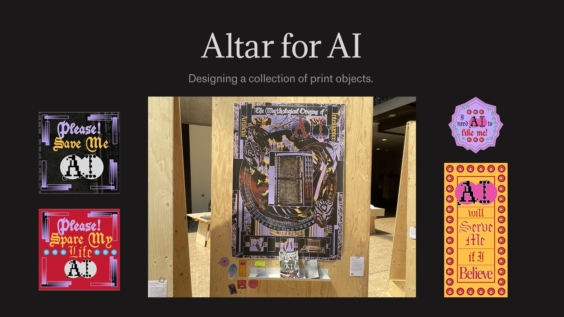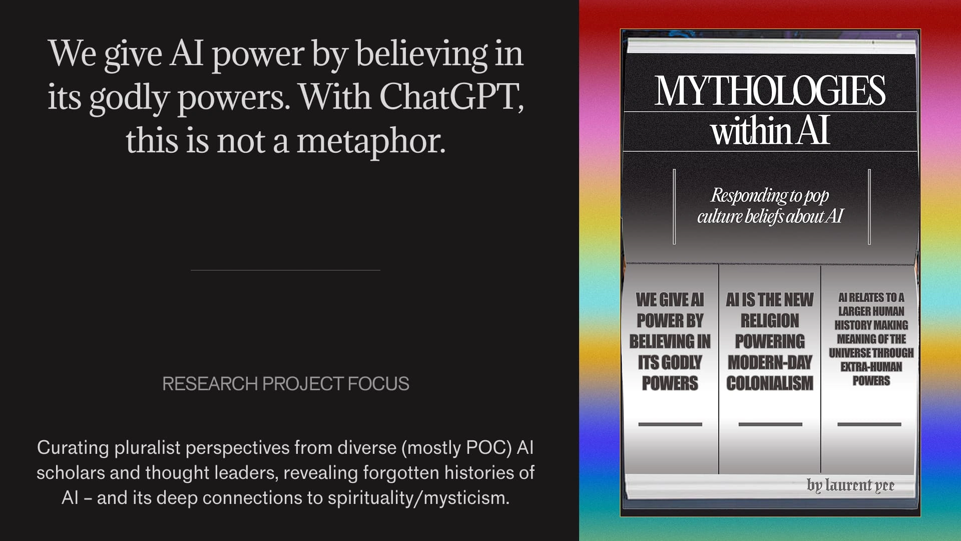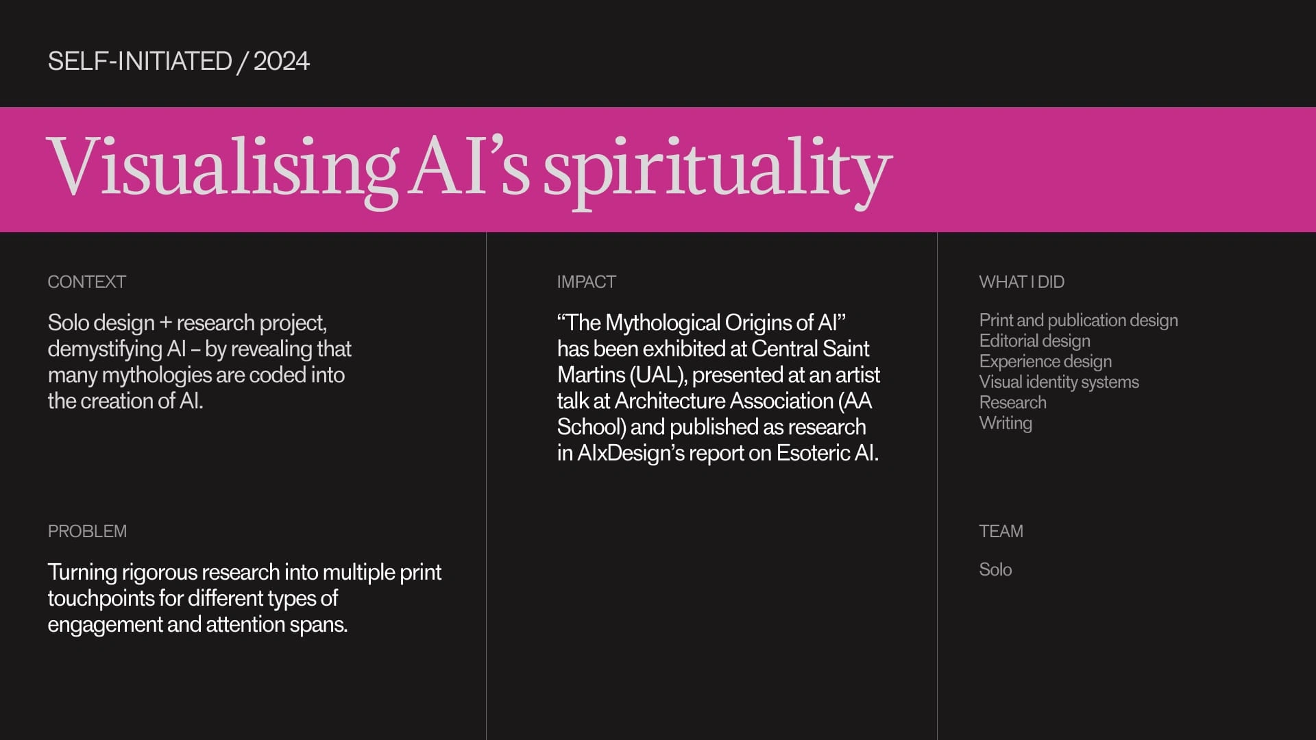 Solo design + research project, demystifying AI – by revealing that many mythologies are coded into the creation of AI.
