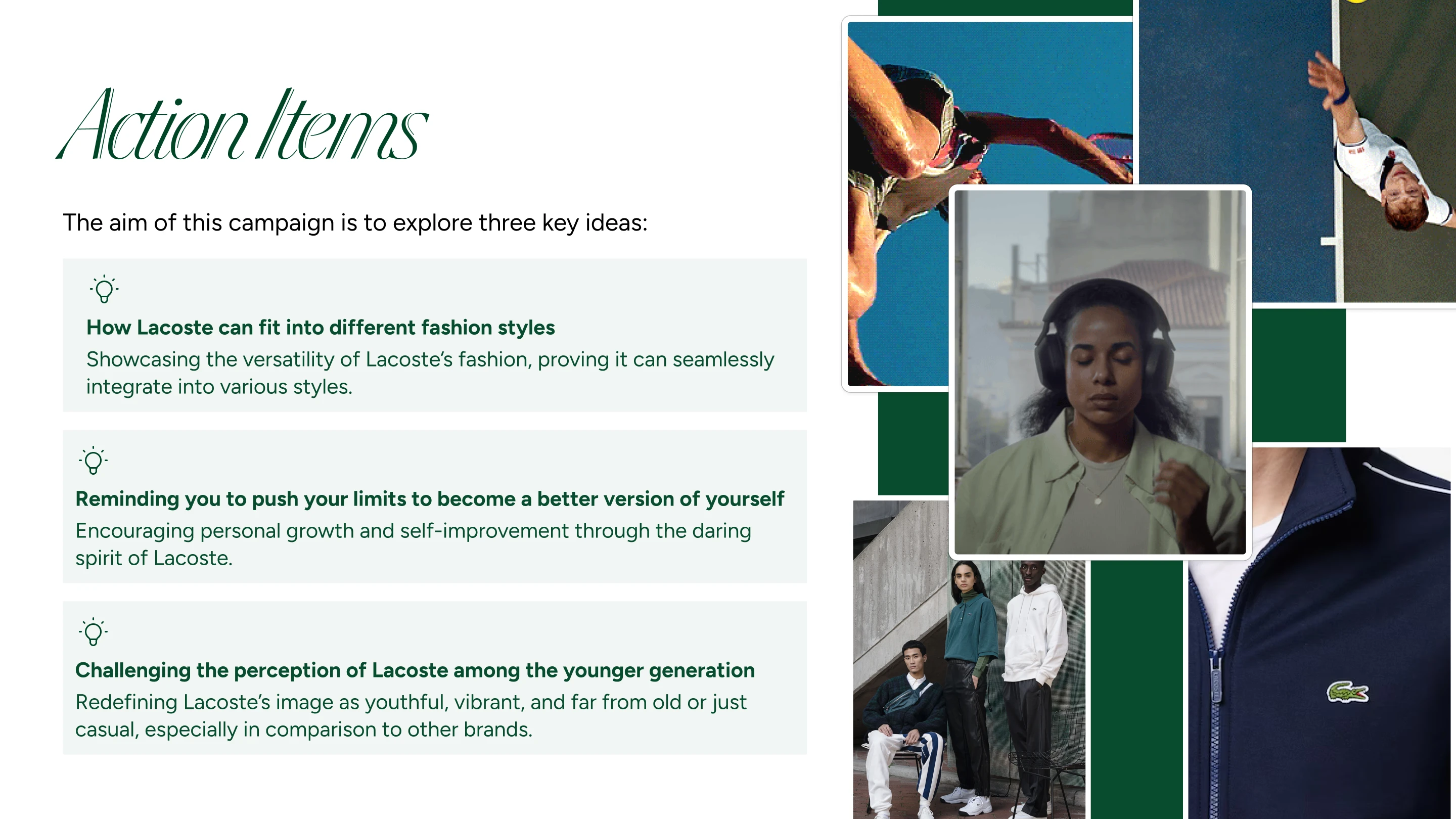 The result? A visually striking and campaign-ready concept deck that repositions Lacoste at the intersection of self-expression and sport, rooted in legacy but shaped for today’s audience.