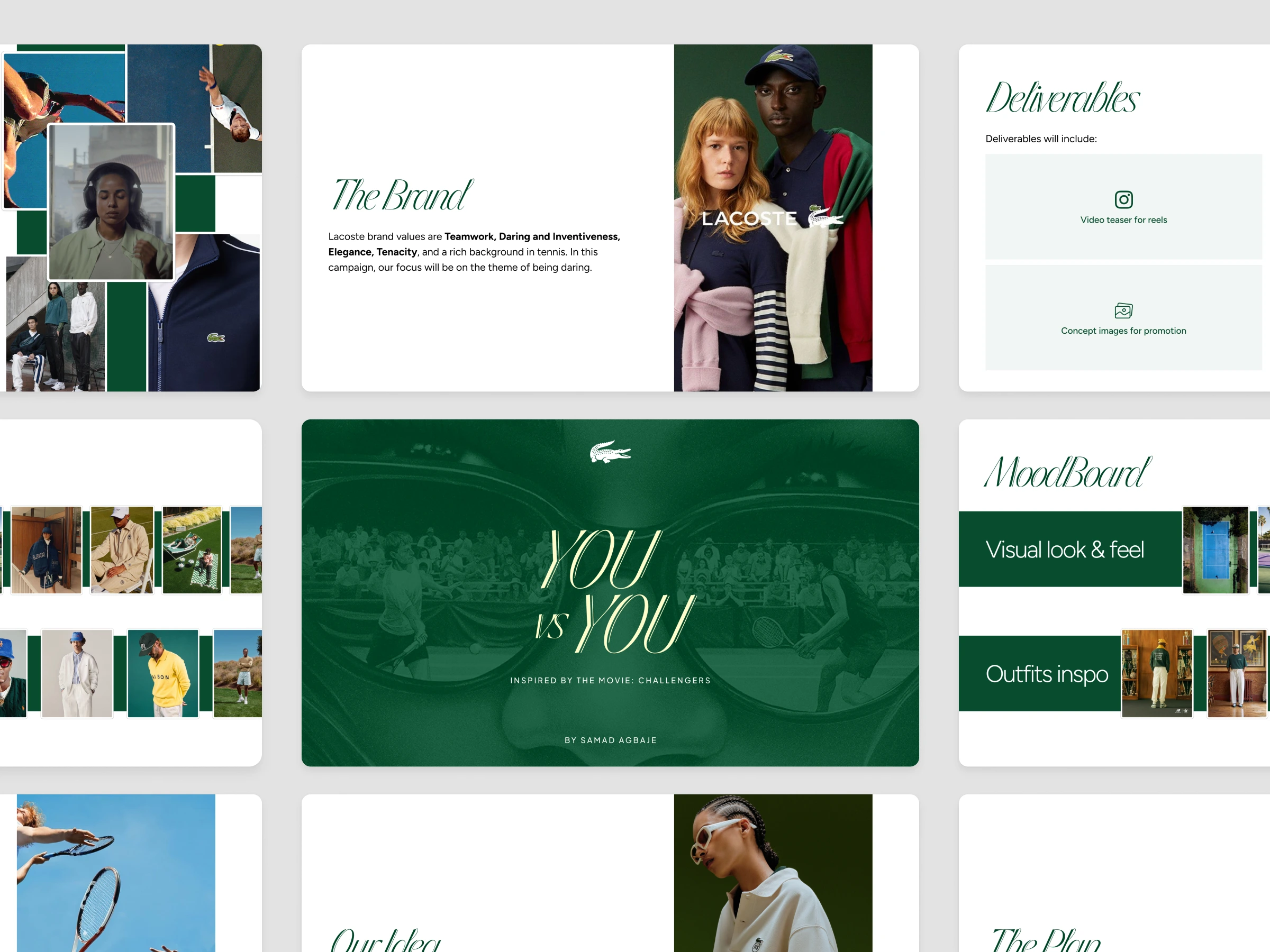 With the theme You vs You, I crafted a visual story that blends sport, fashion, and culture. The deck explores Lacoste’s values — daring, elegance, and tenacity — through stylized moodboards, outfit inspirations, and creative deliverables designed to resonate with a new generation.