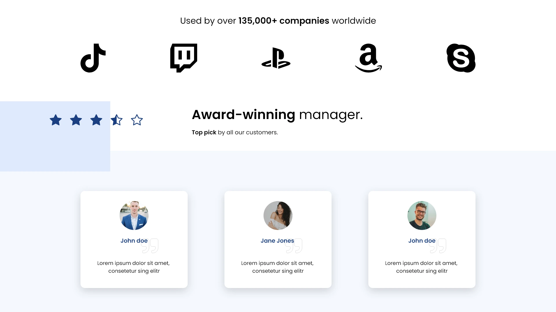 Social proof and testimonials section UI highlighting trusted brands, user ratings, and customer feedback to build credibility and trust.