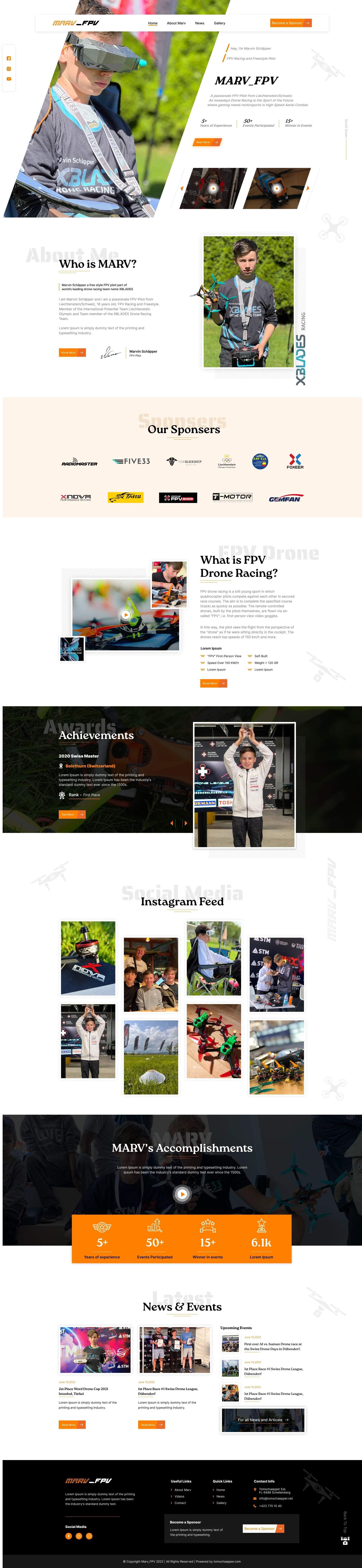 My Switzerland-based client, Tom, approached me to redesign a website for his 18-year-old son, Marvin Schäpper — a passionate FPV (First Person View) drone pilot. The main goal was to create a modern, engaging platform that showcases Marvin’s journey, passion, and achievements in the world of FPV drone racing.