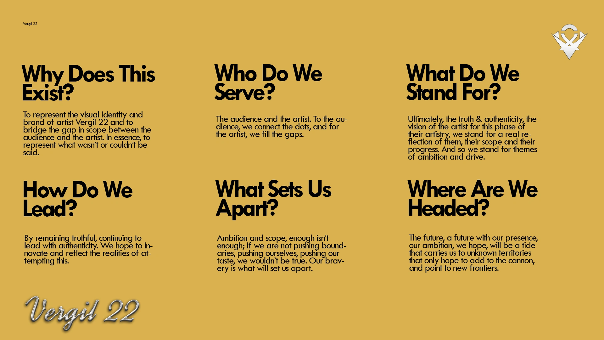 I created the logo and brand toolkit for the Vergil 22 brand. I had one objective, make it stand out, make it memorable, make it true to him. Take a look at how I it turned out!