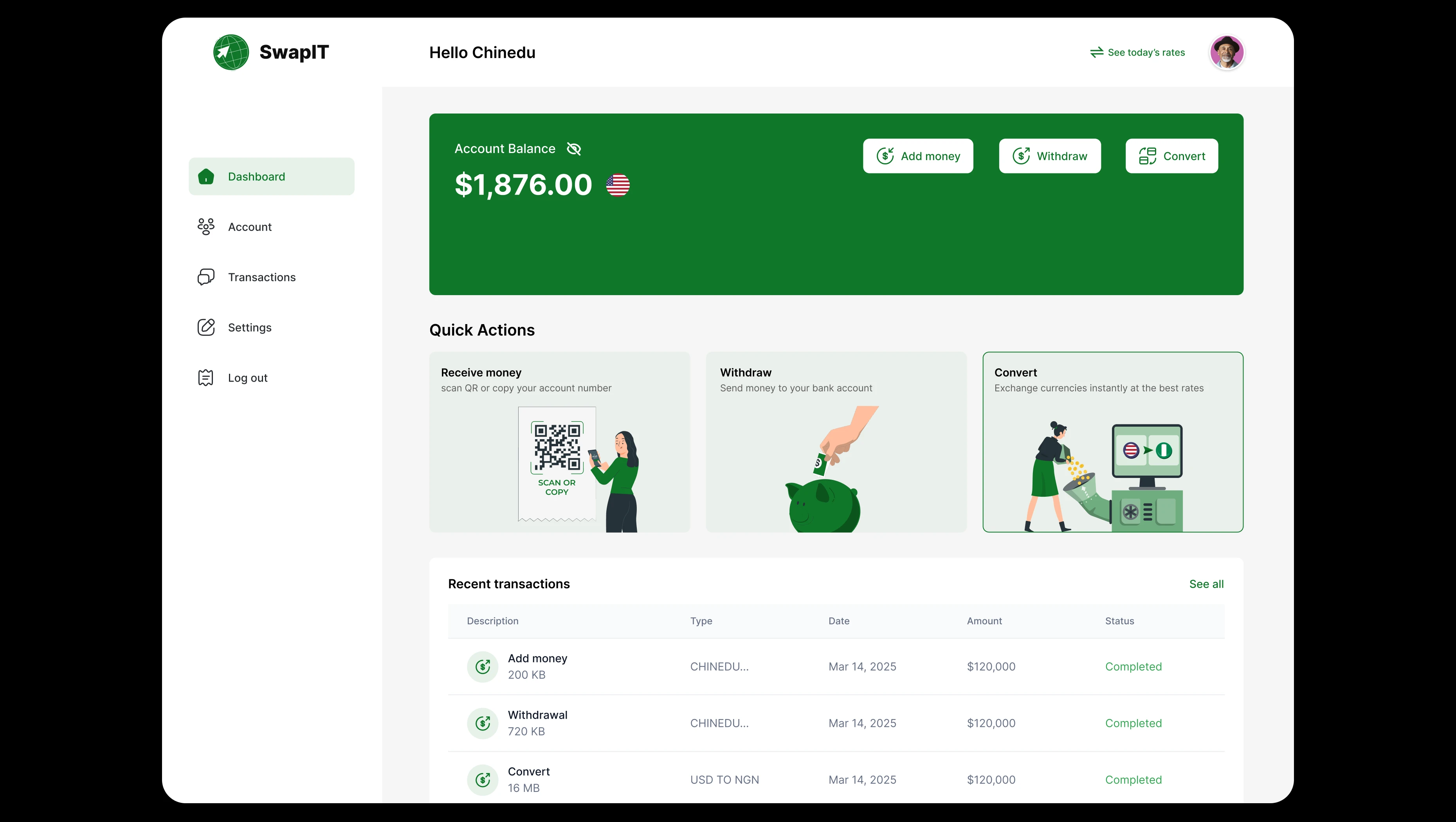 The final design offers a clean, modern, and easy-to-use experience that makes handling money across currencies feel natural and stress-free. Every part of the interface was thoughtfully designed to make actions like converting, withdrawing, and transferring funds simple and secure. It’s straightforward, fast, and built to give users confidence with every transaction bridging the gap between traditional banking and the new world of digital finance.
