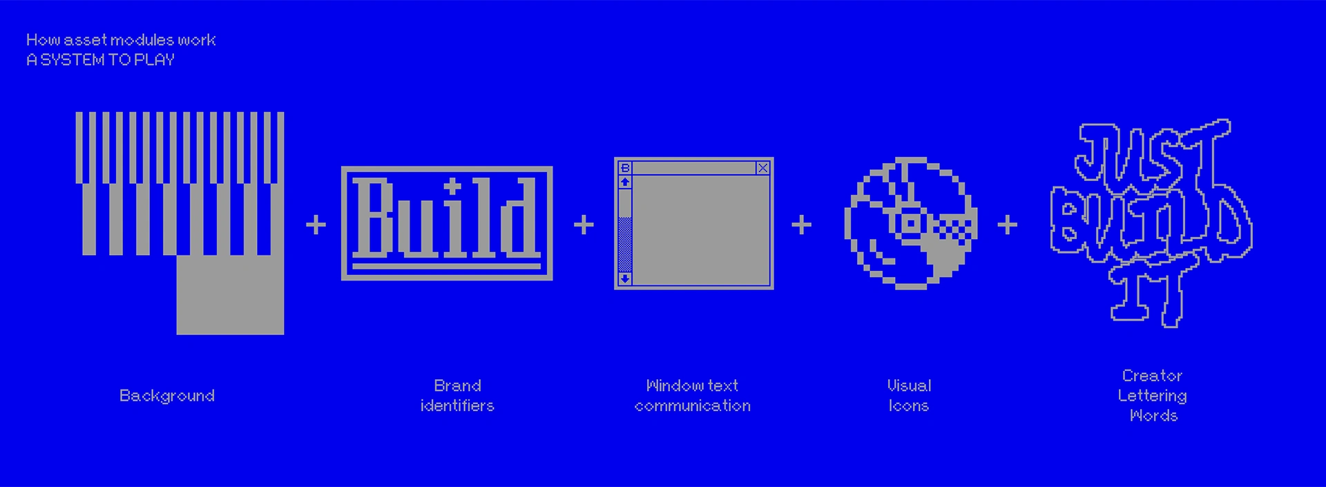 The identity embraces a retro aesthetic, drawn from old OS and built through modules that interact with each other to create dynamic systems.