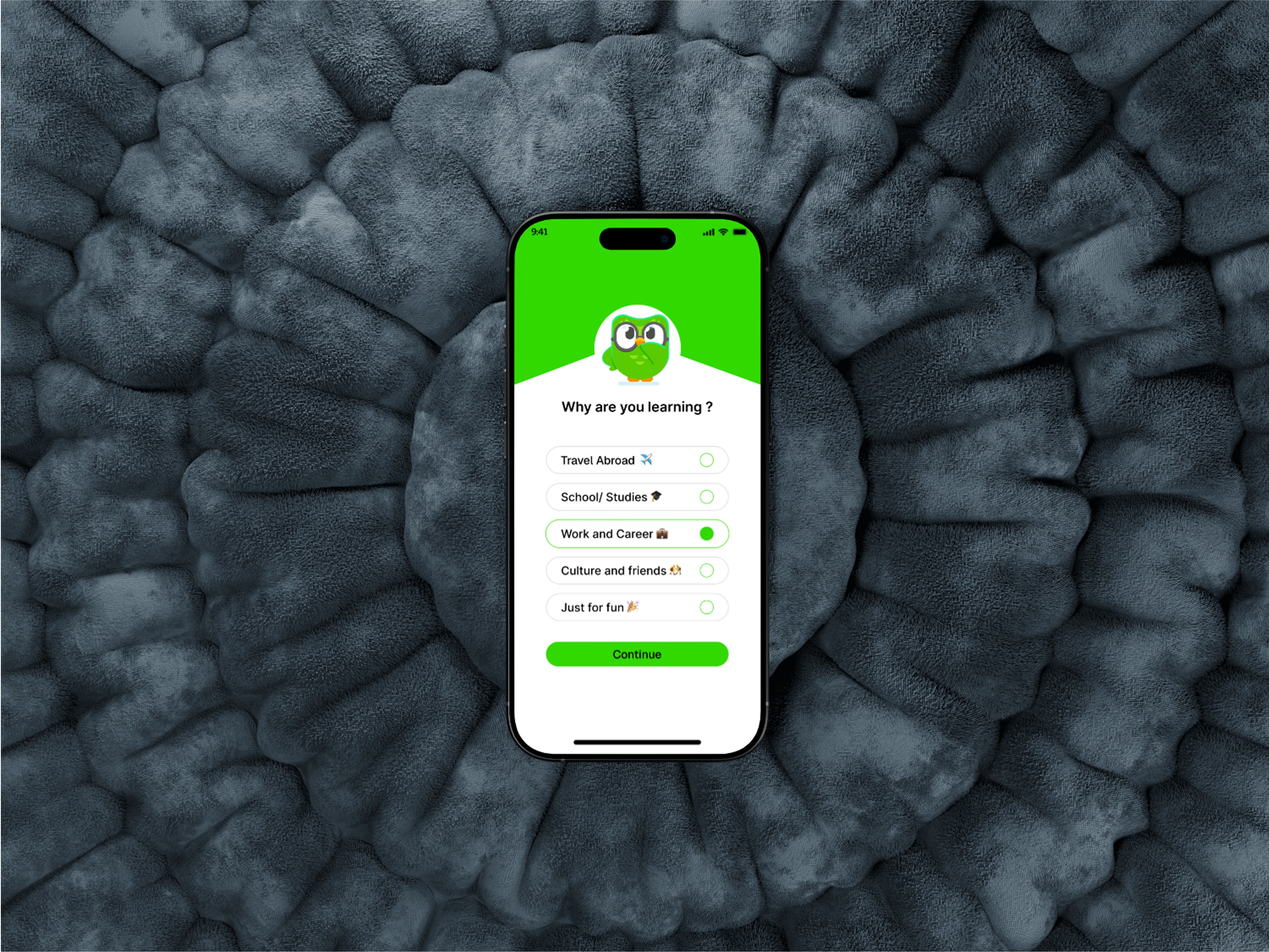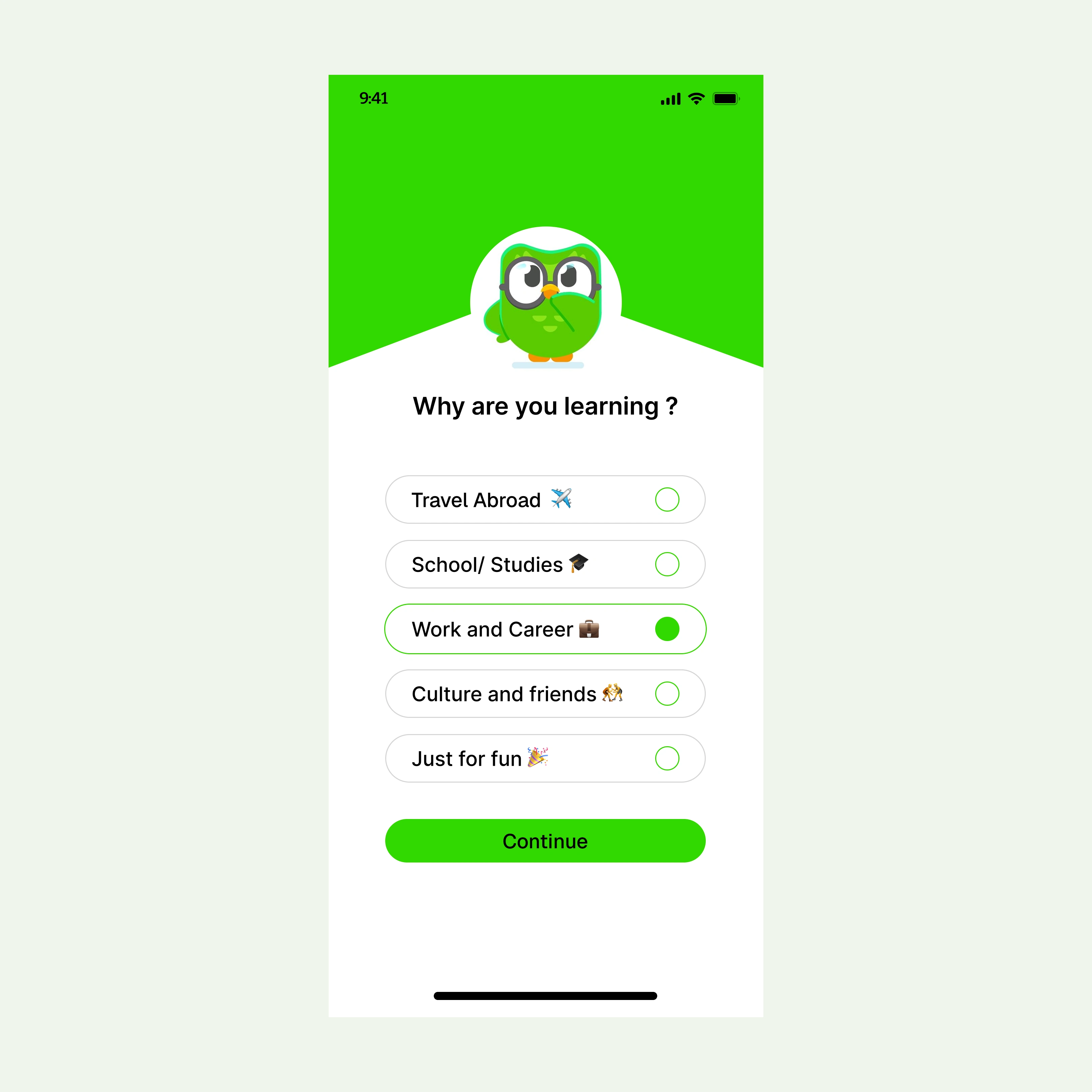 The onboarding flow was designed to feel welcoming yet purposeful. Users are guided through simple, visually engaging steps where they select their primary reason for learning, travel, school, work, cultural interest, or personal enrichment. Each choice connects to a tailored learning path, recommended exercises, and progress milestones.