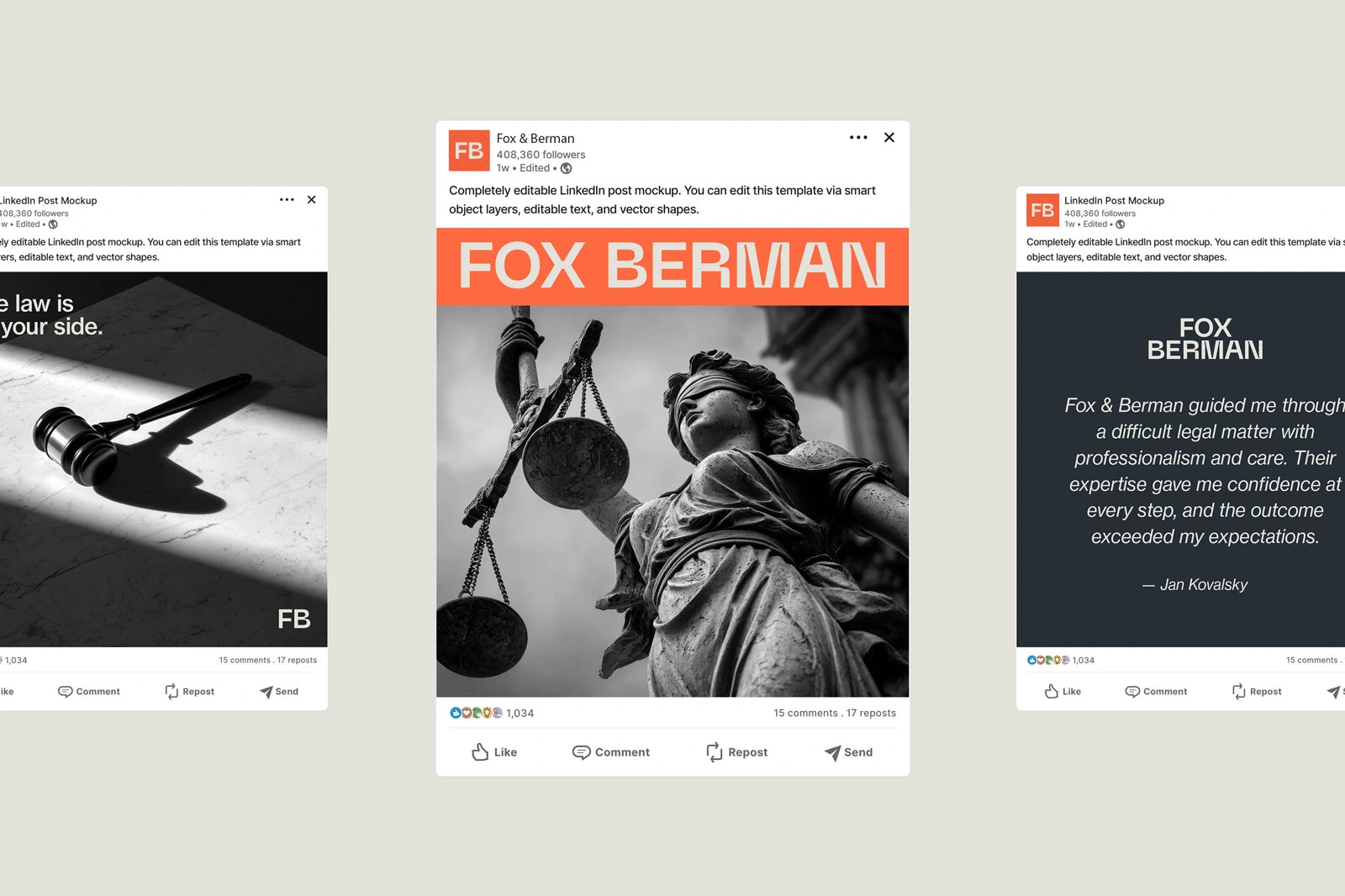 This cohesive brand system gives Fox Berman a strong visual presence—helping them stand out as a modern, credible law firm while maintaining the dignity of their profession.
