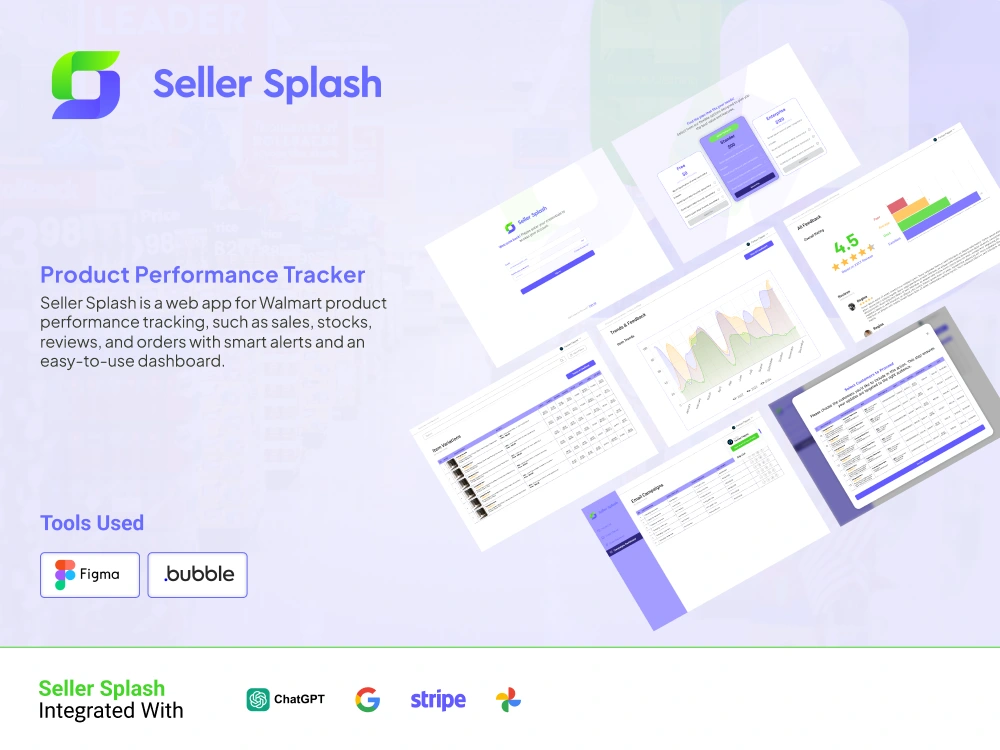 Seller Splash involved designing a Figma prototype for a Walmart product performance web app. It helps sellers monitor sales, stock, reviews, and orders through a unified analytics dashboard. The design also includes a technical assessment of building the complete platform on Bubble.