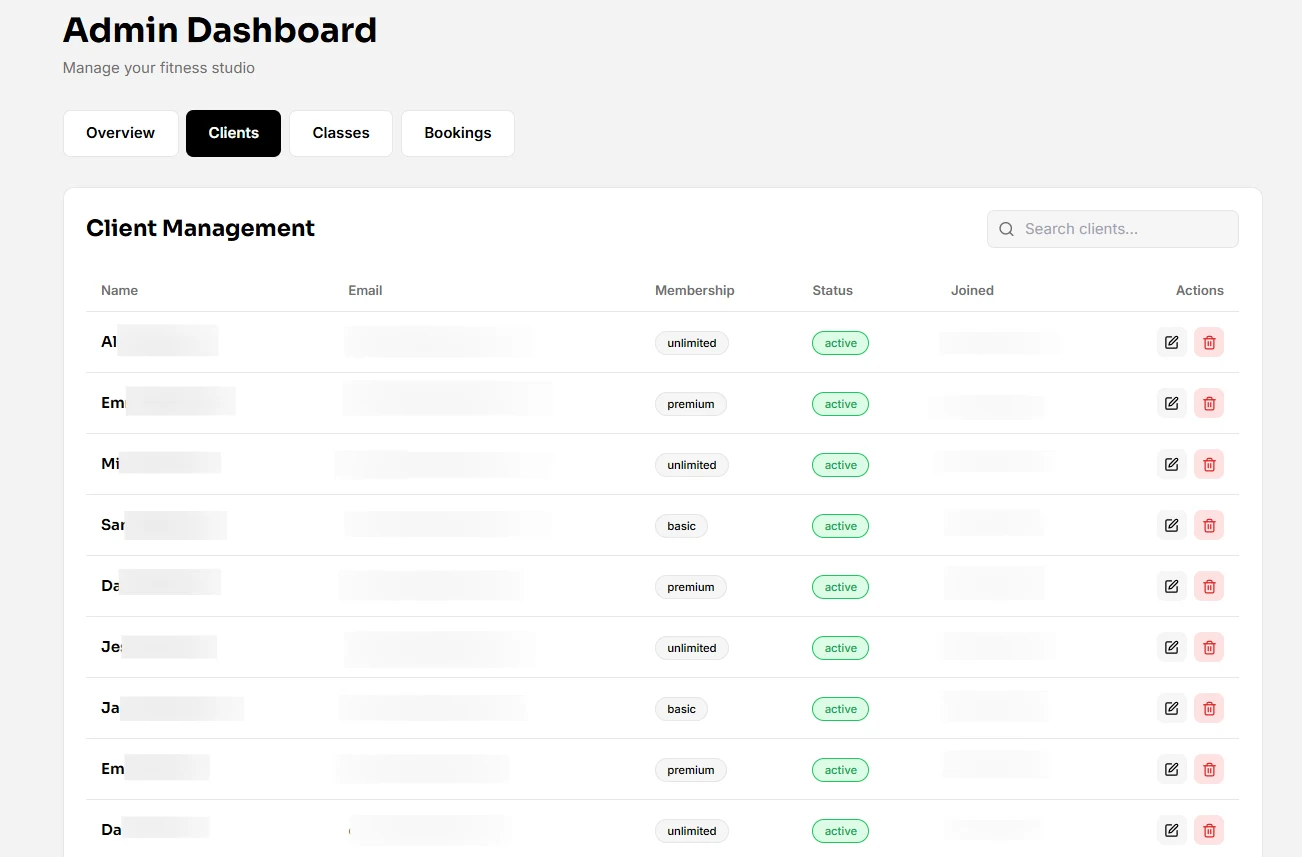 Admin dashboard to manage clients, classes, and bookings