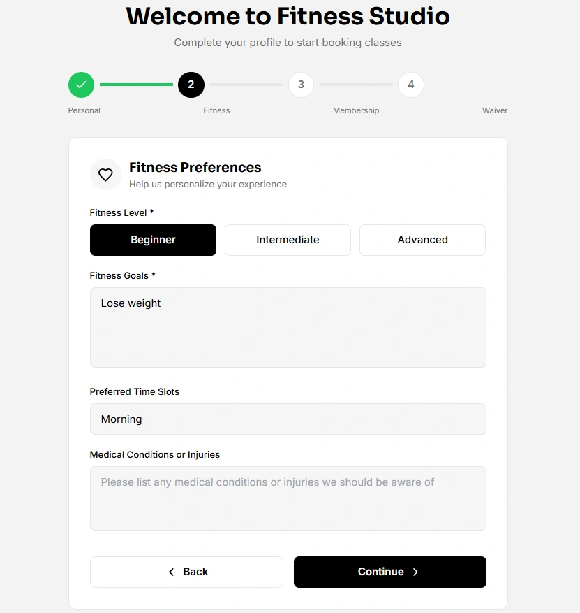 Multi-step onboarding form to collect client information and fitness preferences