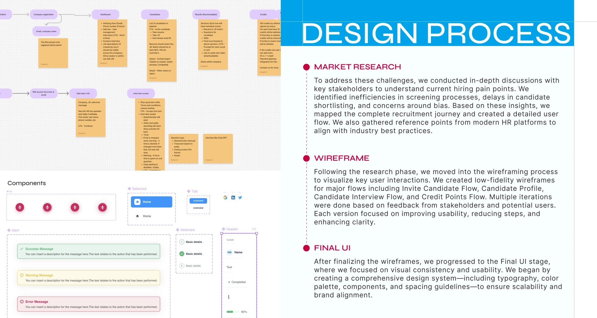 On the product side, we designed the full web app UI from ground up. Our process began with deep market research and user journey mapping, followed by low-fidelity wireframes for key flows: job posting, candidate management, interview evaluation, and credit points system. The final interface delivers clarity, structure, and speed, with a consistent component system and intuitive dashboard experience.