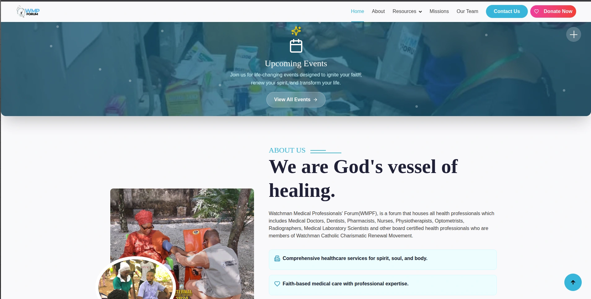 I developed a comprehensive, high-performance web platform for the Watchman Medical Professionals’ Forum (WMPF), the medical arm of the Watchman Catholic Charismatic Renewal Movement. The goal was to create a digital home that bridges the gap between professional healthcare expertise and faith-based community outreach.
