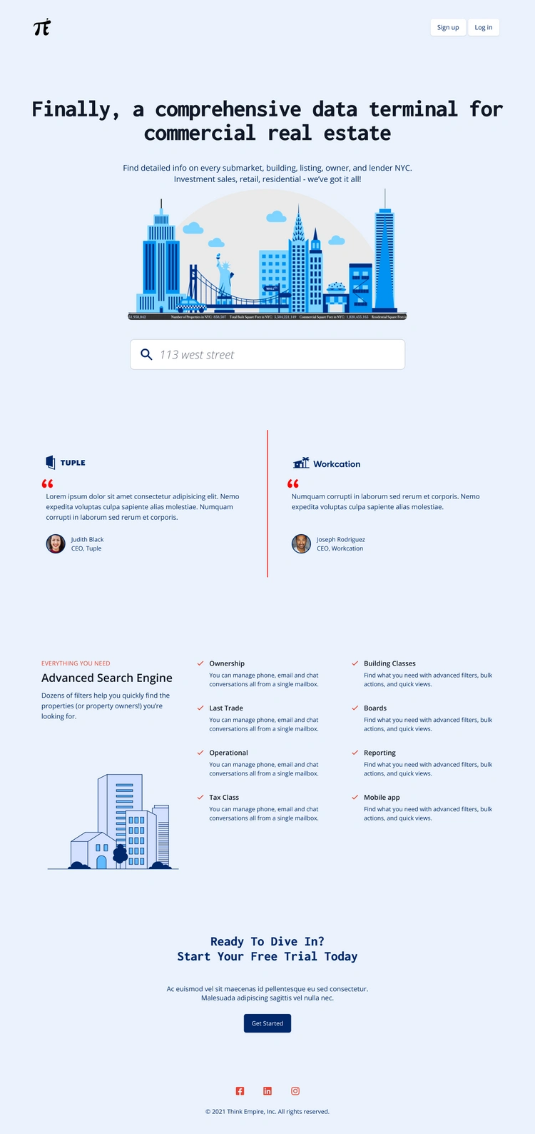 STRENGTHS: This page is much more visually appealing. I enjoy the search under an inspirational quote, and how you're able to search for various things (e.g. addresses, zip codes, neighborhoods) with this search (as opposed to only an address). I also love the airy, lighthearted feel the illustrations bring to the site features. Additionally I appreciate how it is not long-winded in explaining the functionality, but rather instantly draws users to engage. Even though we are a paid product, we also need to quickly draw in users to actually use the platform.
