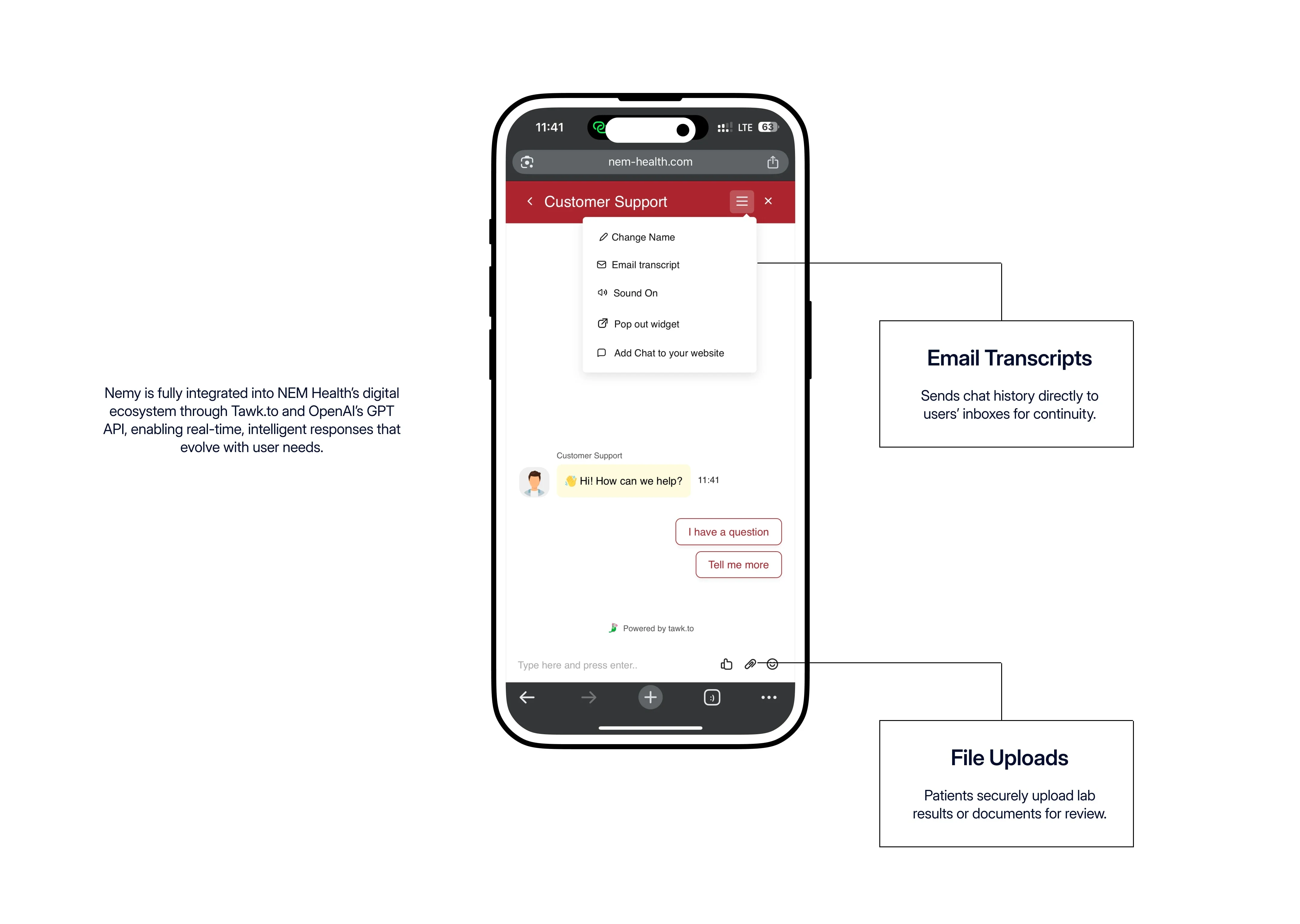 Nemy set out to make healthcare more human through intelligent, empathetic conversations. Built for NEM Health, Nemy is an AI-powered healthcare assistant that helps users get instant answers, book appointments, upload files, and continue past chats, all in one seamless, caring experience.