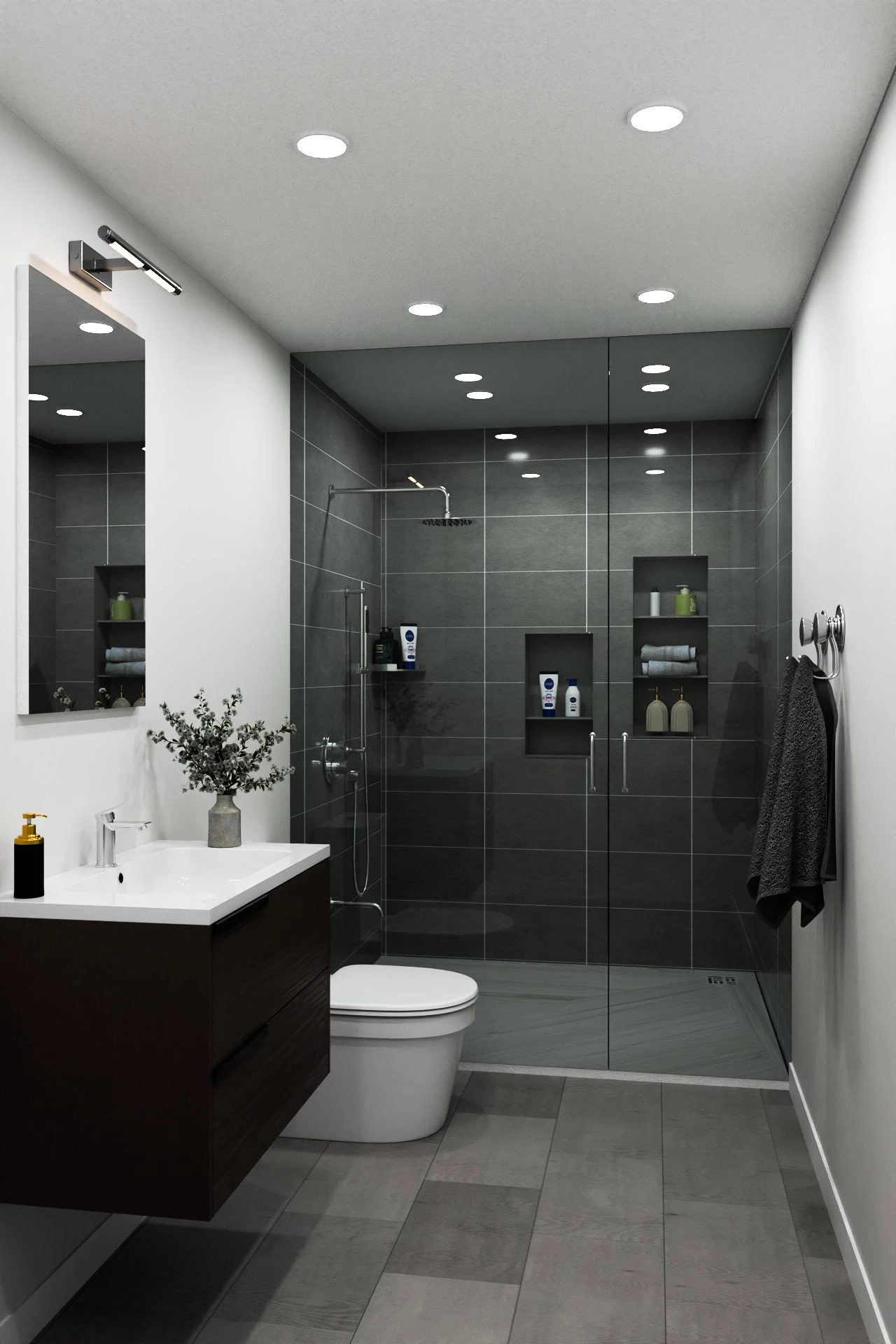 Modern bathroom with a sleek gray theme, glass shower, and dark grip tile floor for a stylish, safe, and contemporary spa-like vibe.