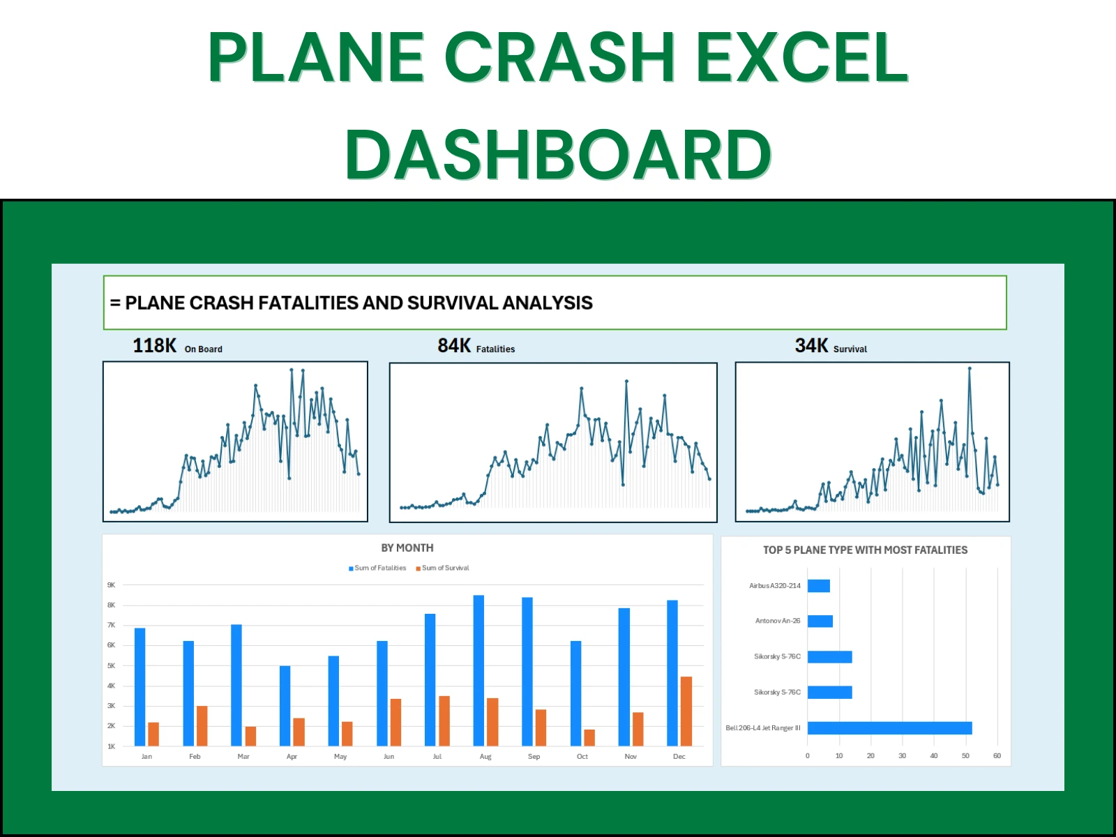 Designed an Excel dashboard analyzing 3K+ plane crashes using pivot tables and formulas to extract survival trends and fatality insights.