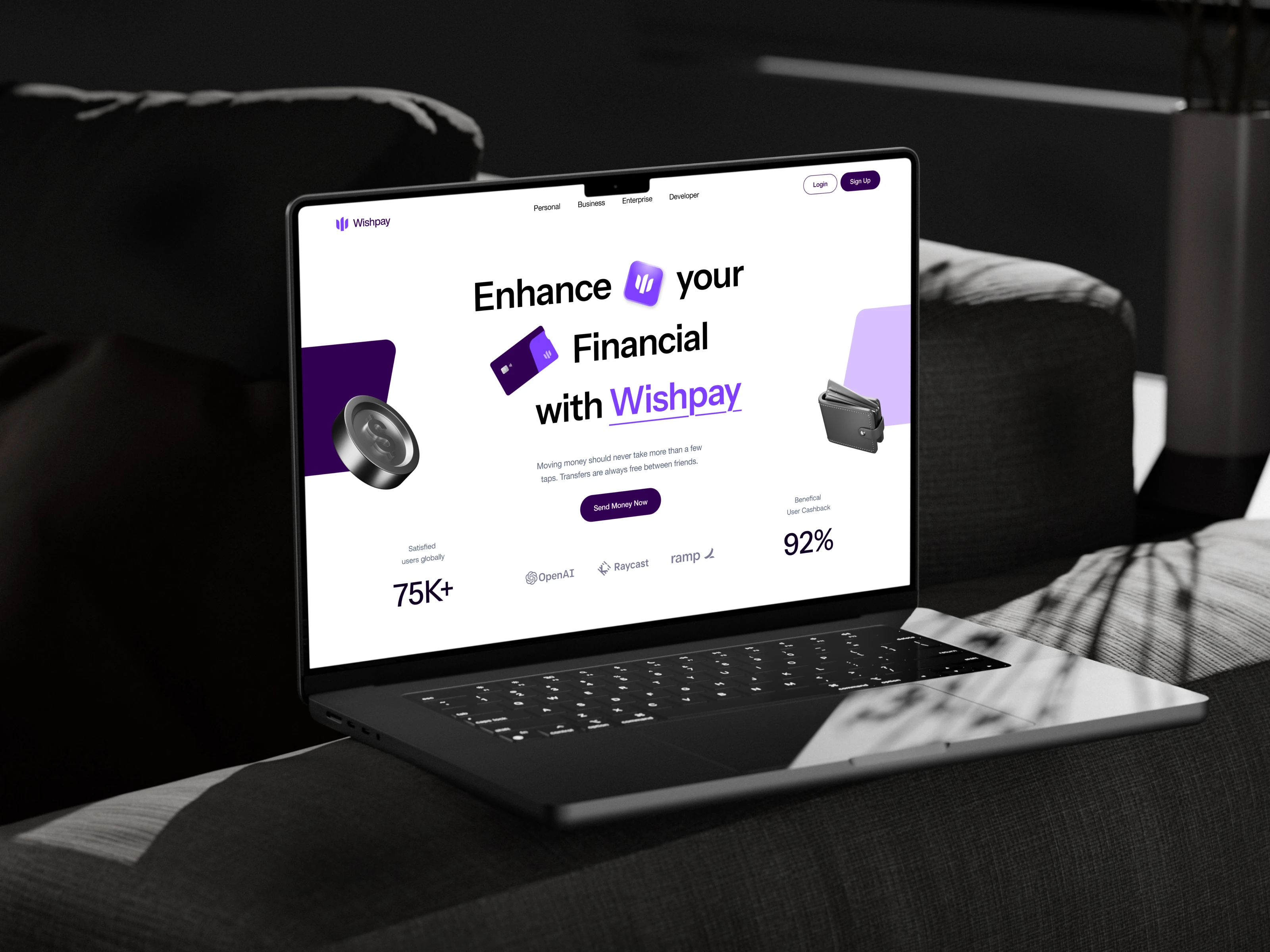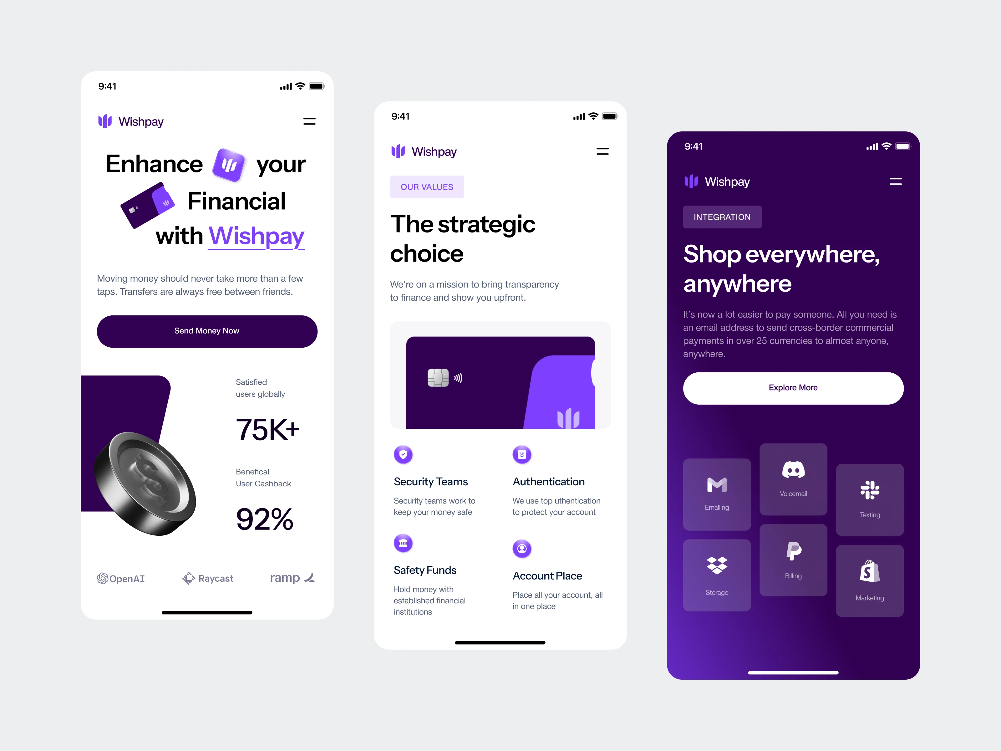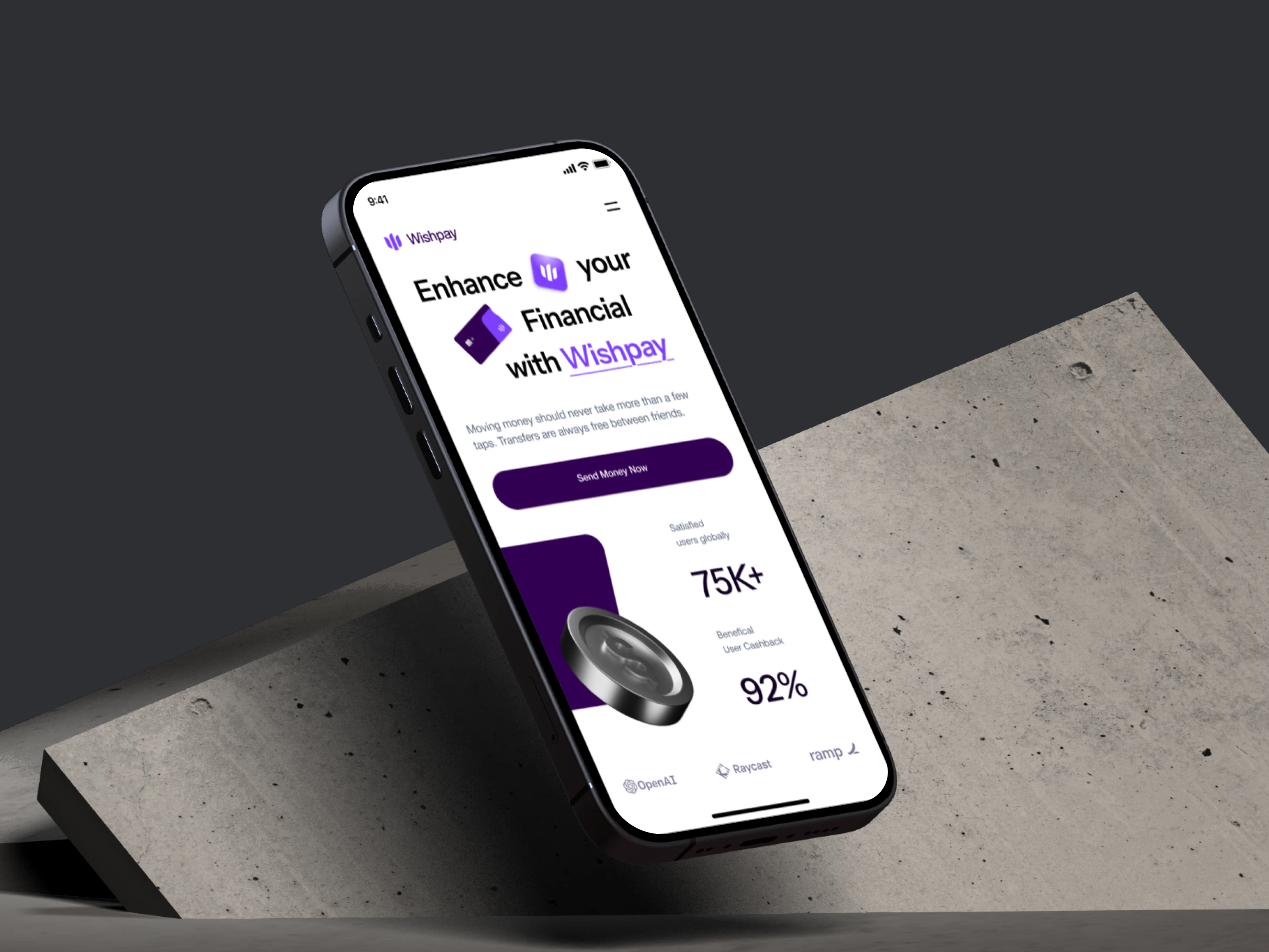 A sleek and modern finance landing page called Wishpay designed for the next generation of digital banking with a seamless user experience.